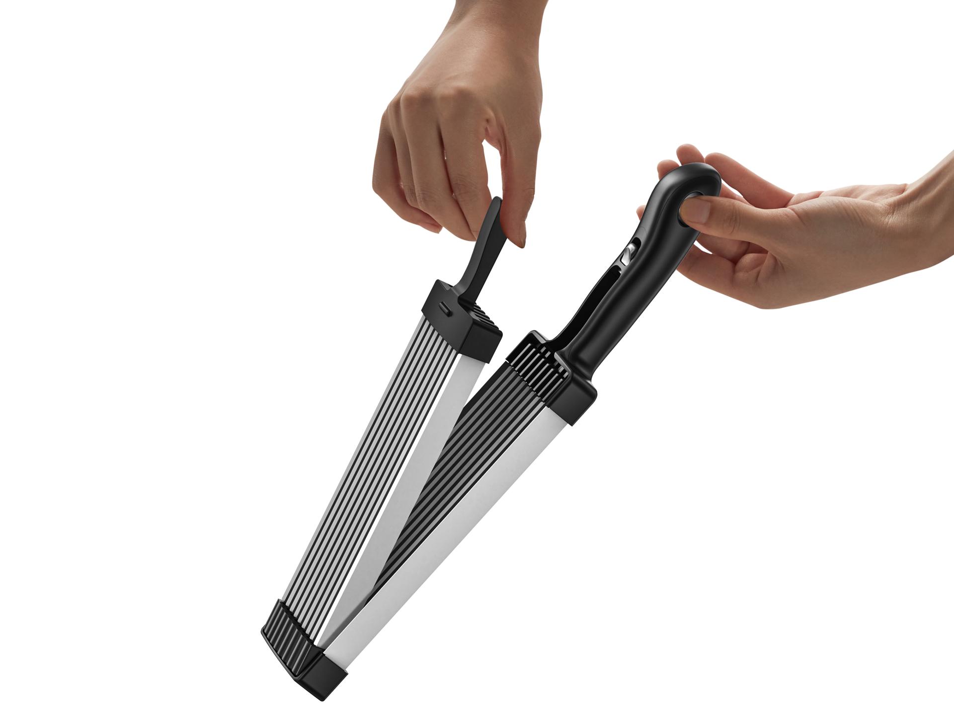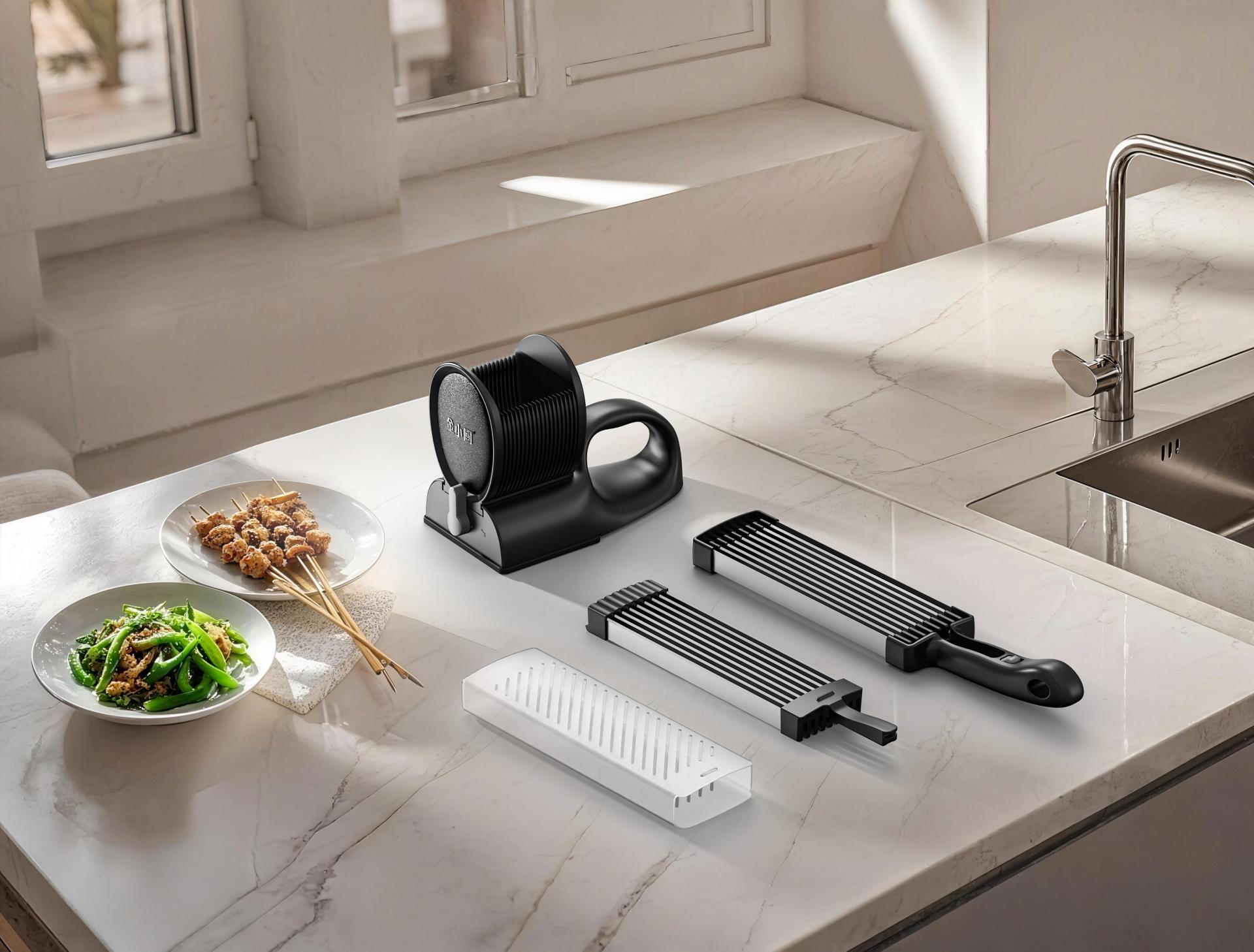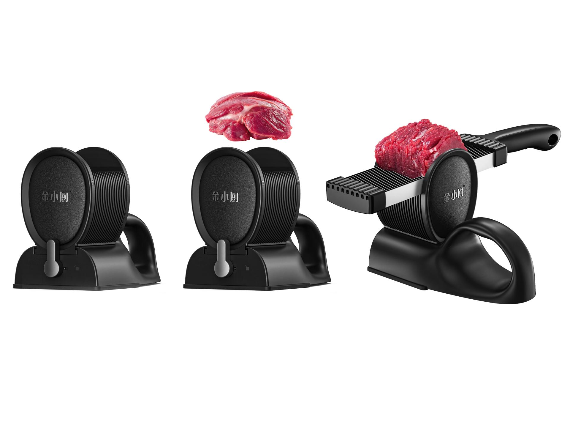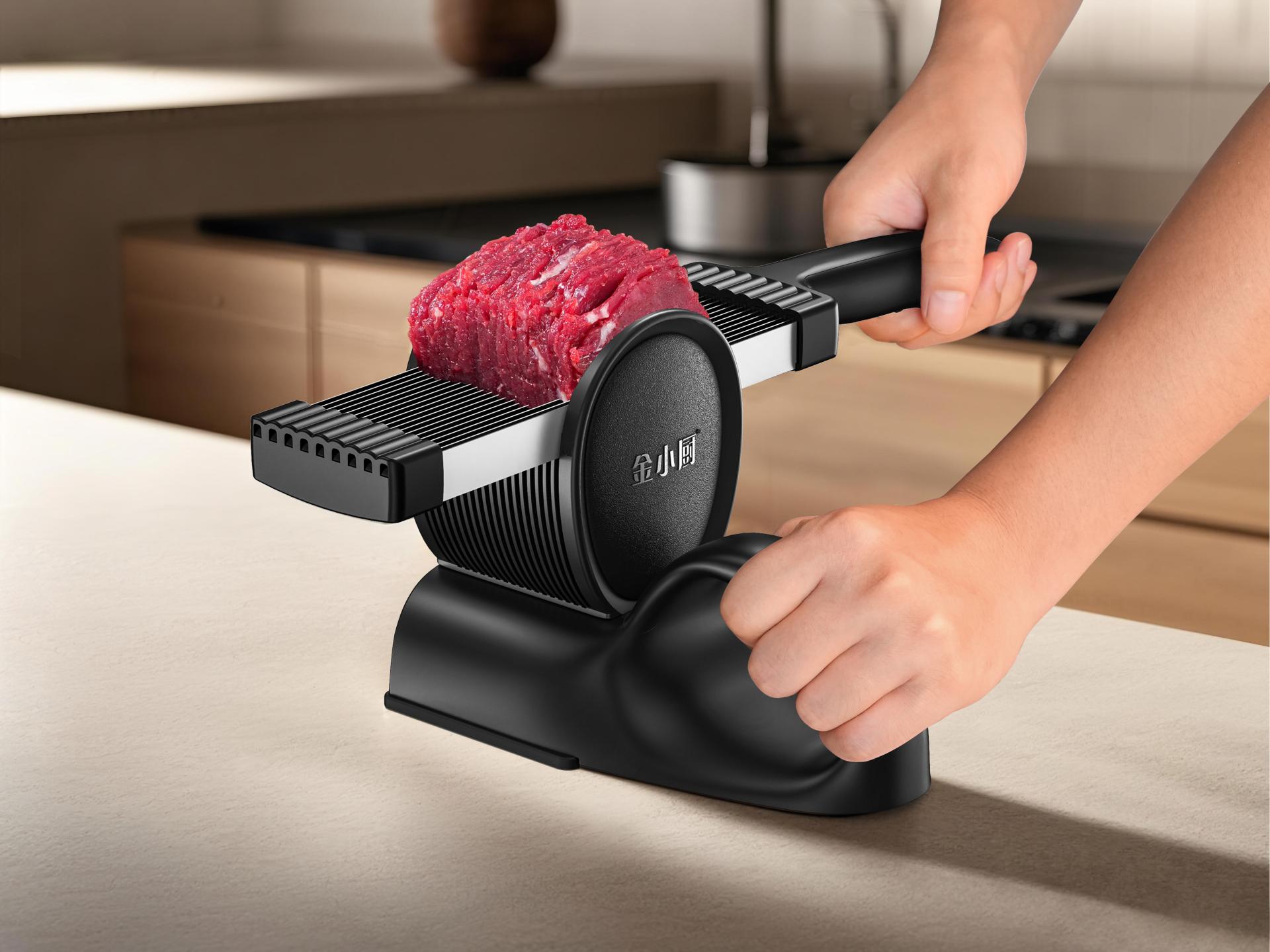 Embracing the principle that “form follows function,” the design incorporates an oval-shaped meat tray, precisely engineered for optimal alignment between blades and slots. Its smooth, oval silhouette not only enhances ease of use but also contributes to a clean, approachable aesthetic. The base features an ergonomically curved handle that ensures a stable grip and efficient force application, enhancing both user comfort and cutting efficiency.
