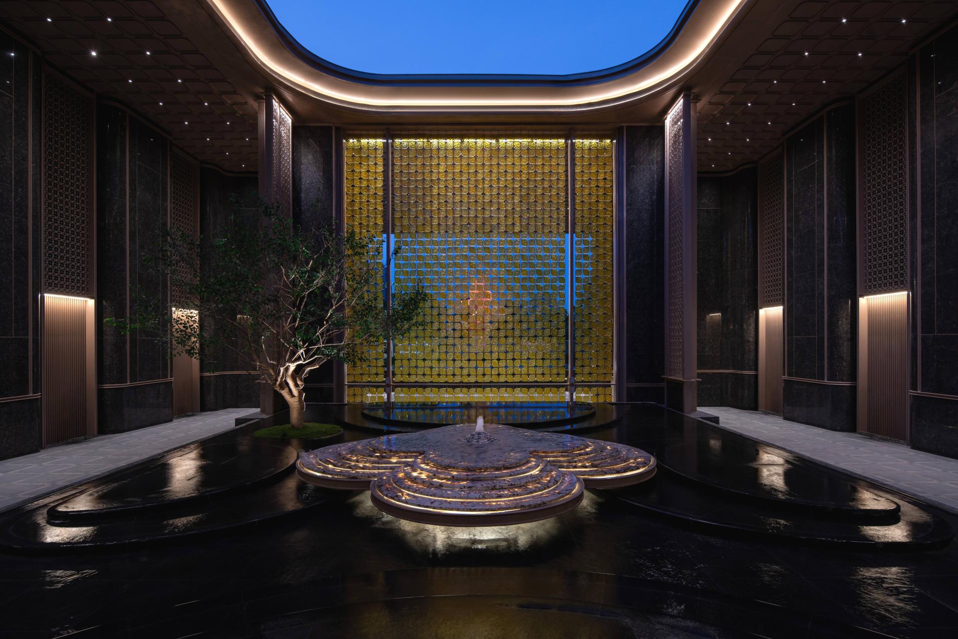 In the central courtyard, cascading water terraces mimic a long scroll of mountains and rivers, while an 800㎡ sunken water feature creates a floating forest islet—where four-season landscapes merge with the rustle of water and dance of light.