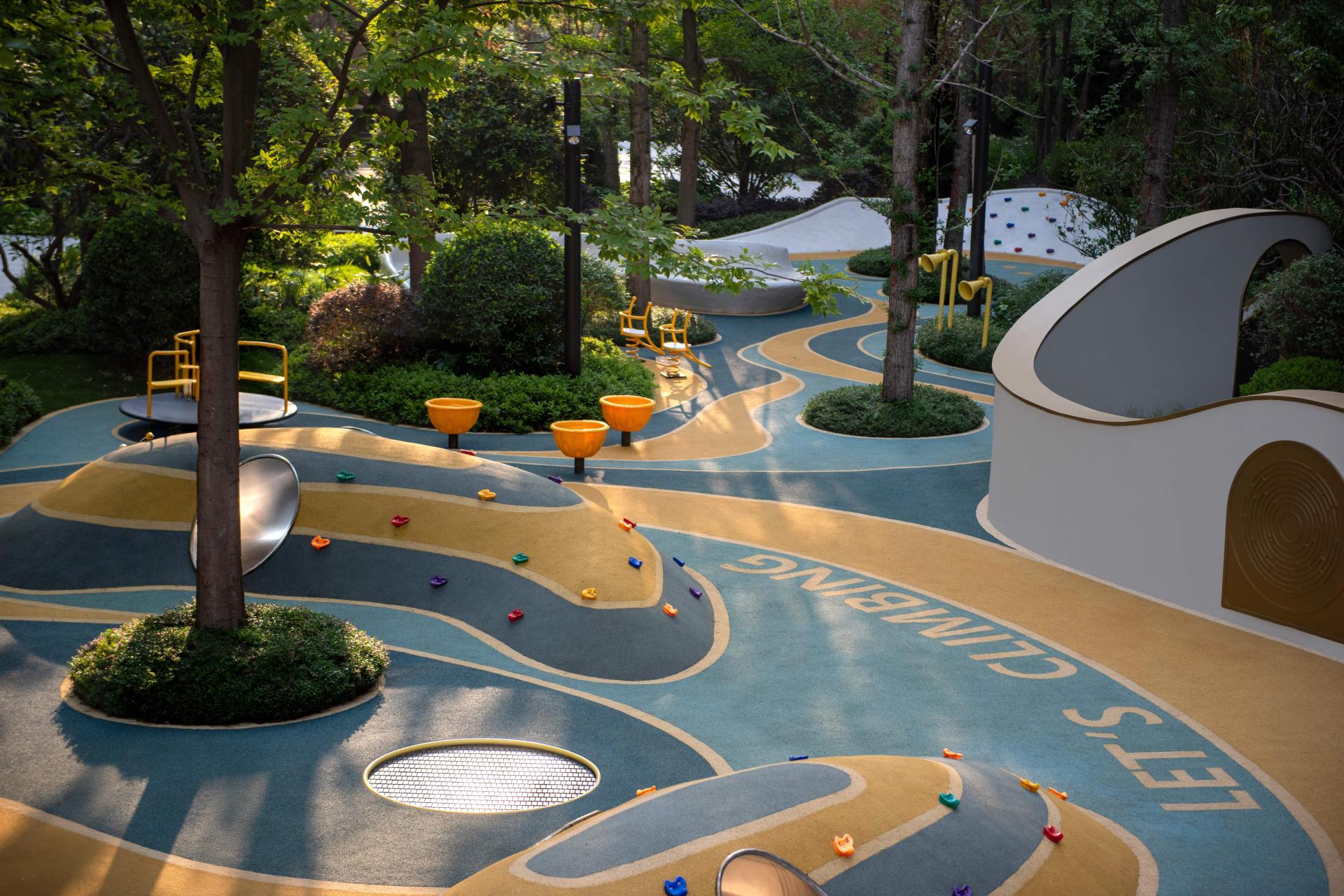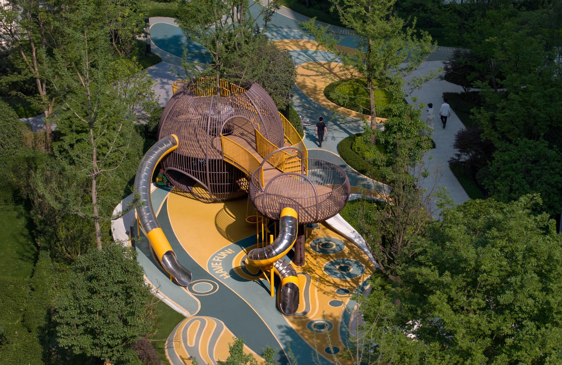 The Children's Playground in the South Garden extracts curvilinear patterns from Shu brocade to create dynamic activity spaces; the North Garden, through modular fitness gardens, farming plots, and healing gardens, interweaves the textures of nature with daily life.