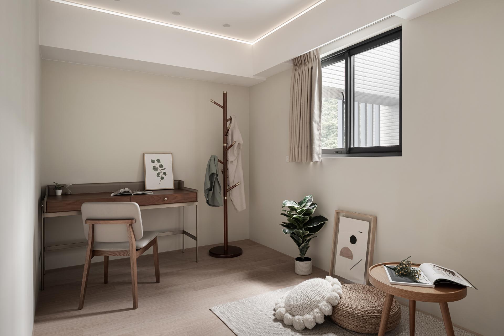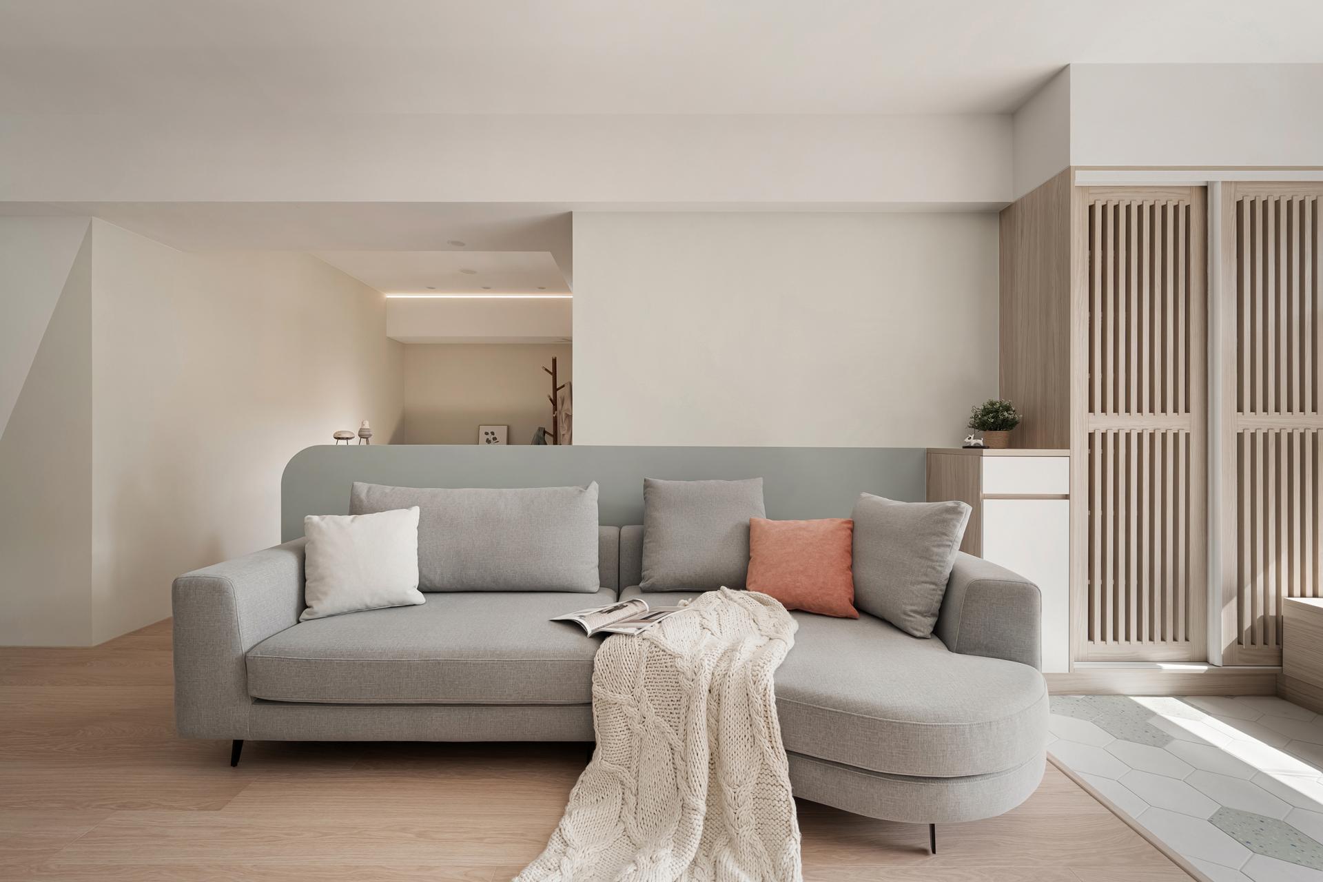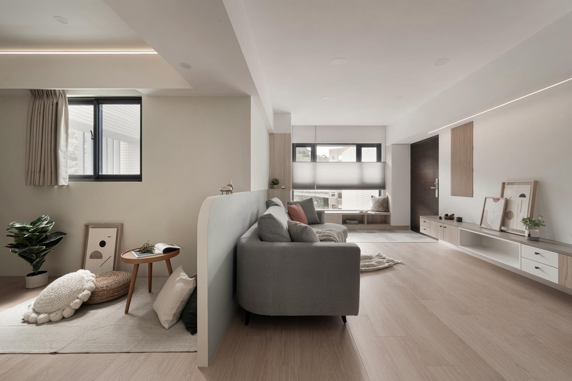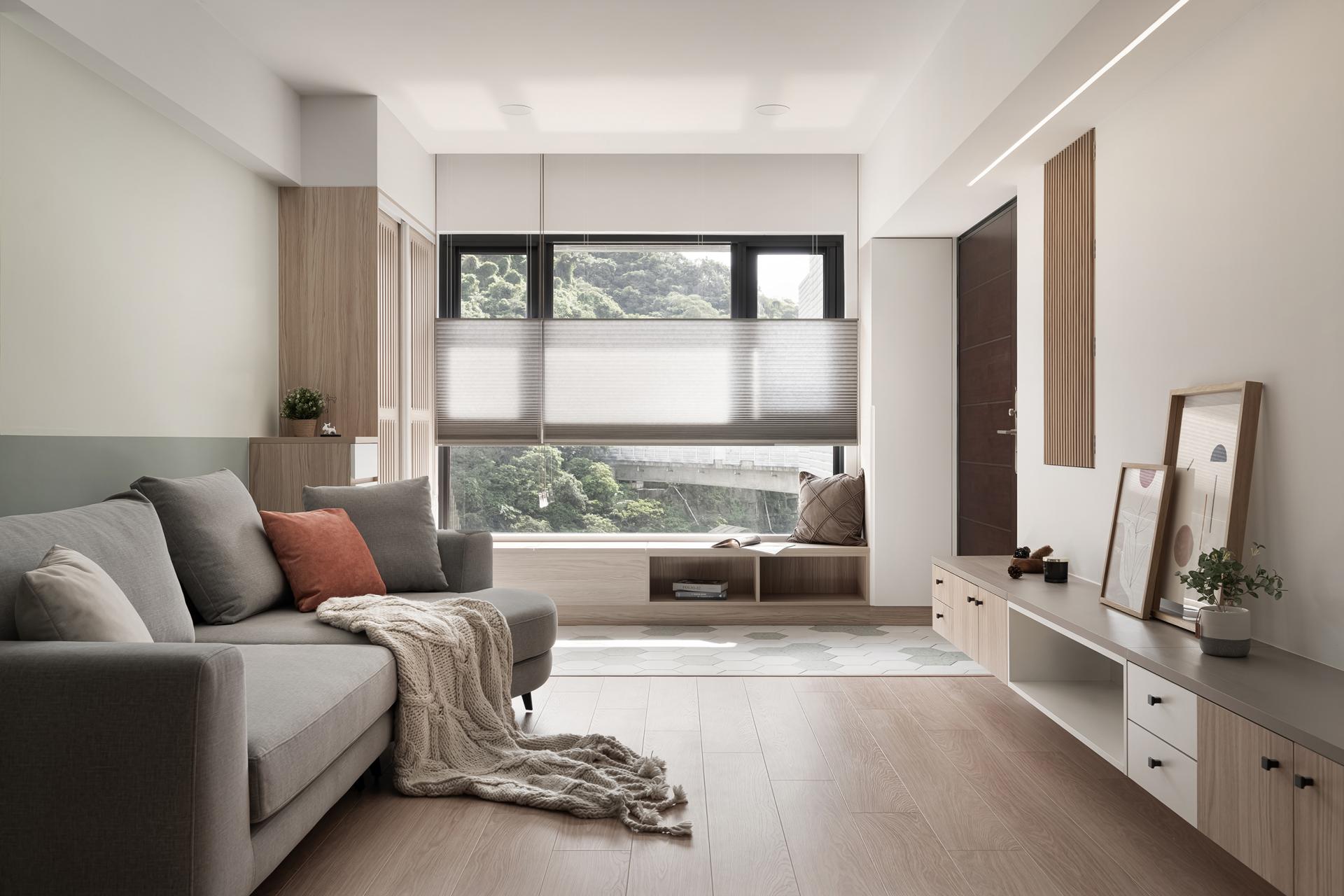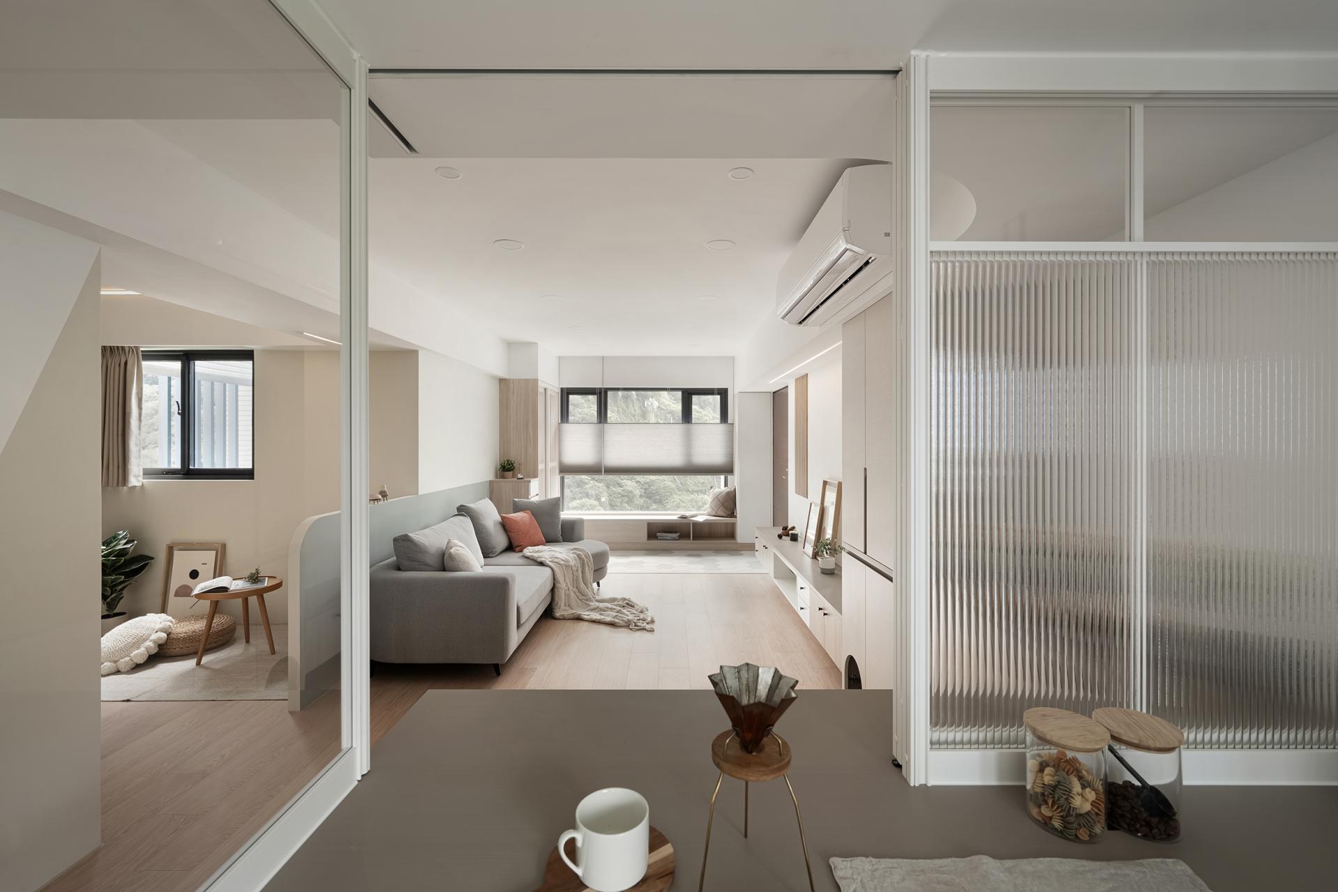 Built on a hillside, the design blends Nordic minimalist aesthetics with Eastern concepts of negative space, harmonizing with the mountain views and the greenery outside the windows to create a rhythmic living environment. Upon entering the interior, white and green hexagonal tiles form the entrance floor, seamlessly connecting with light-colored wooden flooring, creating a fresh first impression. The grille sliding door shoe cabinet integrates a laundry area design, while the shoe bench adopts a daybed design, incorporating storage functionality. This design preserves ample natural light in the public areas while meeting the daily needs of the household.