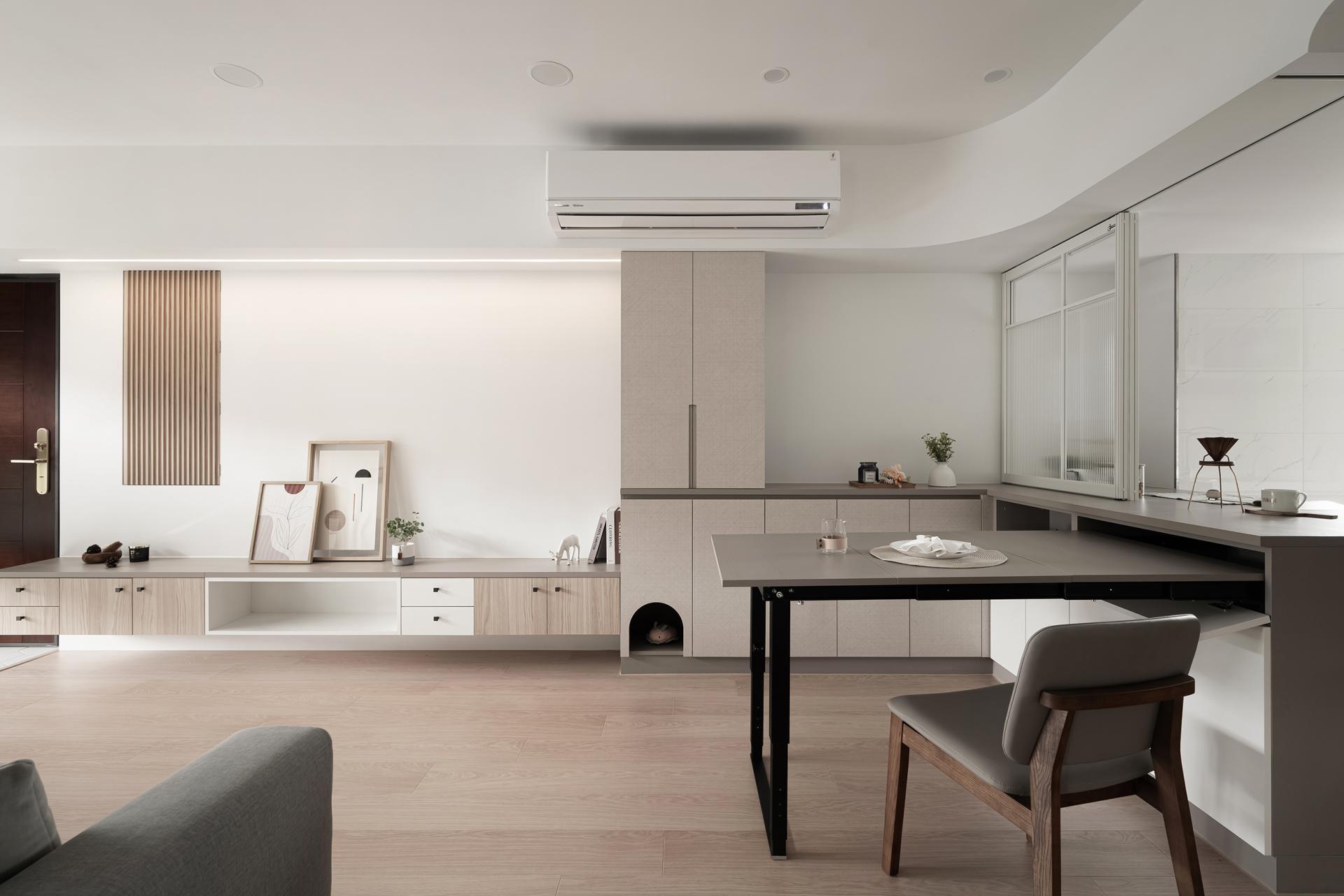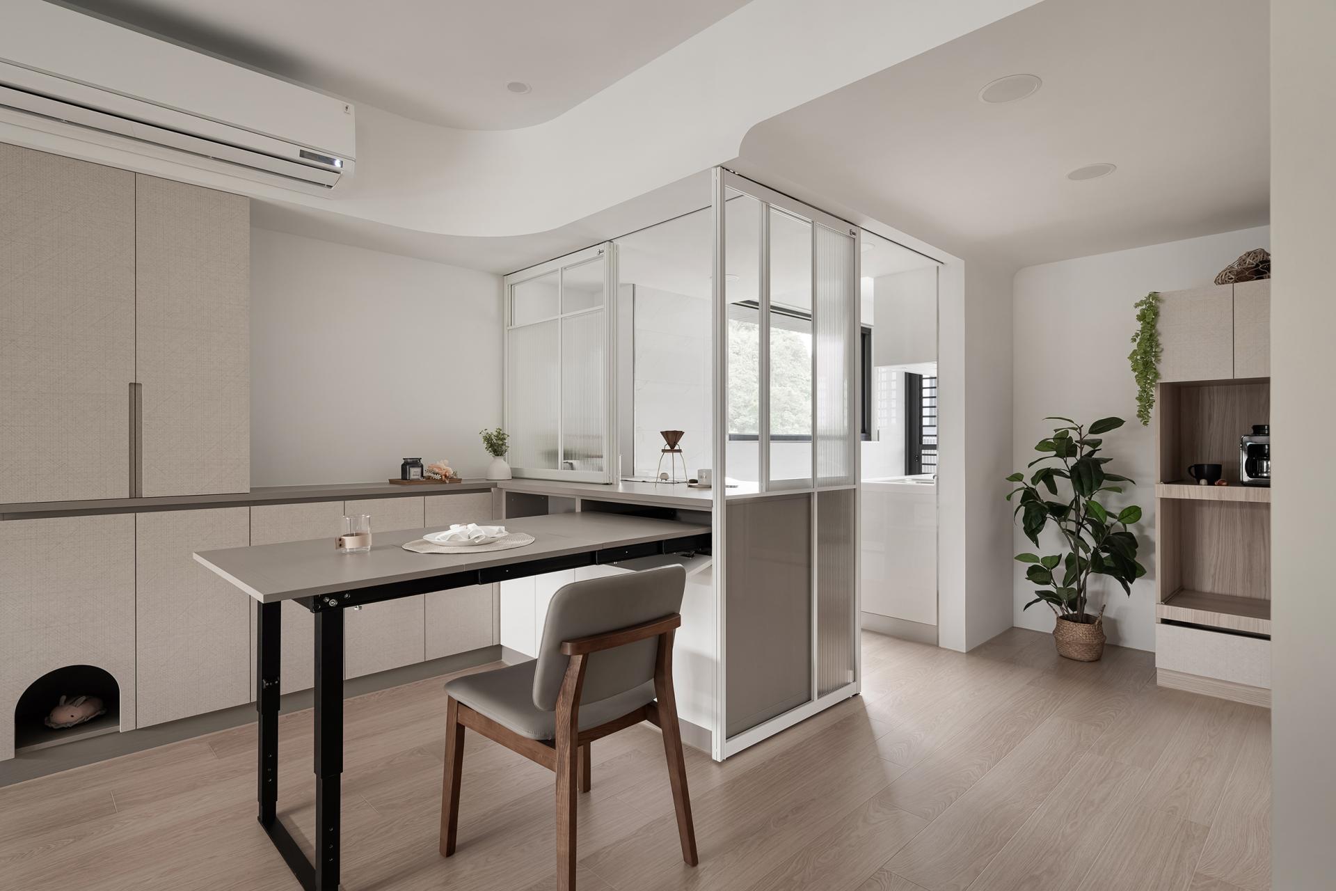 The kitchen and dining areas are separated by an integrated island and glass sliding doors. The extendable dining table can be stored within the island structure as needed, maintaining ample circulation space. The opposite side integrates an appliance cabinet. The overall color scheme uses white, wood, and beige as the base tones, allowing the cooking space to harmonize with the outdoor mountain views.