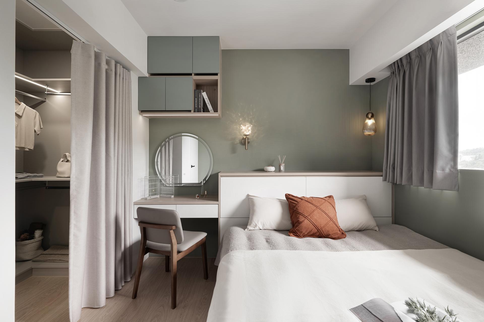 The private area transitions into a calm rhythm, with three green walls surrounding the master bedroom to create a serene sleeping atmosphere. The bedside table and vanity are designed to be the same depth, while the open-plan wardrobe uses curtains instead of doors to soften the visual impact and reduce a sense of confinement. This balanced design, tailored to the space's dimensions, is both lightweight and visually appealing.