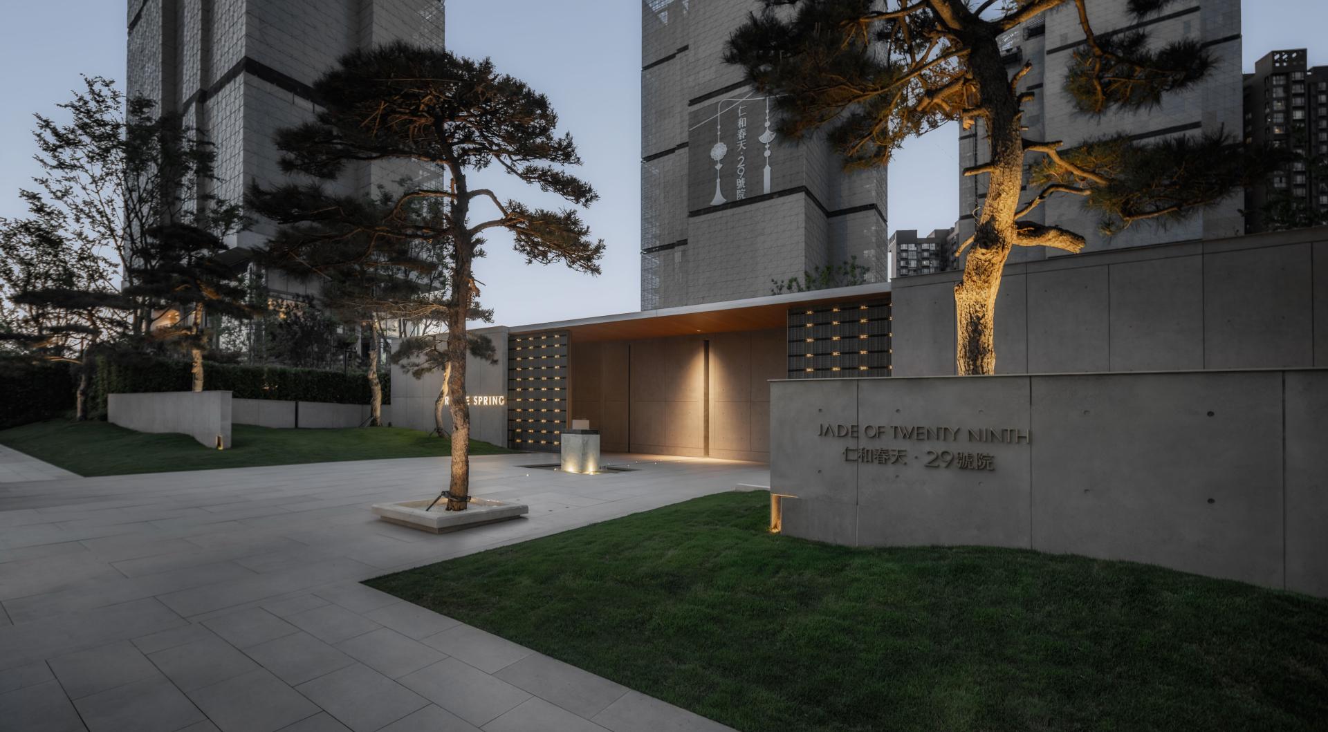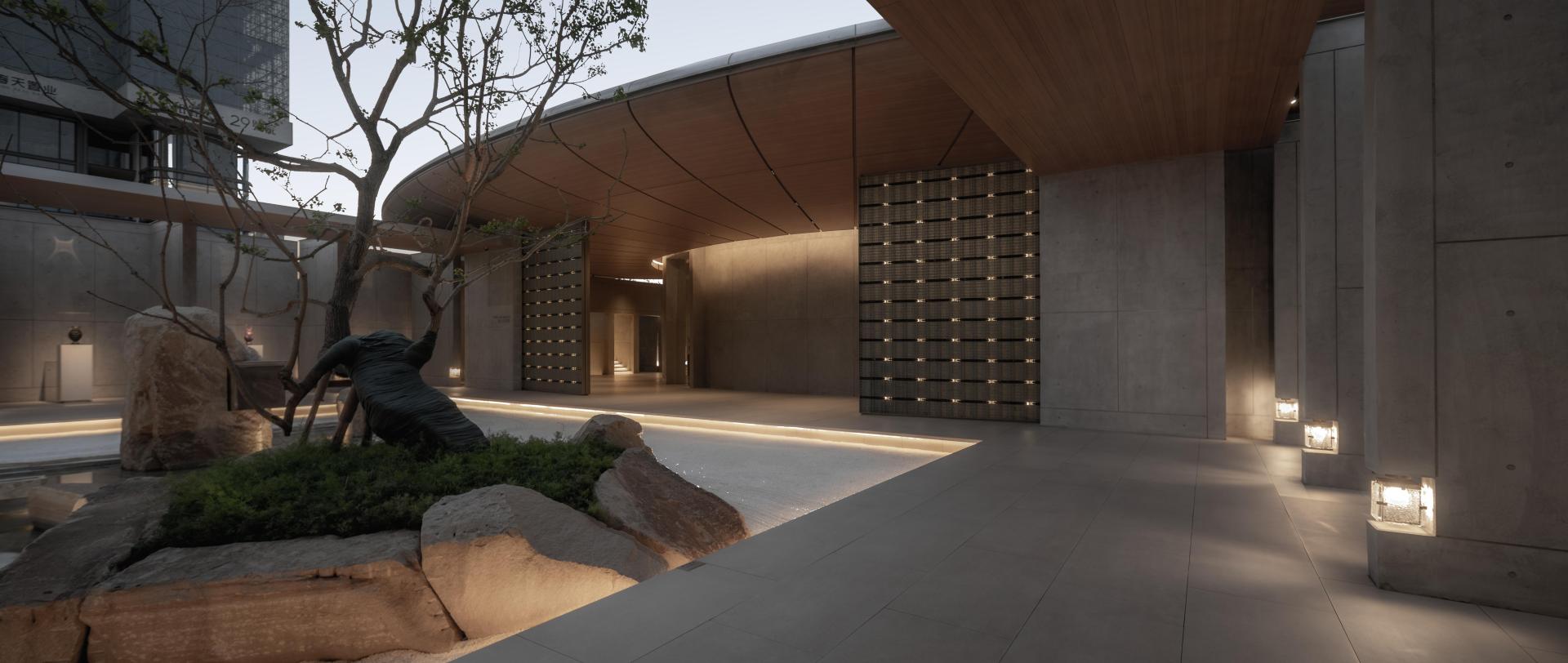 The entrance reflects Tadao Ando’s modernist minimalism, where exposed concrete imparts a calm, textured character. Ancient pines and a rhythmic sequence of walls establish a ceremonial procession, animated by shifting light and shadow through the day.