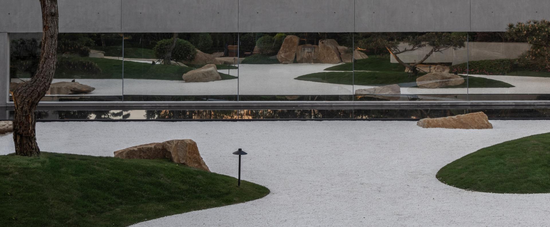 Influenced by the Adachi Museum, the courtyard embraces simplicity: Mount Tai pines form the structural framework, white gravel defines a dry landscape, and naturally weathered Bai Po Huang stones are placed with deliberate precision—composing a scene of quiet elegance and enduring charm.