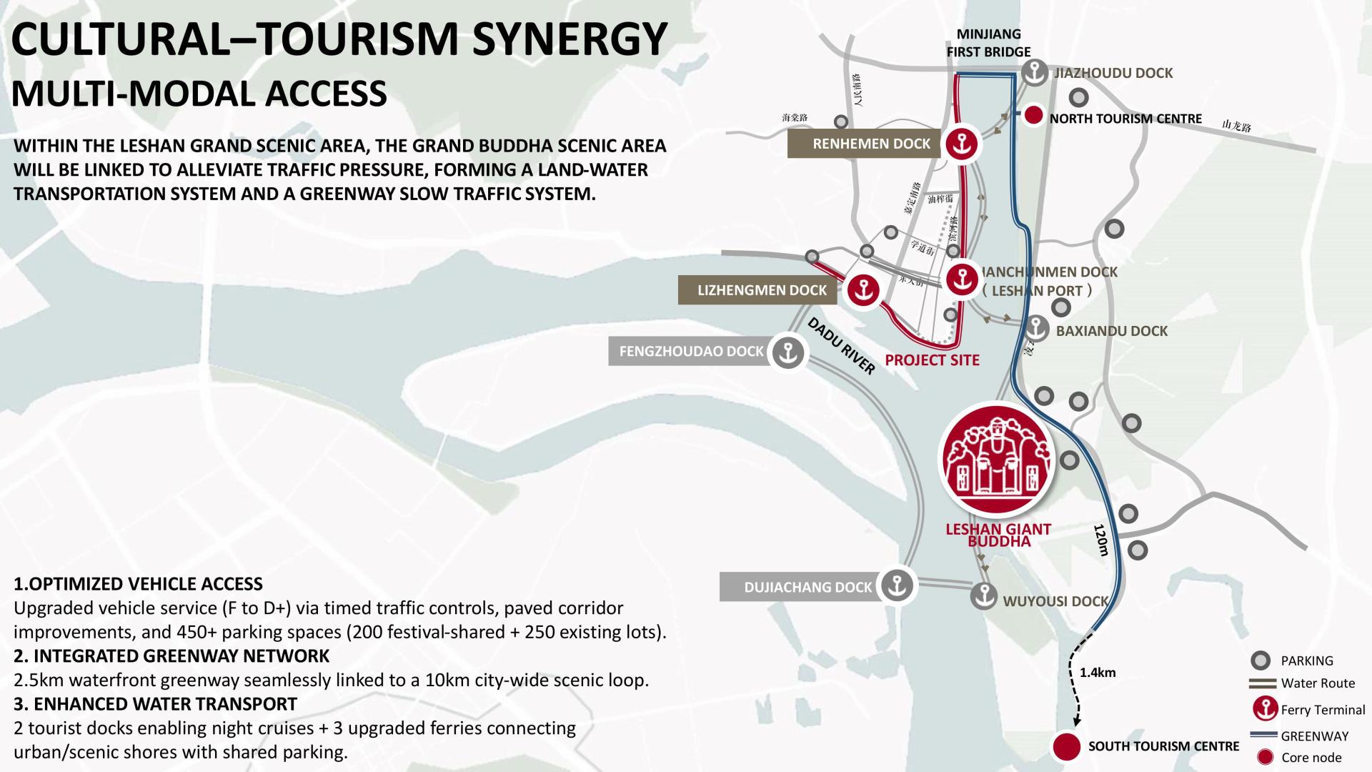 Two new docks at historic gates, three upgraded ferry crossings, and a continuous 2.5 km waterfront greenway linking to a 10 km urban loop create seamless land–water access. Timed traffic controls and road upgrades ease flows between the city, riverfront, and Leshan Giant Buddha, enhancing shared tourism and local experiences.