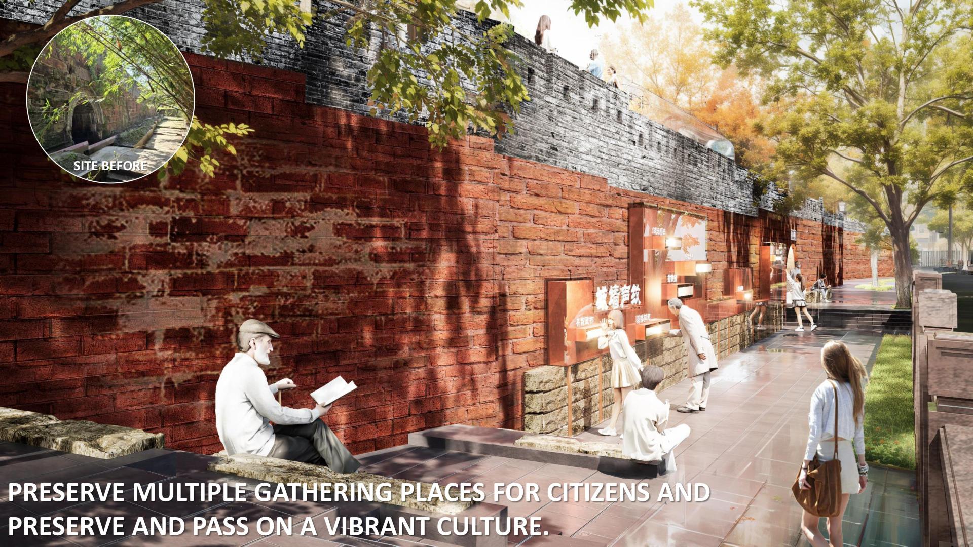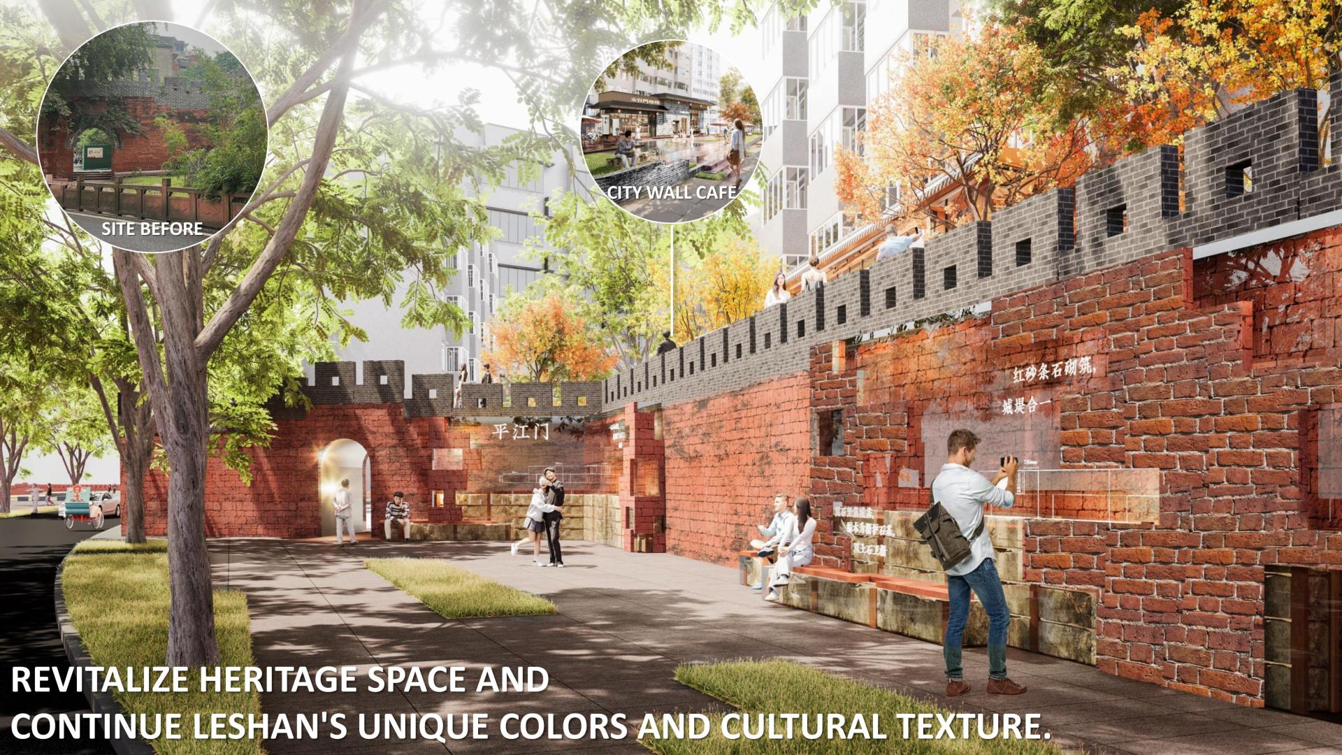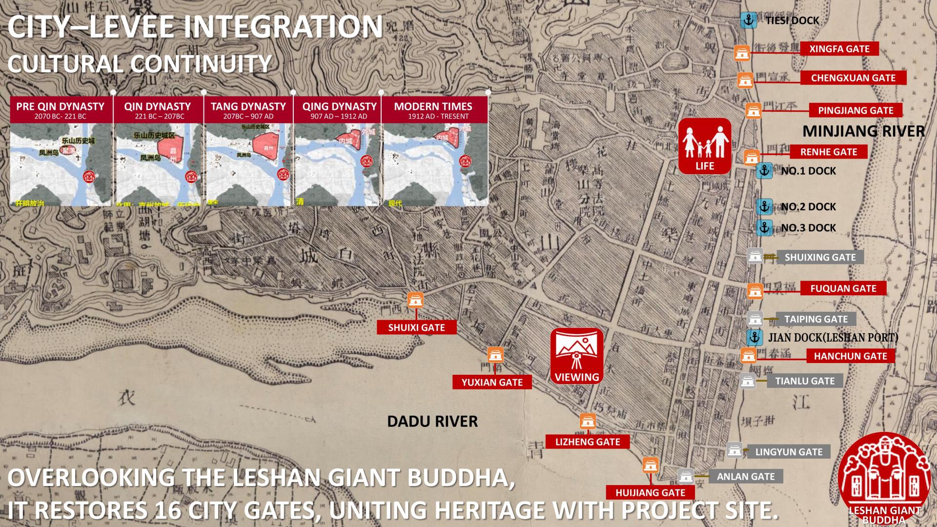 In full view of the Leshan Giant Buddha, the design preserves all 11 surviving city gates and reconstructs five lost ones, reconnecting the city’s defensive heritage with its sacred riverside vista. Working closely with historians and archaeologists, the project revives Leshan’s unique palette, textures, and spatial patterns while retaining long-standing community gathering spots. New cultural trails extend from the levee into the old city, making the riverfront not only a heritage landmark but also the city’s ceremonial face to the Buddha—continuing a dialogue that has endured for over a millennium.