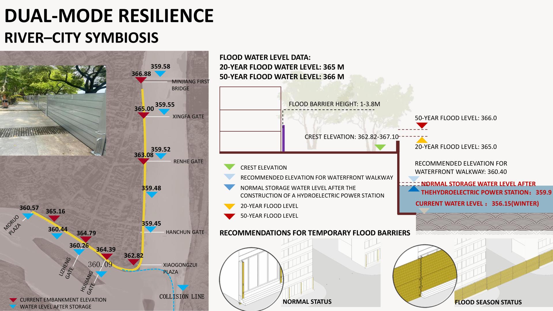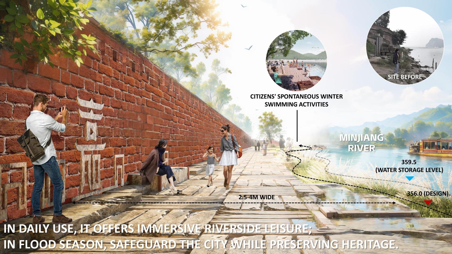 A “peace–flood dual-use” strategy creates flexible, layered flood protection. In daily use, it offers immersive riverside leisure; in flood season, deployable barriers, backflow valves, and pumping stations safeguard the city while preserving heritage structures.