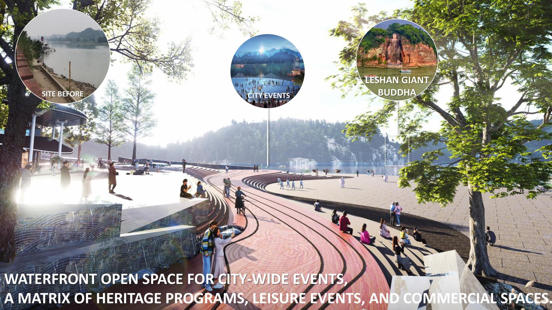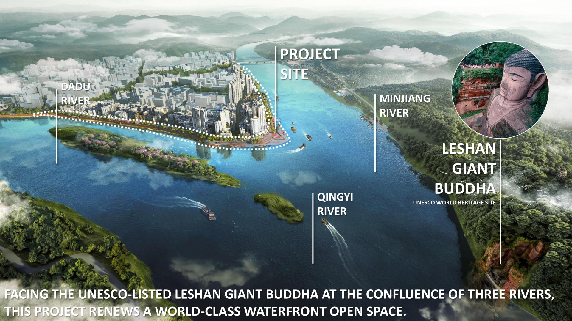 At the confluence of three rivers in Leshan, China—where the historic city directly faces the UNESCO-listed Leshan Giant Buddha—this project has renovated a 2.5-kilometer-long flood-prone waterfront area to protect and preserve this riverside heritage due to the rise in water level caused by the newly built hydropower station. Integrated flood control, heritage restoration, and public realm design reconnect the city’s waterfront open space with sacred Millennium Buddha Landscape, uniting both banks into a vibrant landscape where history, community, and daily life converge.