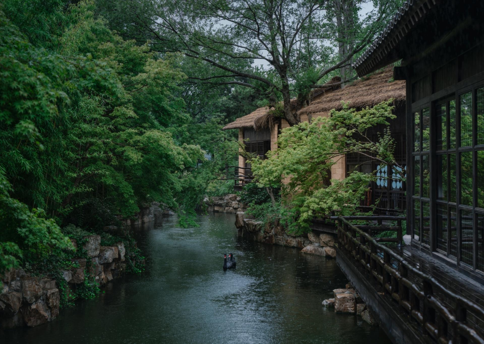 House and water, water and person—mountains are shaped, trees are nurtured; dense woods and tall bamboos are cultivated. Space is not defined by courtyard walls; instead, one finds oneself already within forest and spring, seated beside the winding stream where the wine cups once floated.