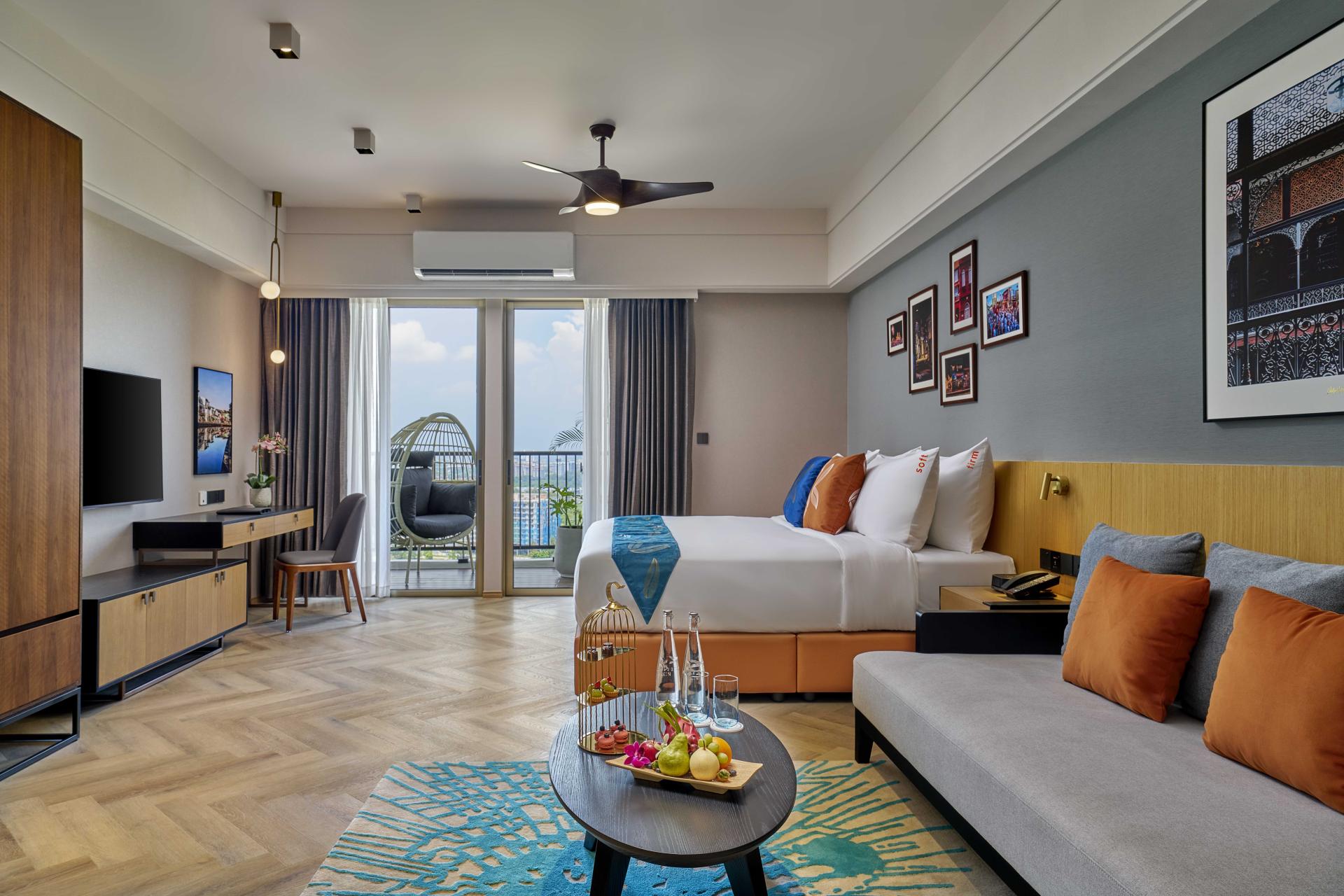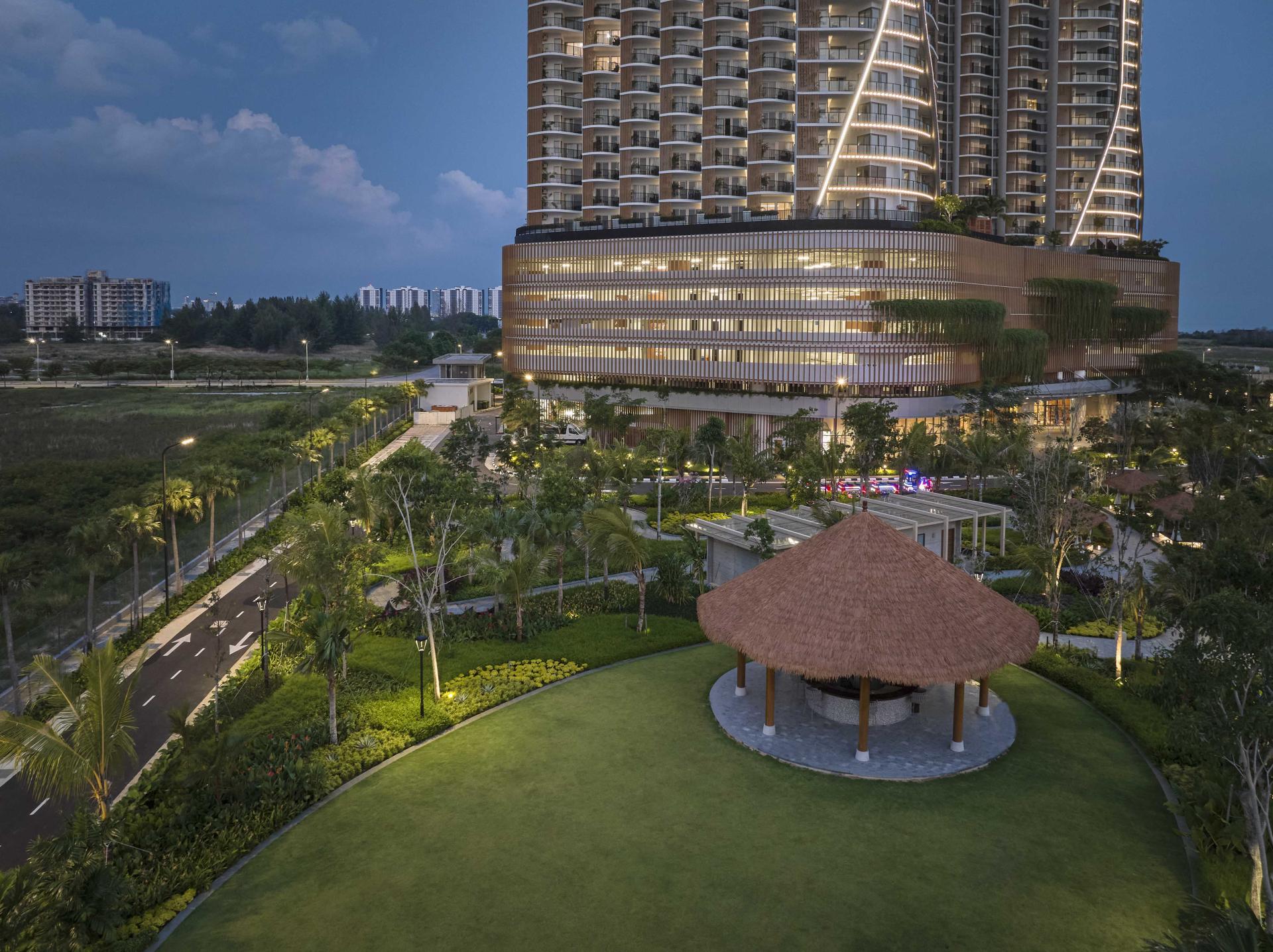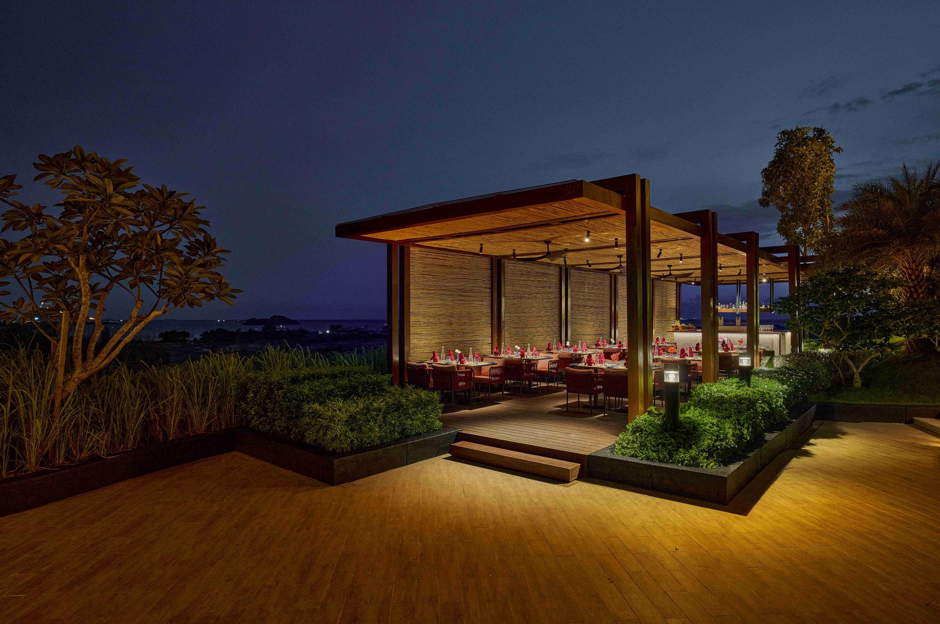 Materials combine polished stone, timber, dark metal, and crafted bamboo and rattan, translating local craft into a contemporary hospitality language. Passive shading via deep overhangs and balcony fins, wrap-around glazing for daylight, and semi-outdoor transitional spaces reinforce environmental stewardship.