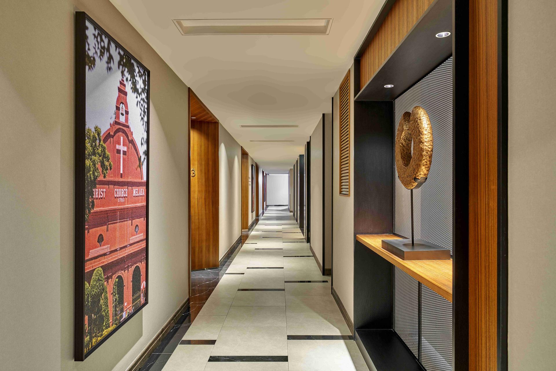 The experience extends outdoors to a bamboo-clad garden pavilion, designed for natural ventilation and shaded comfort. Cross-breezes, ceiling fans, and dimmable lighting allow year-round dining without excessive mechanical cooling. Corridors celebrate Melaka’s cultural memory through gallery walls of local landmarks and artisanal niches, framed by warm wood portals and low-glare lighting.