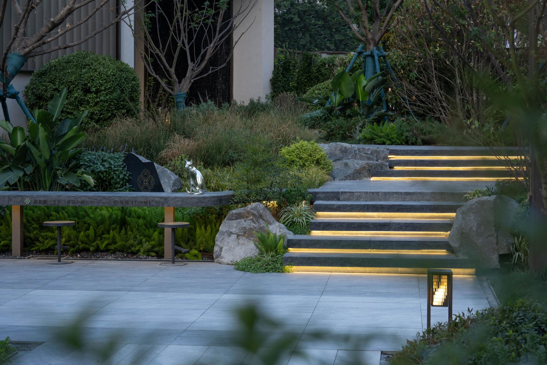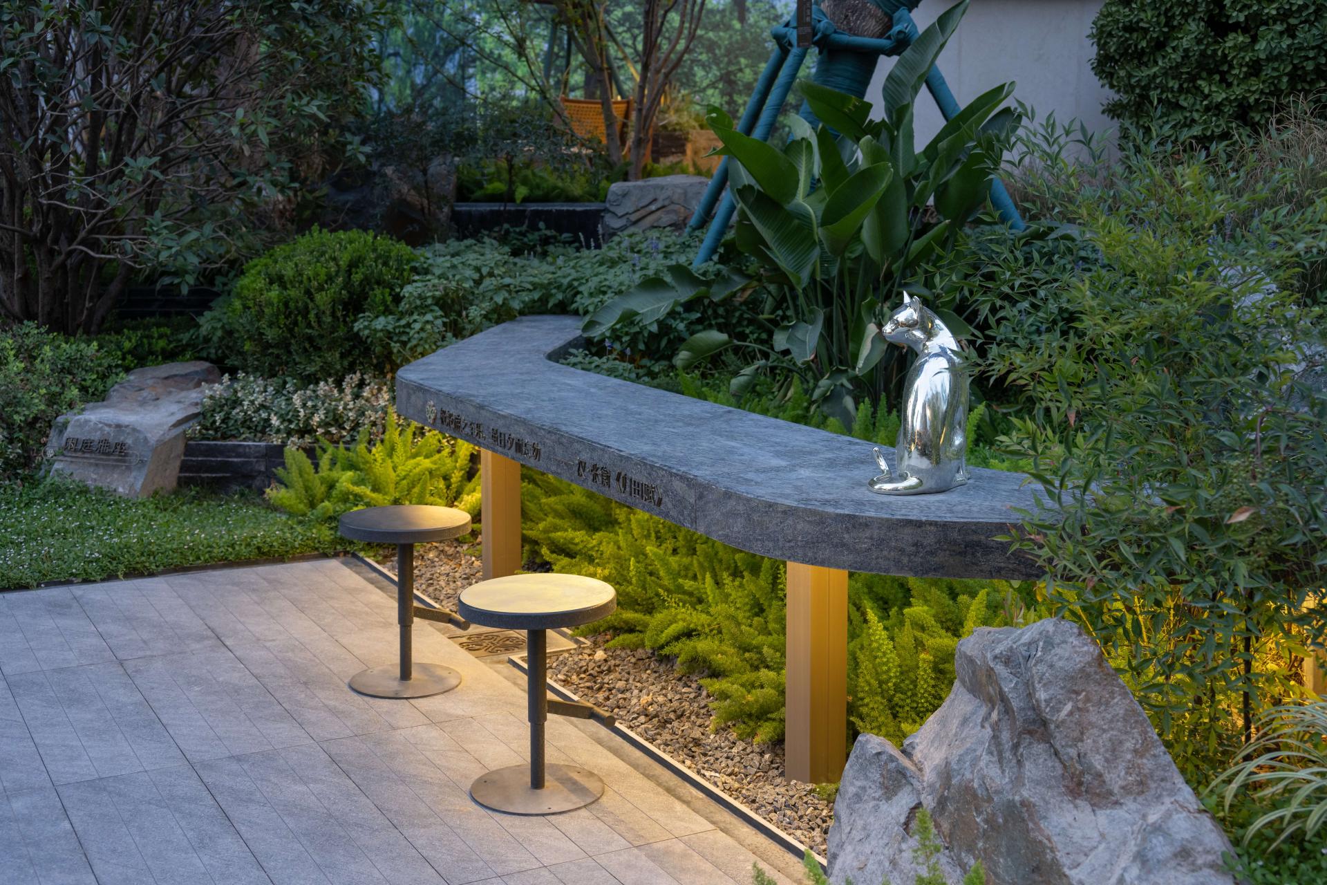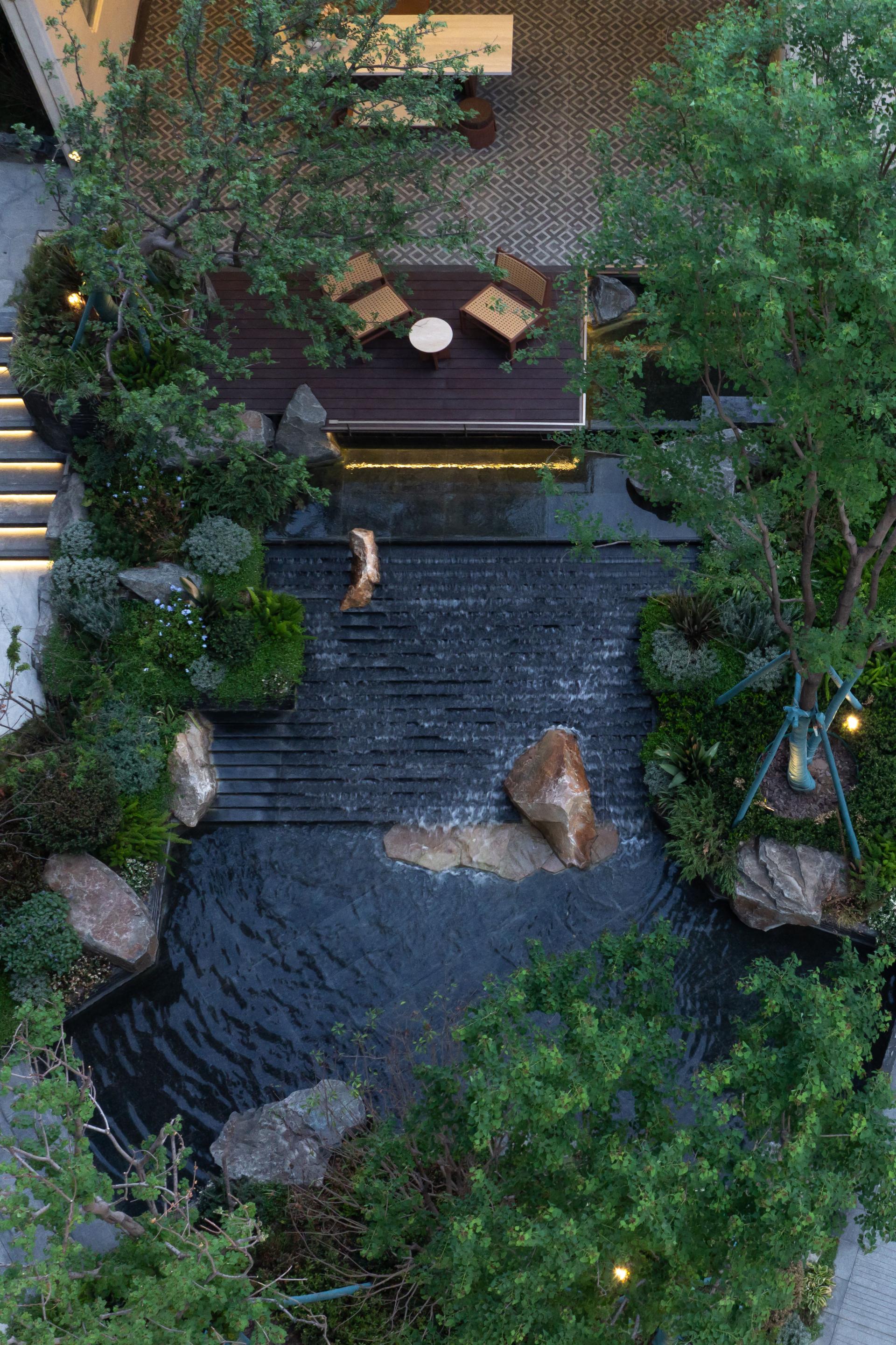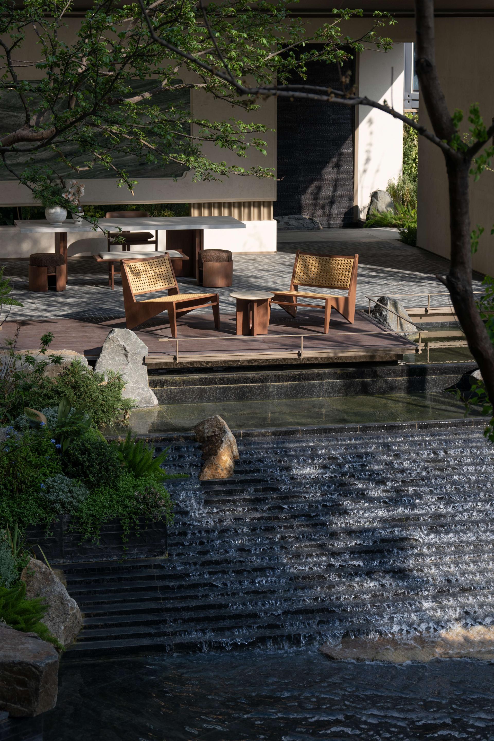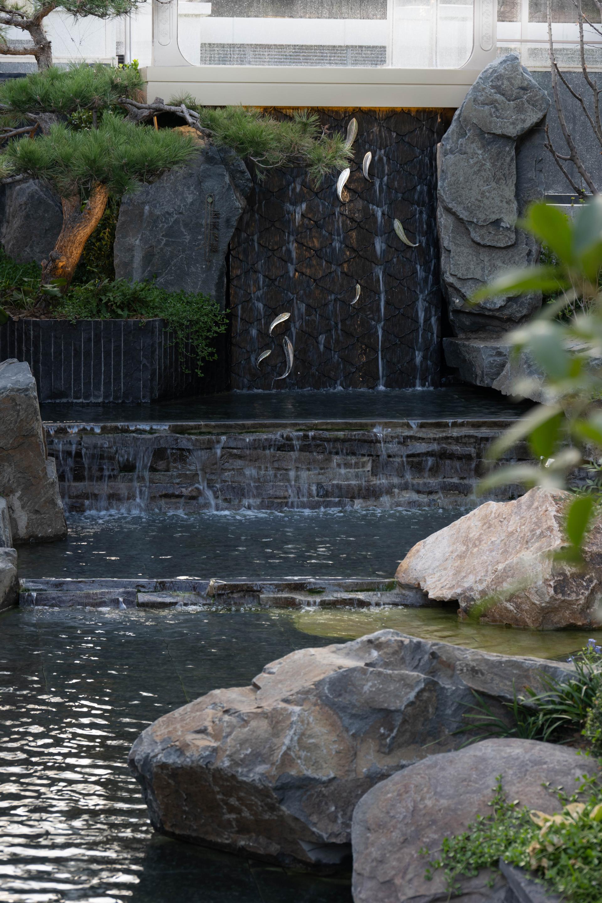 The display area showcases an 8-meter-high ceremonial gateway interface and a recreational water courtyard space at the back. Beneath the guest tea pavilion, water cascades gently, while tiered tree planters create a landscape with varying elevations. Taihang gold stones are interspersed among the cascading waters, bringing a touch of natural wildness. By constructing gardens with mountains and waters and enabling visitors to traverse ancient historical sites and splendid sceneries, the project combines themes of humanistic stories and natural landscapes to highlight its profound heritage.