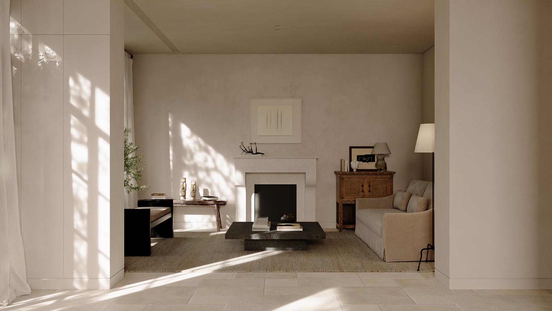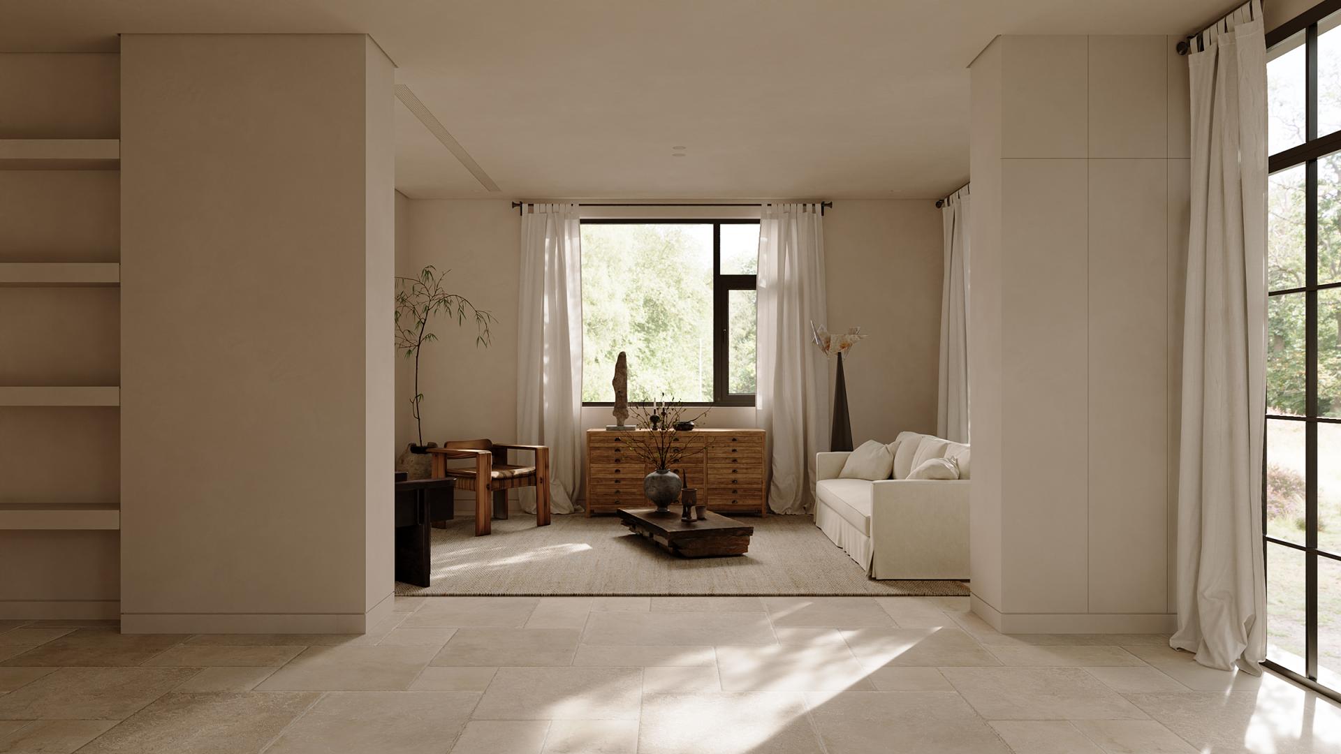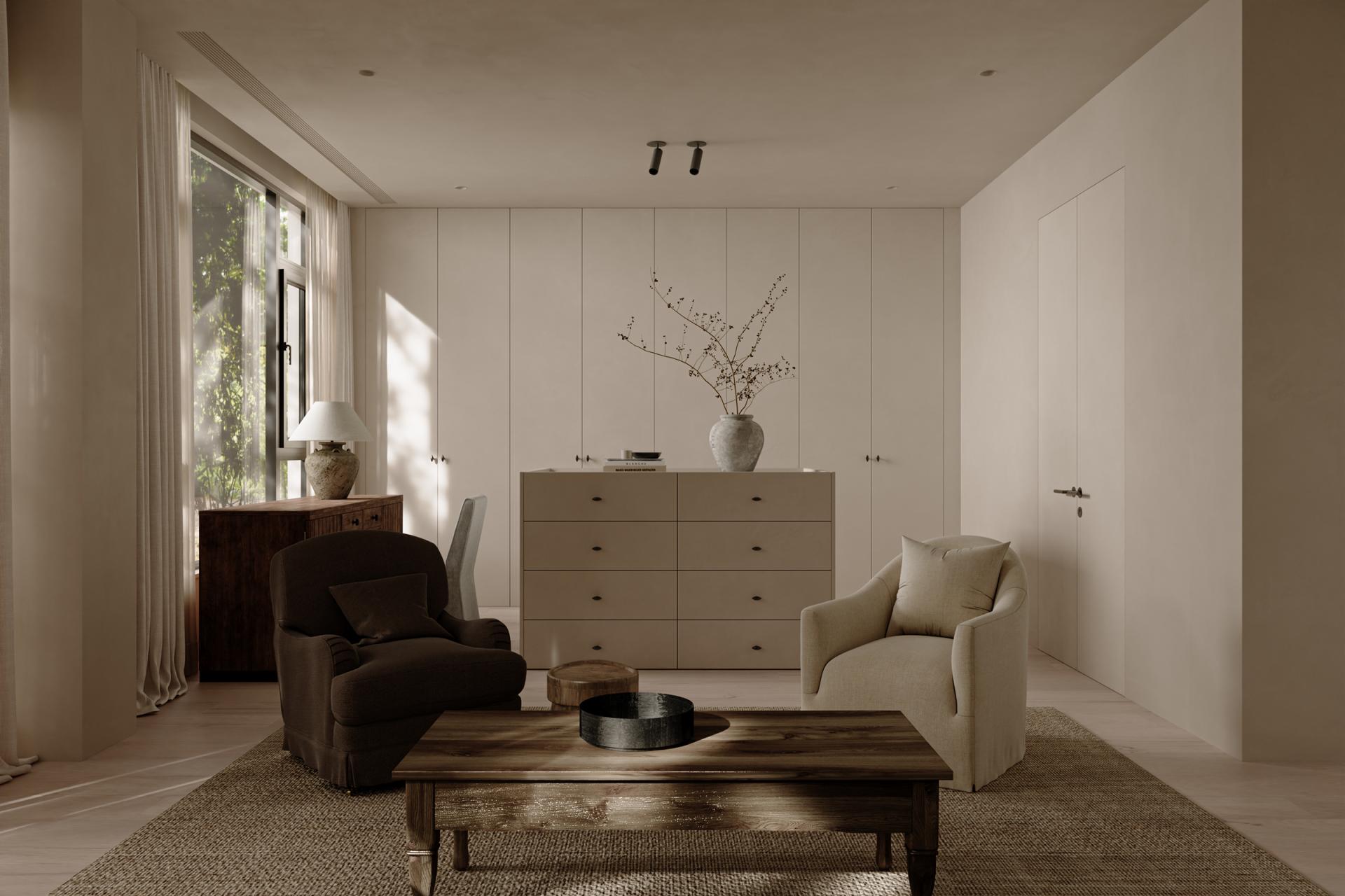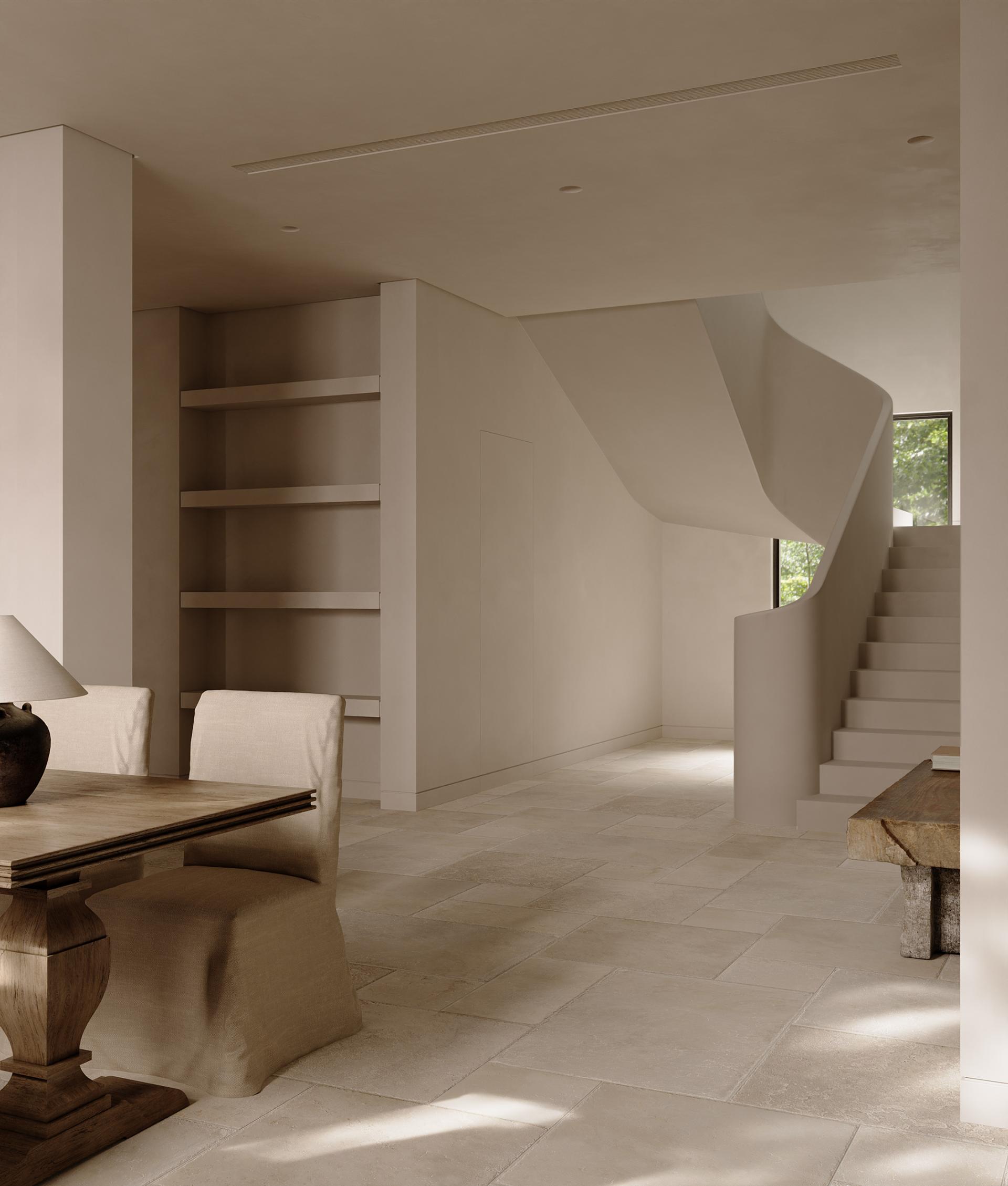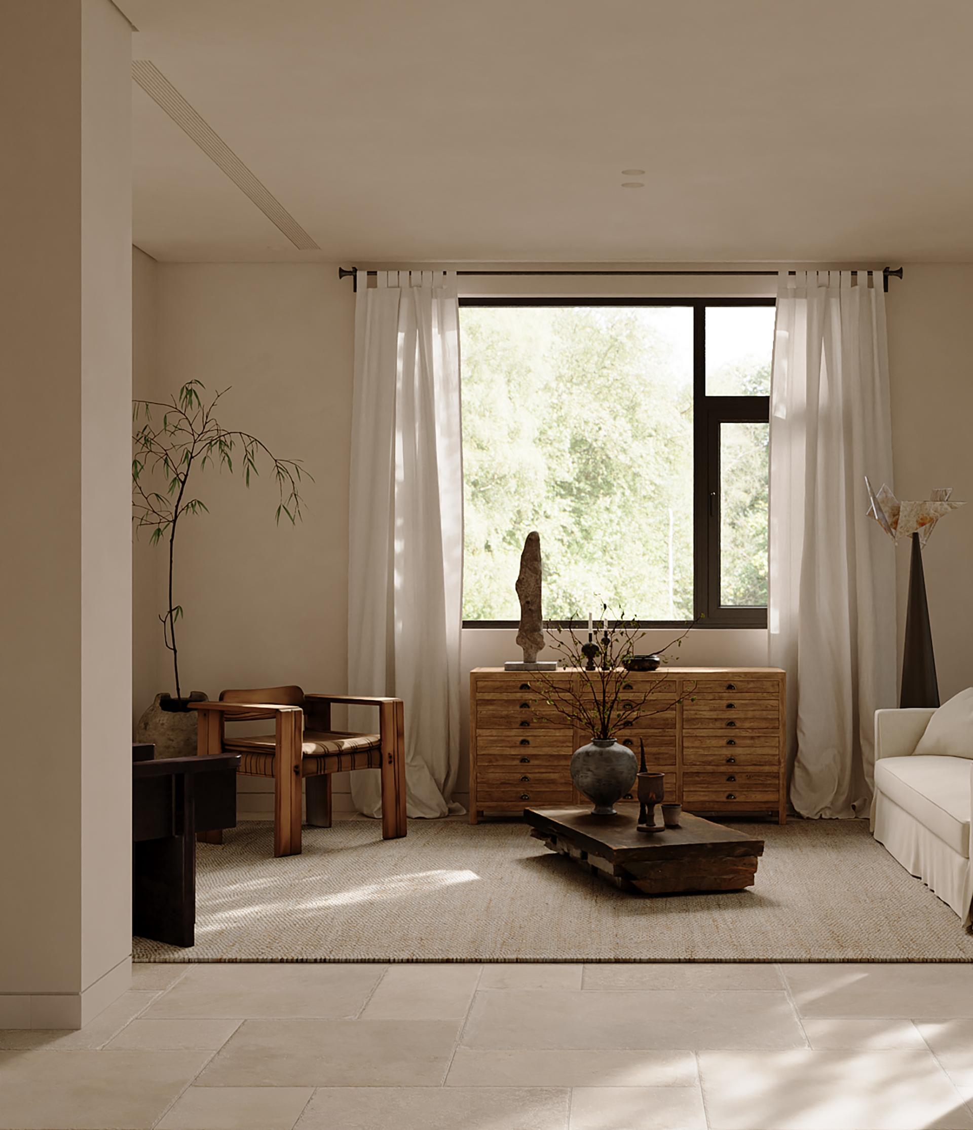 The design is shaped by the couple’s preferences and the property’s original structure. The bride admires the wild luxury wabi-sabi aesthetic found in boutique hotels but wanted a warmer, more domestic feel, paired with the rustic texture of vintage wooden furniture. The existing layout offered generous proportions and high ceilings, allowing the hardscape design to remain restrained. A semi-partitioned layout enhances spatial fluidity, while axial symmetry at the entry corridor and second-floor stair hall creates a sense of ceremony. Walls and floors feature textured limestone and artistic plaster finishes, with a limited material palette to cultivate purity and calm.