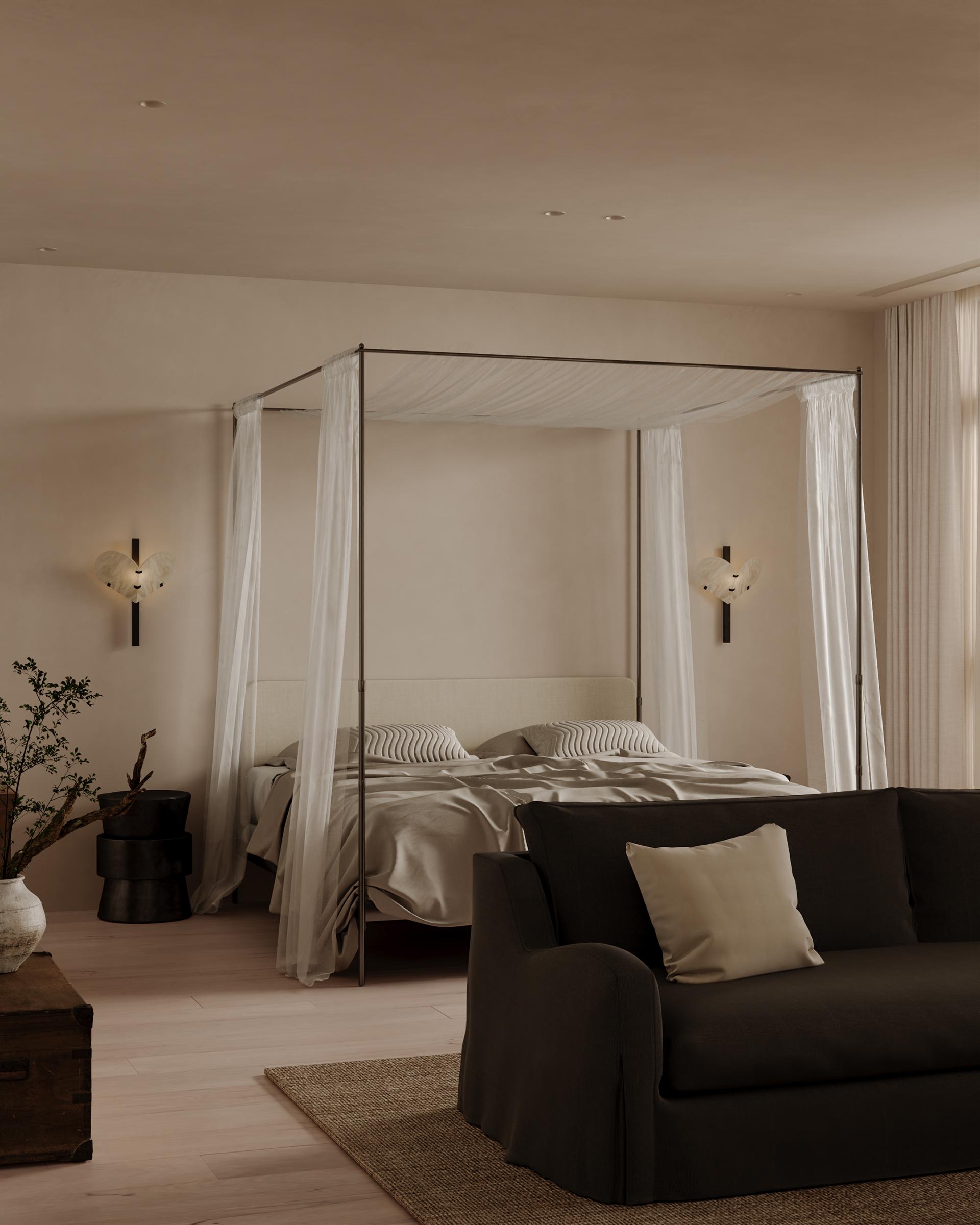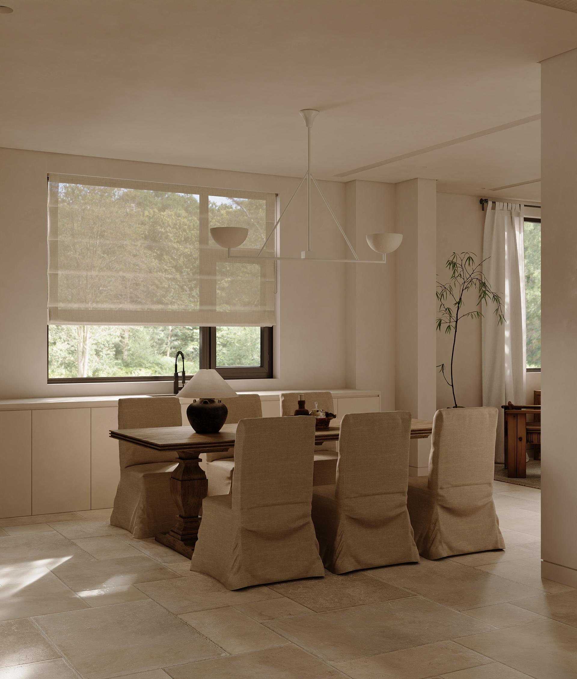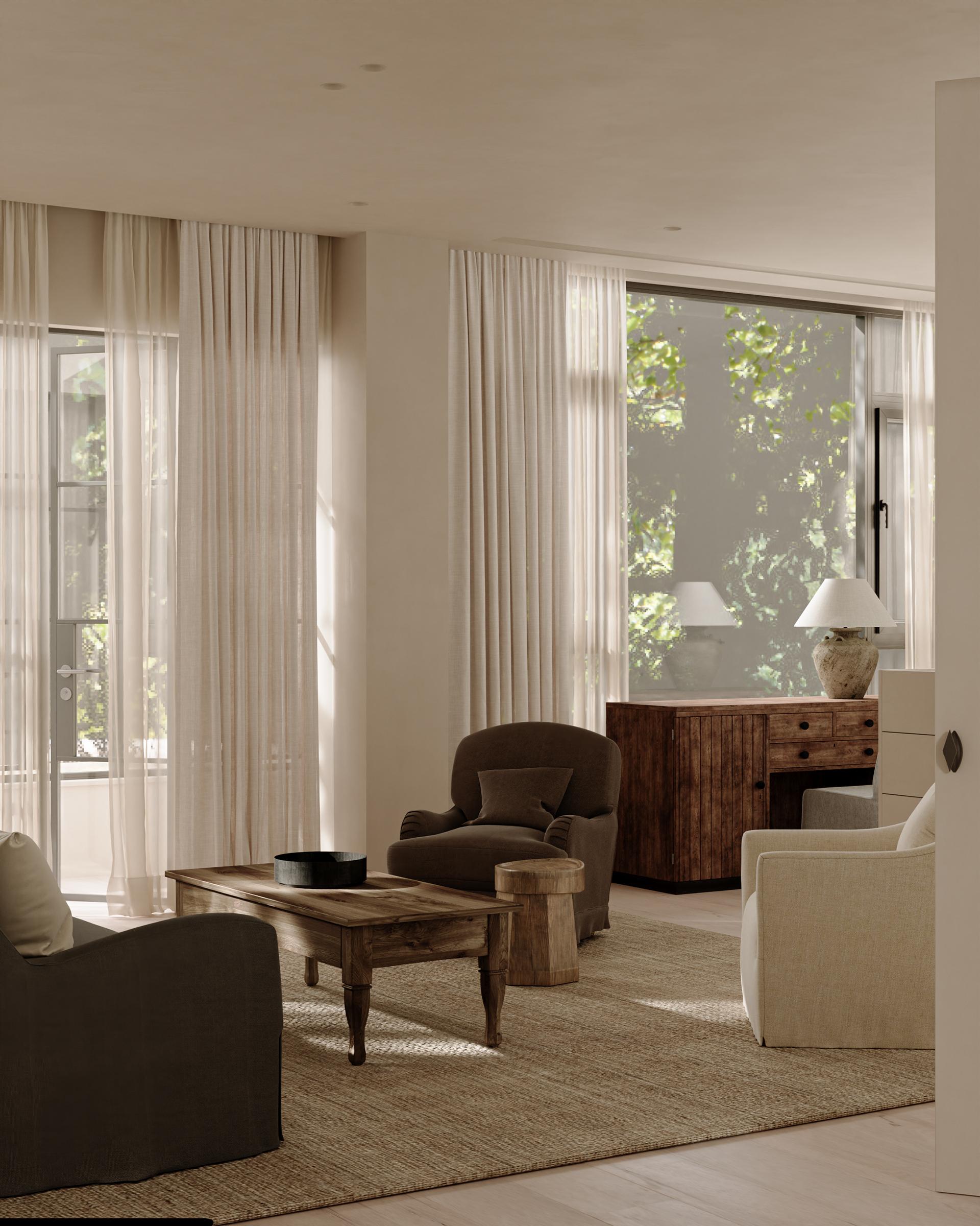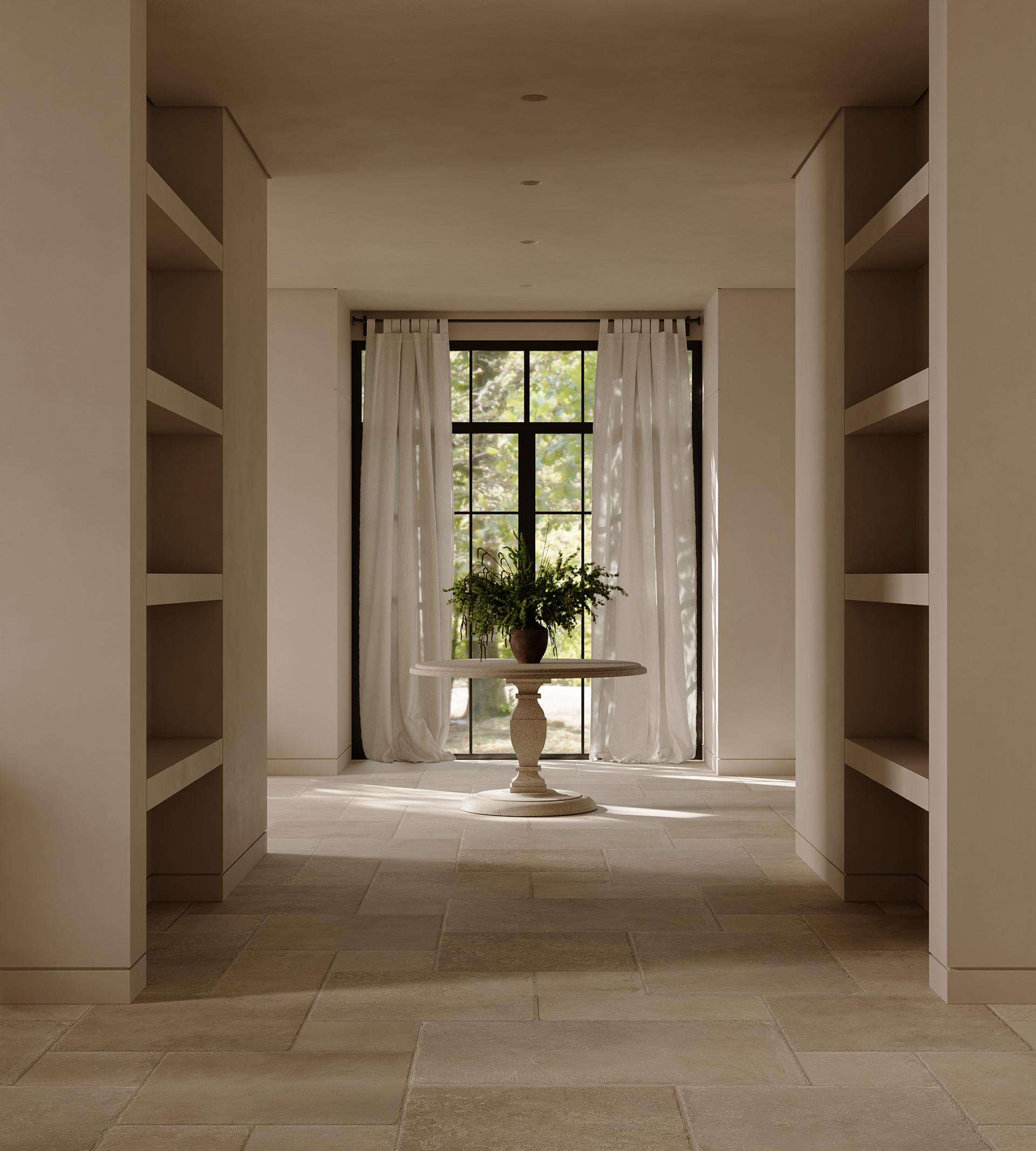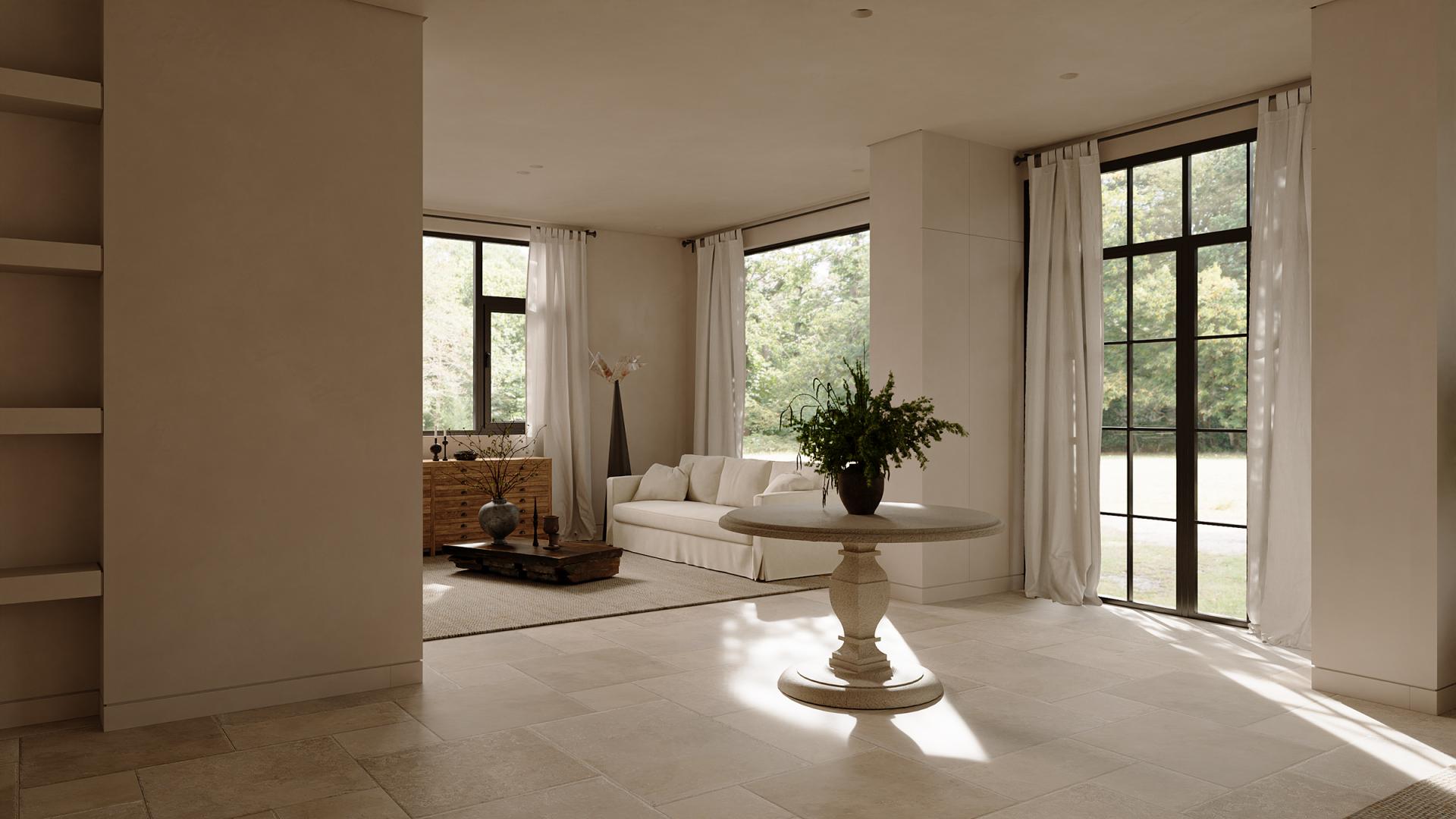 The design is shaped by the couple’s preferences and the property’s original structure. The bride admires the wild luxury wabi-sabi aesthetic found in boutique hotels but wanted a warmer, more domestic feel, paired with the rustic texture of vintage wooden furniture. The existing layout offered generous proportions and high ceilings, allowing the hardscape design to remain restrained. A semi-partitioned layout enhances spatial fluidity, while axial symmetry at the entry corridor and second-floor stair hall creates a sense of ceremony. Walls and floors feature textured limestone and artistic plaster finishes, with a limited material palette to cultivate purity and calm.