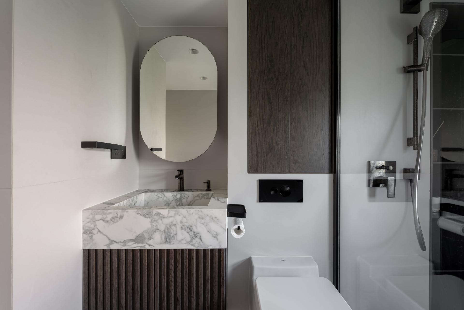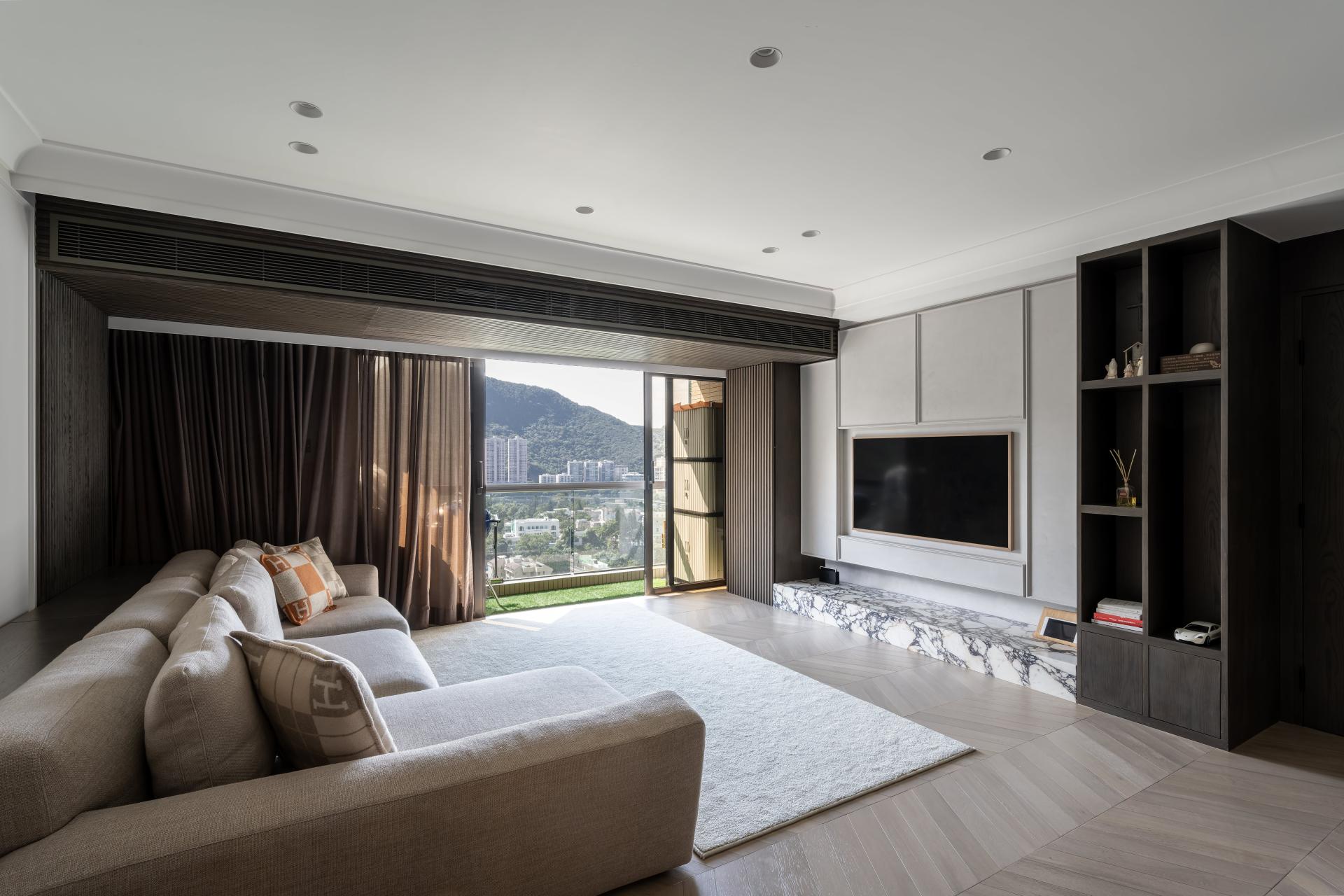 In the living area, full-height glazing maximises daylight penetration, while a stepped marble platform replaces conventional media cabinetry to maintain spatial openness and circulation. Throughout, low ceiling heights and multiple structural columns are addressed with targeted spatial reconfiguration and precision detailing.
