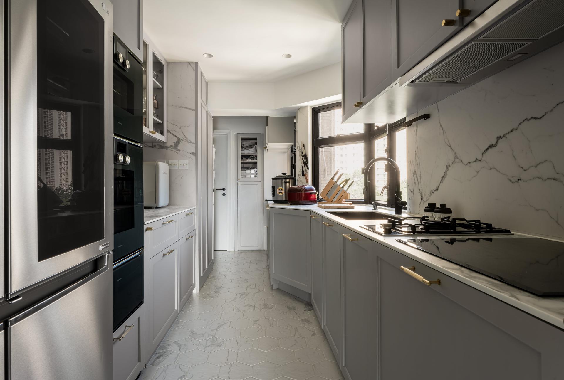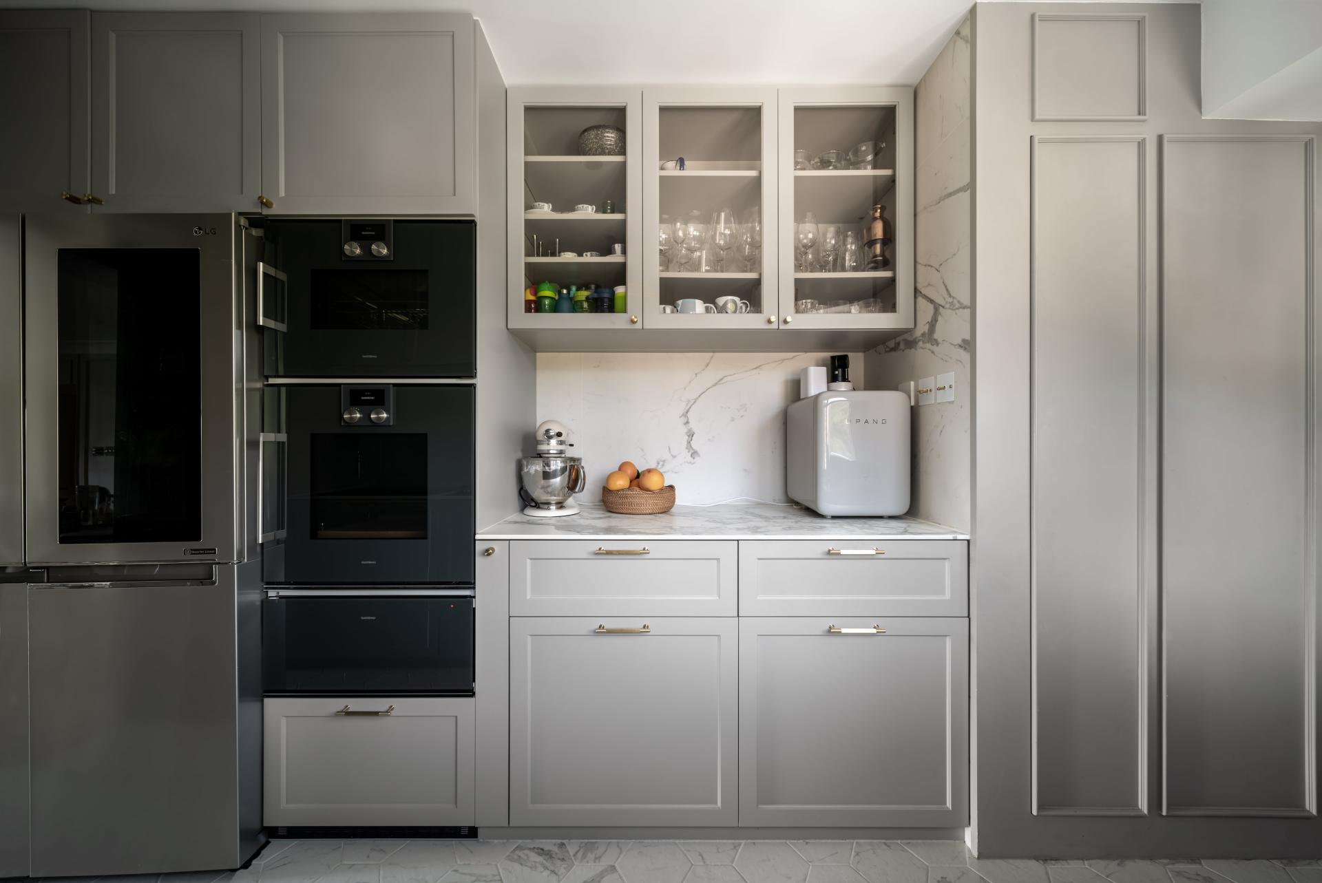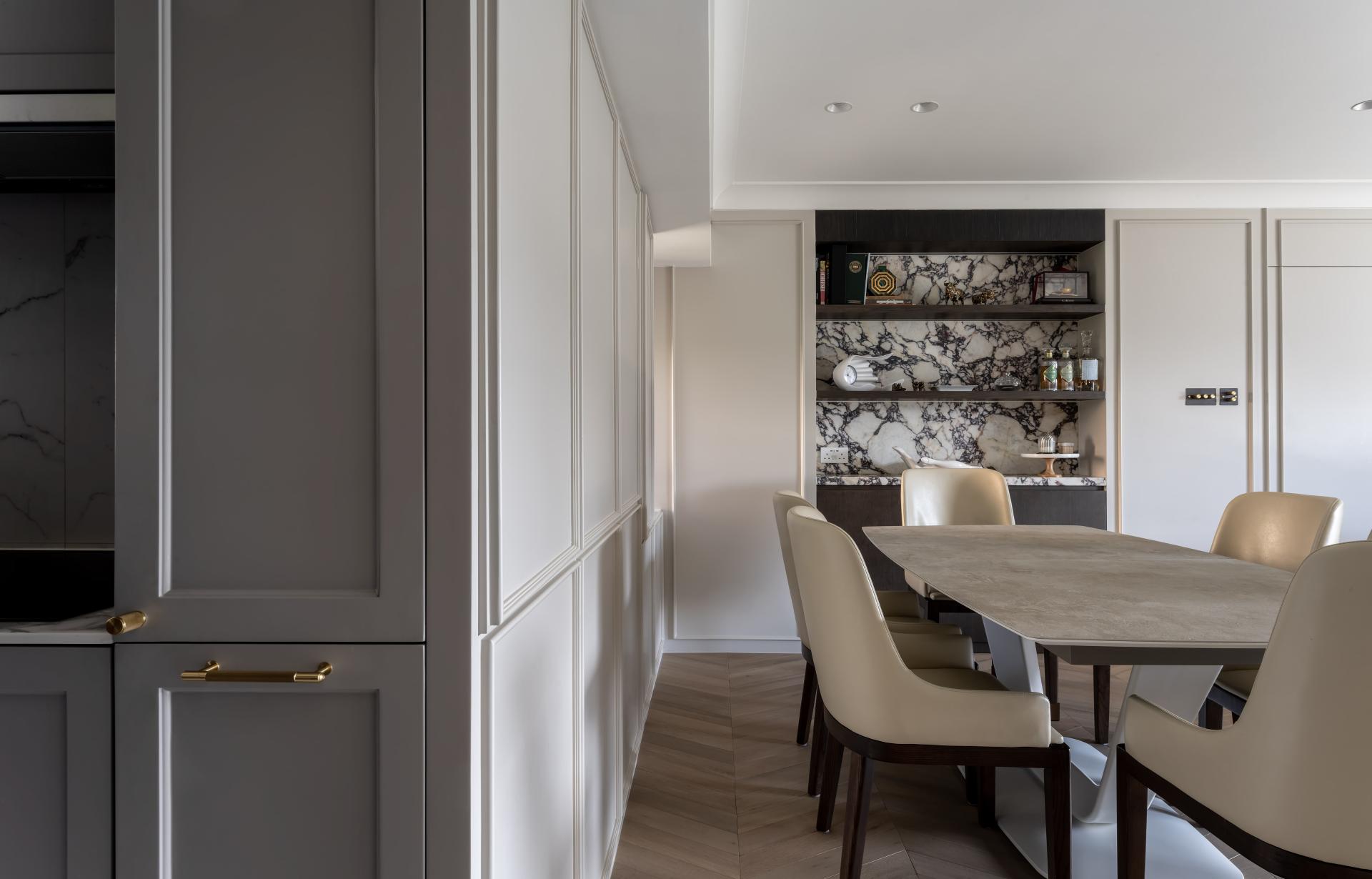 Marble is consistently integrated across the interior, from large-format floral-patterned wash basins to continuous stone flooring and feature wall panels. This unifying material strategy links the French-inspired refinement of the bathrooms, the efficiency of the kitchen, and the marble accented storage niche in the dining area. Built in functional elements including concealed storage systems, dual-access cabinetry, retractable work surfaces, and integrated step stools are seamlessly incorporated to optimise usability without disrupting the design language.