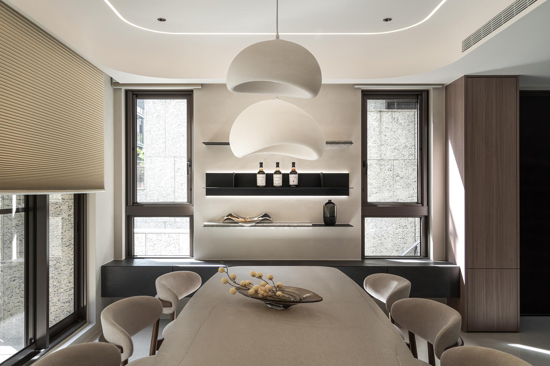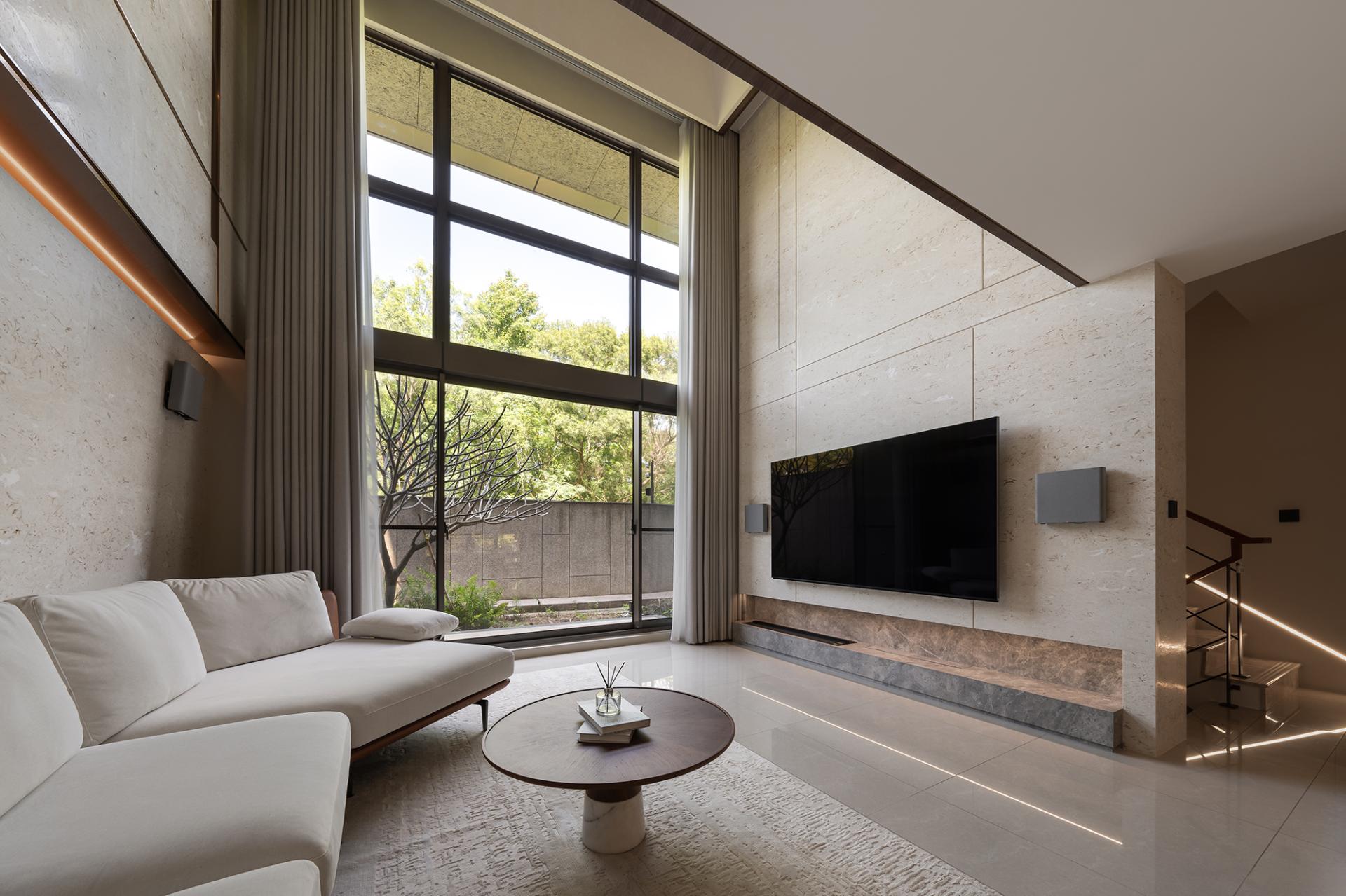 Moreover, the high-ceilinged living room boasts floor-to-ceiling windows, while the dining area is adorned with multiple glass windows, inviting the beauty of the outdoors inside. This design not only captures breathtaking outdoor scenery but also allows light and shadow to dance across the interiors, enriching the space with a dynamic sense of seasonal depth.
