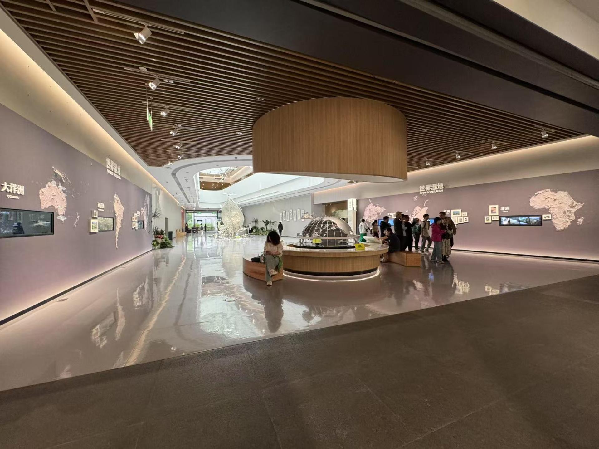 The design draws inspiration from the metaphor “Wetlands as a Boat,” transforming the text of the Ramsar Convention into a canoe-shaped installation, symbolizing the wetland as a “life ark” sustaining all beings. Surrounding birds, fish, and deer illustrate the interconnectedness of humans and wildlife, echoing the region’s 5,000-year history of harmonious coexistence. Key installations include the “Life Ark” in the foyer, the magical “30°N Latitude” exhibit tracing ancient civilizations nourished by rivers, the ten-meter China water system map in the atrium, and the “Symbiosis” themed exhibition, depicting endangered species and harmonious ecosystems along a tiered landscape.