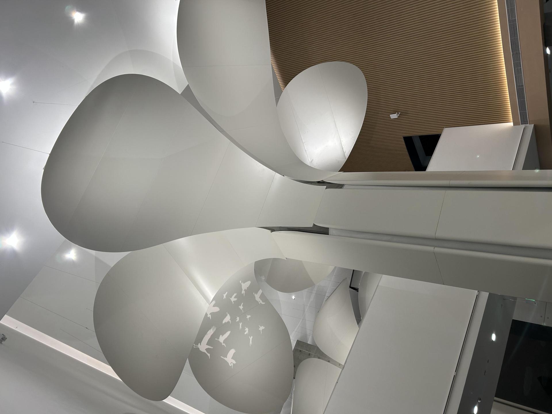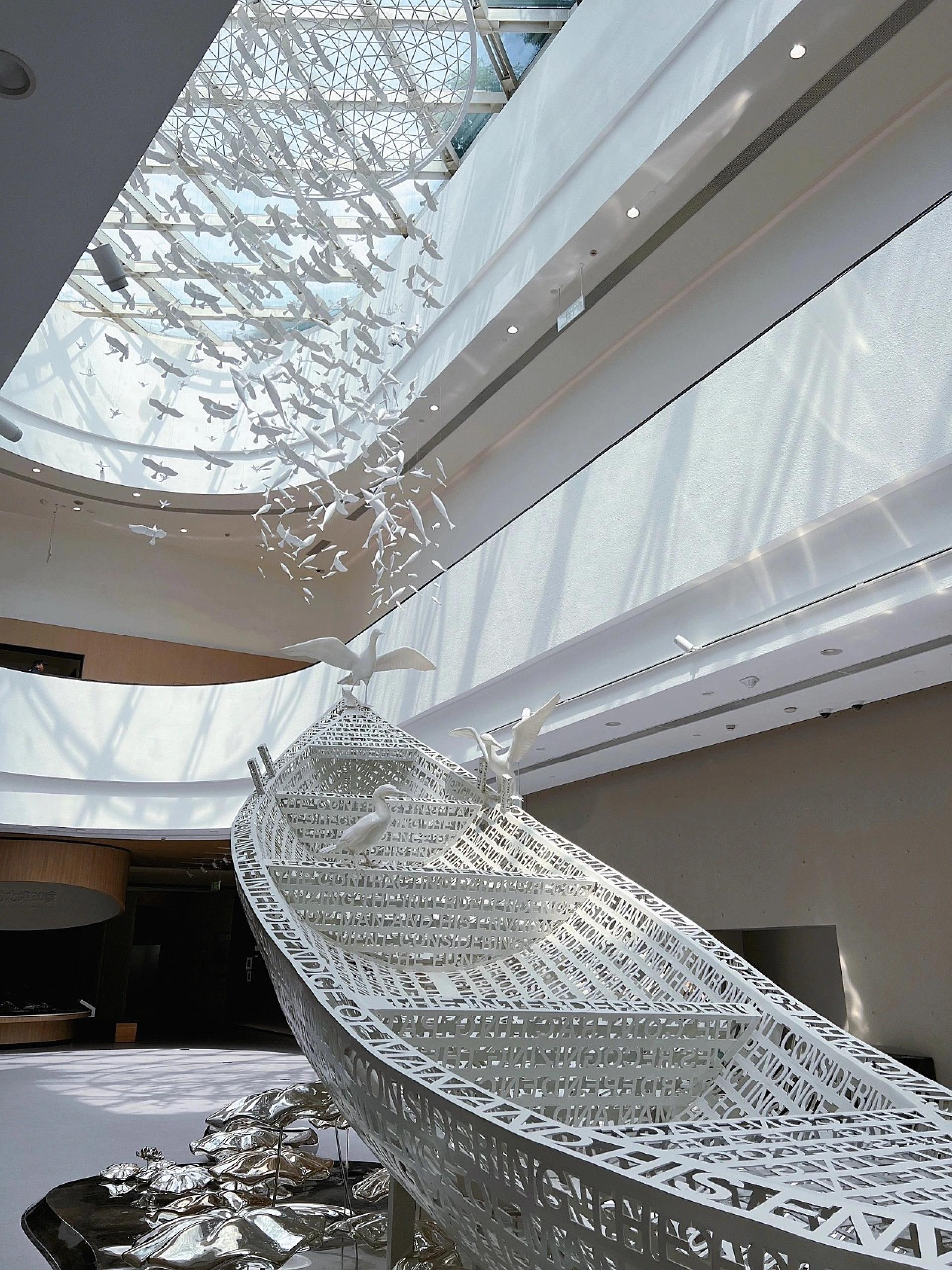 Material selection and detailing further reinforce the conceptual narrative. Pure white metal replaces traditional materials to symbolize wetland purity while ensuring durability against natural light exposure. Skylights penetrate the perforated “Life Ark” installation, casting flowing text shadows onto the floor, merging artistic metaphor with functional illumination and visitor engagement.