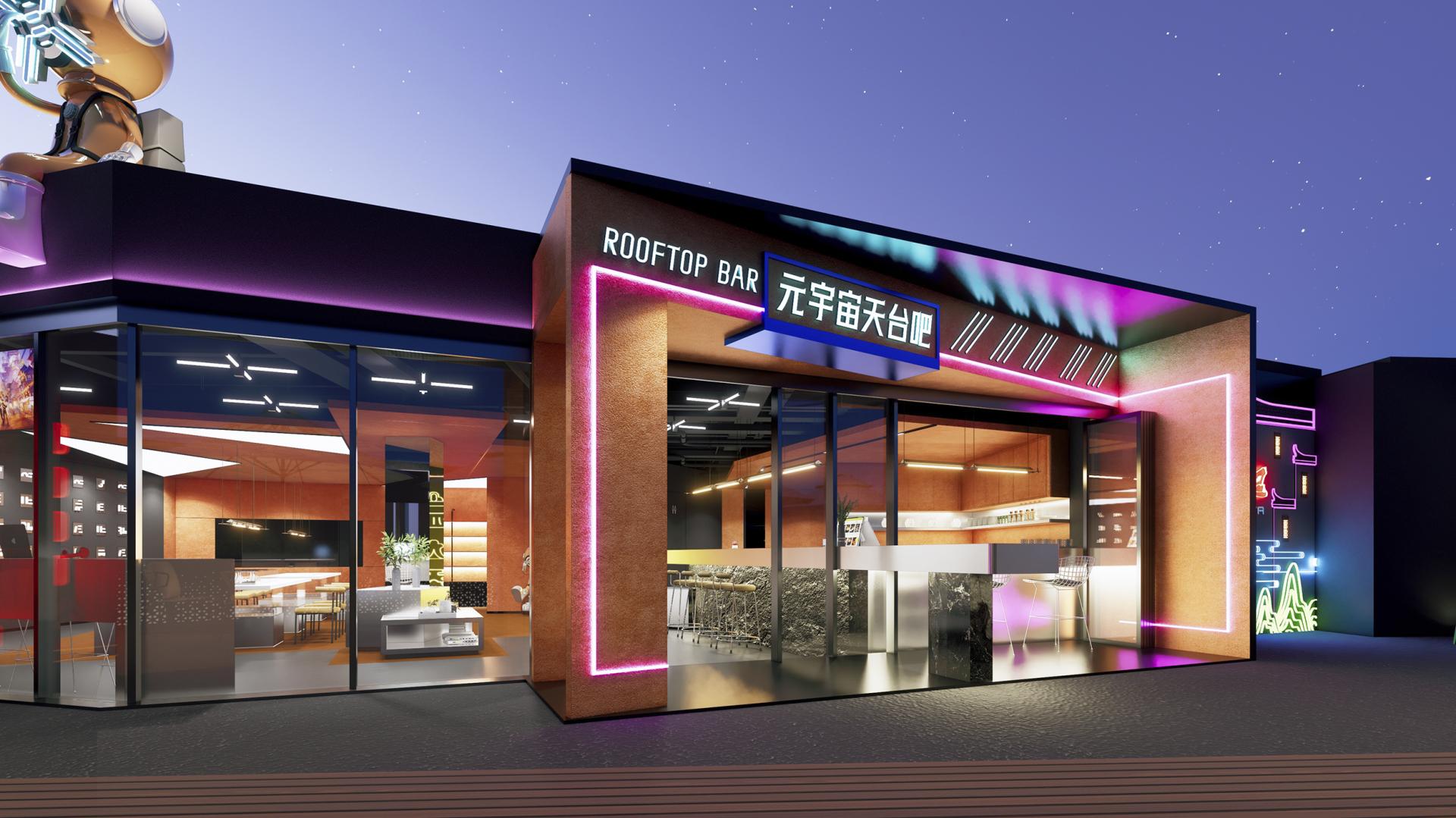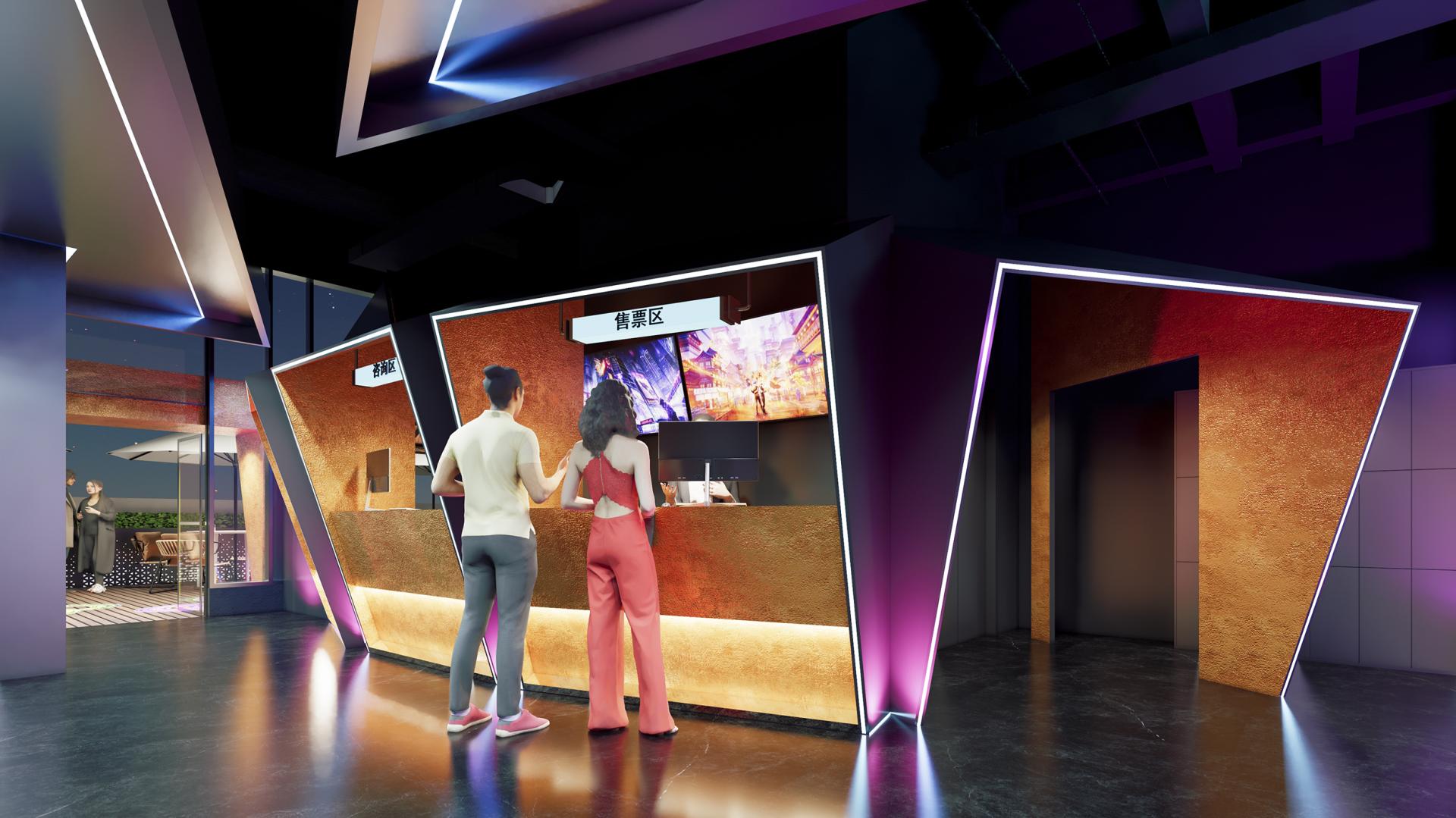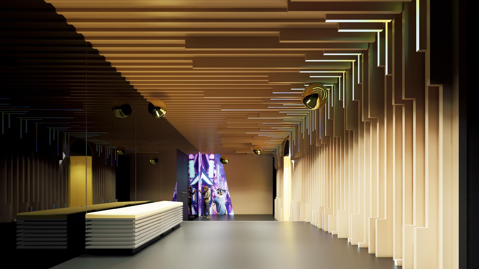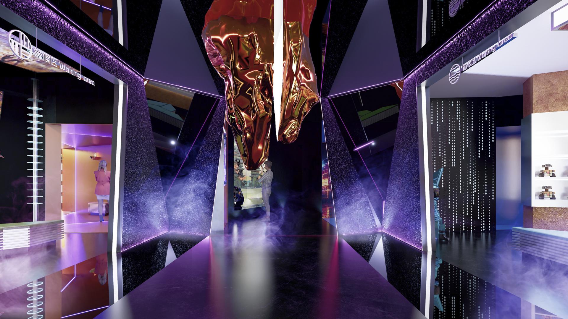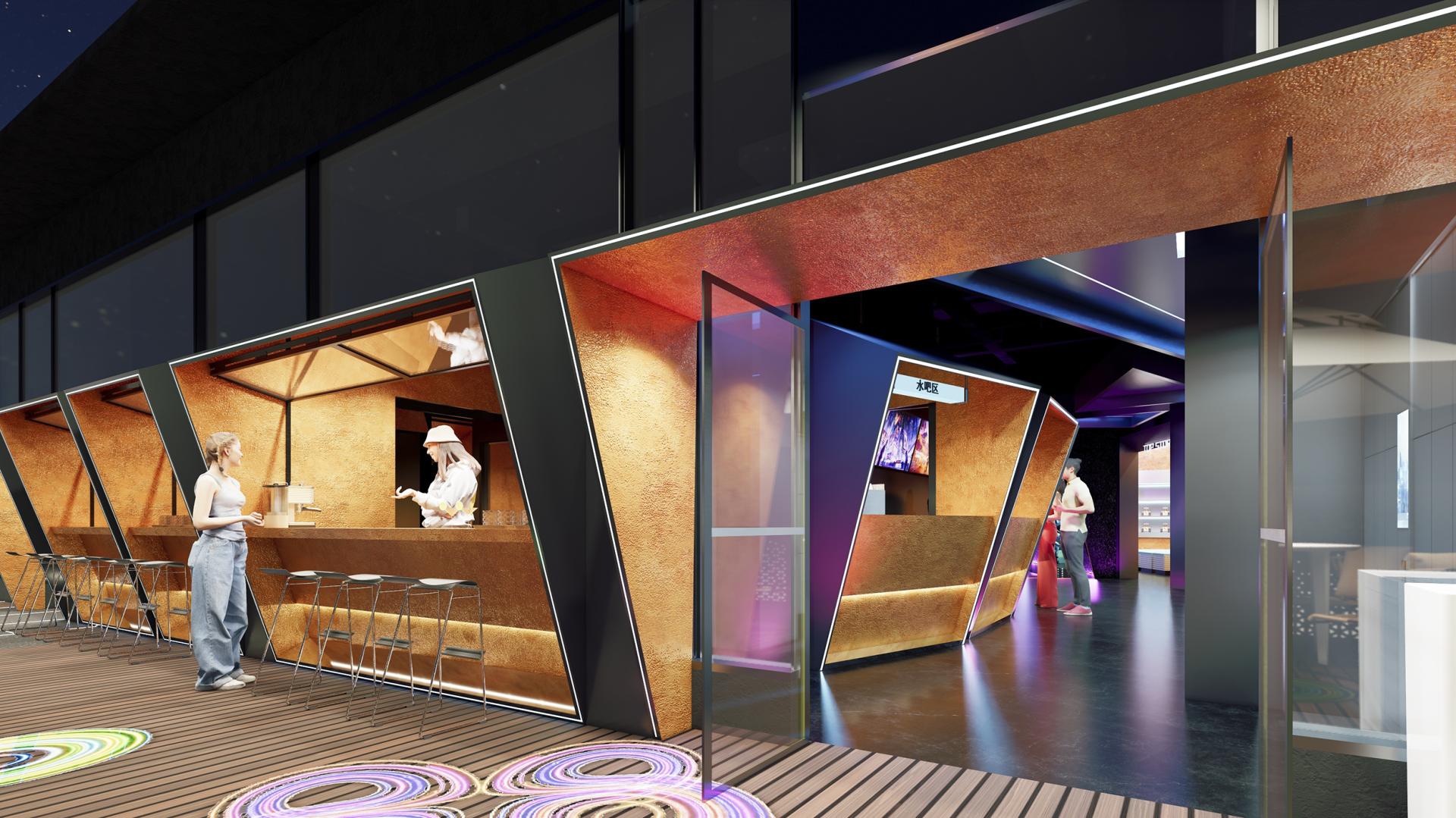 The entrance features a "Time Tunnel"—a sculptural passage crafted from fluid, laser-cut aluminum composite panels, their precisely bent curves enhanced by dynamic lighting to evoke the thrill of stepping into the future. Inside the main hall, custom-oxidized gold-tinted panels and high-saturation red-blue metal finishes create a striking cyberpunk aesthetic, their iridescent gradients achieved through durable acrylic-composite layering—balancing spectacle with longevity.
