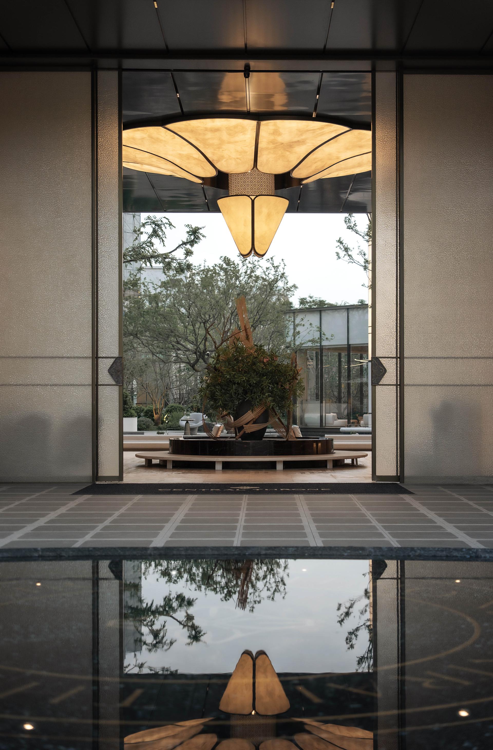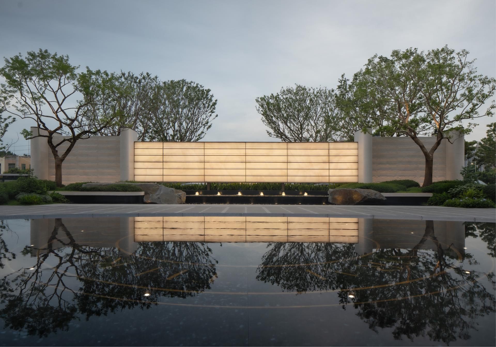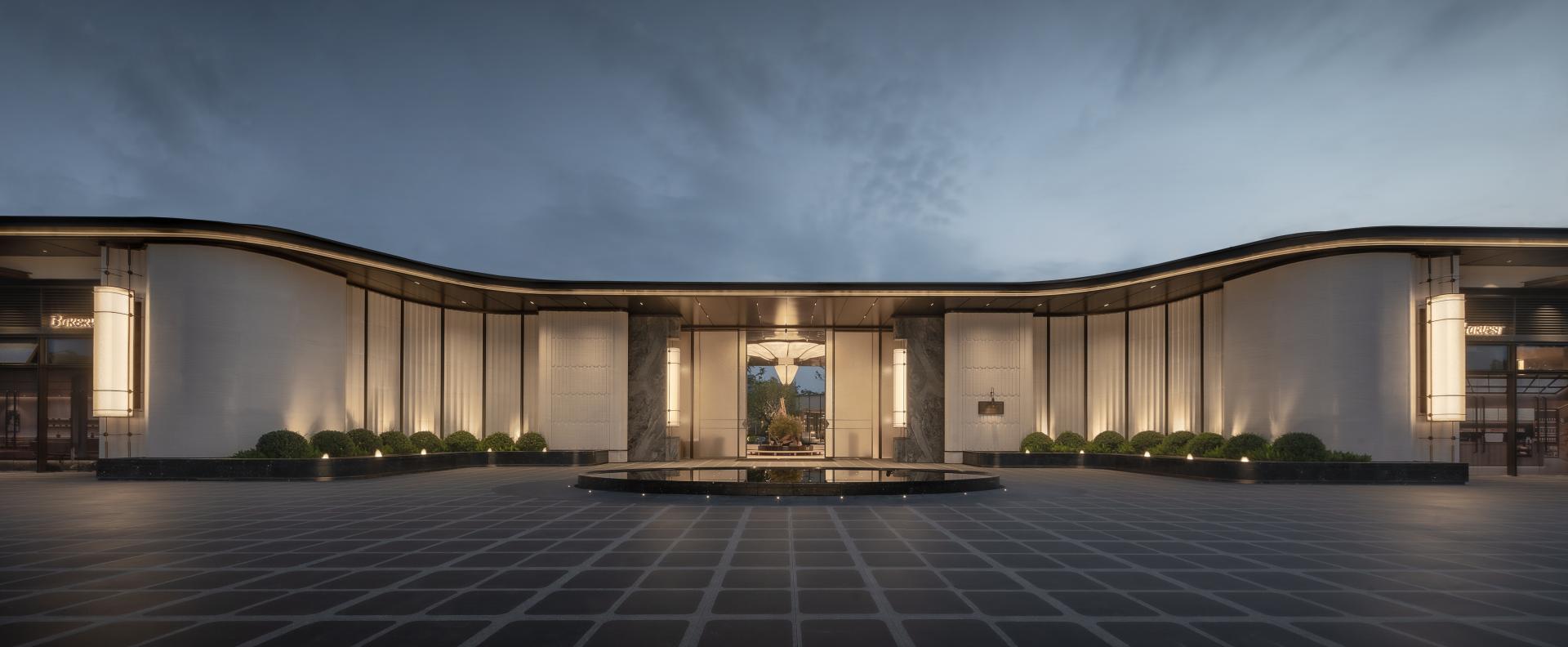 A 26-meter ceremonial wall defines a grand urban threshold. Art glass with a jade-like texture creates an elegant translucent screen, while the intricately patterned stone plaza evokes the ambiance of a five-star arrival. At its heart, a black crystal water plate—reminiscent of the ancient bi-disc (ceremonial jade) that symbolizes safety and harmony—shimmers with star-green veins, blending tranquility, auspicious charm, and a quiet sense of rooted identity into the entry sequence.