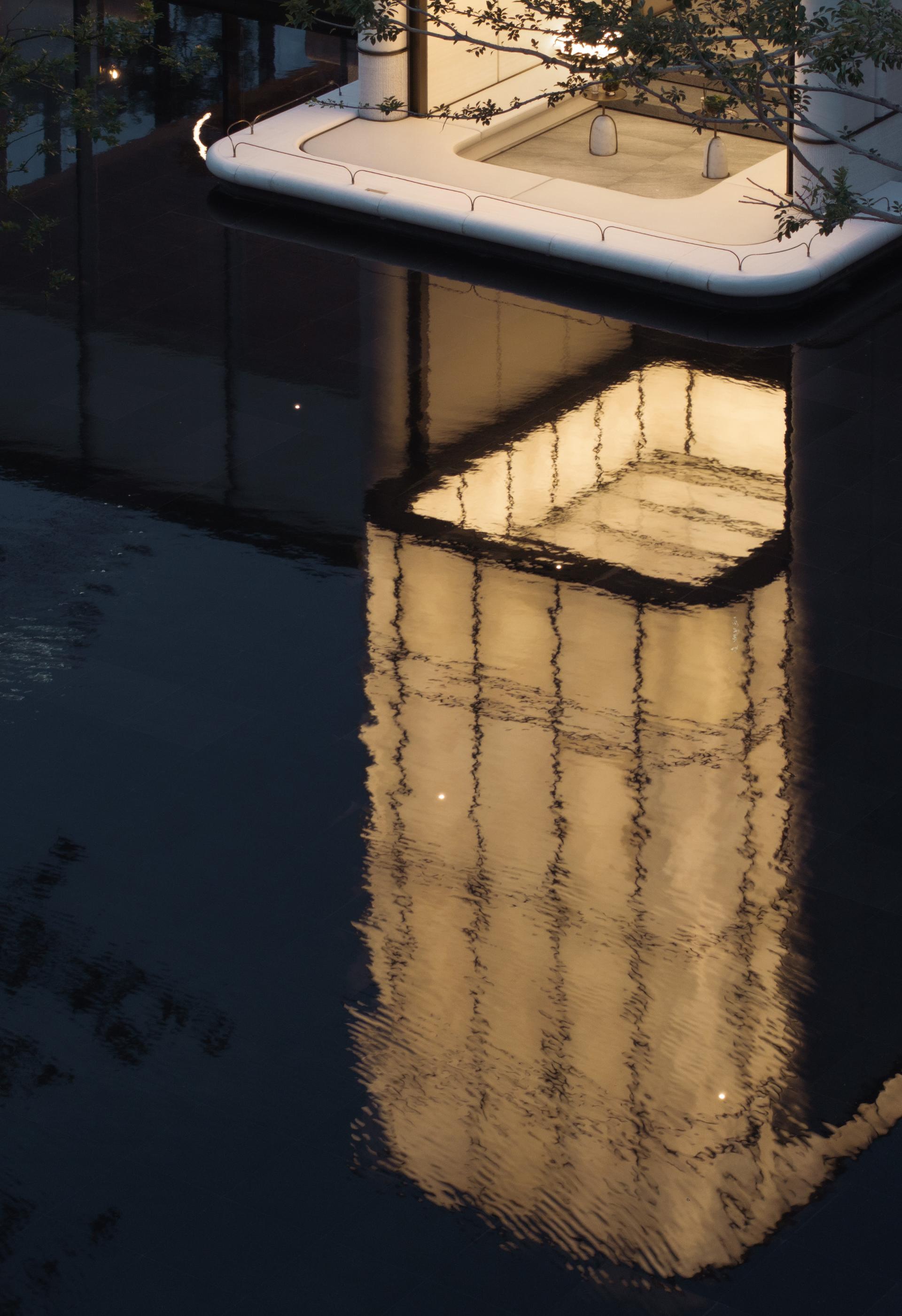 Inspired by CHANEL’s aquatic runways, mirrored waters reflect the crystalline Light Tower and rippling waves, creating an immersive stage. At the center, the transparent tower faces the grounded Tea Pavilion—a play of light and solidity. This balance of movement and stillness evokes Yin-Yang harmony, inviting pause, visual appreciation, and social interaction.