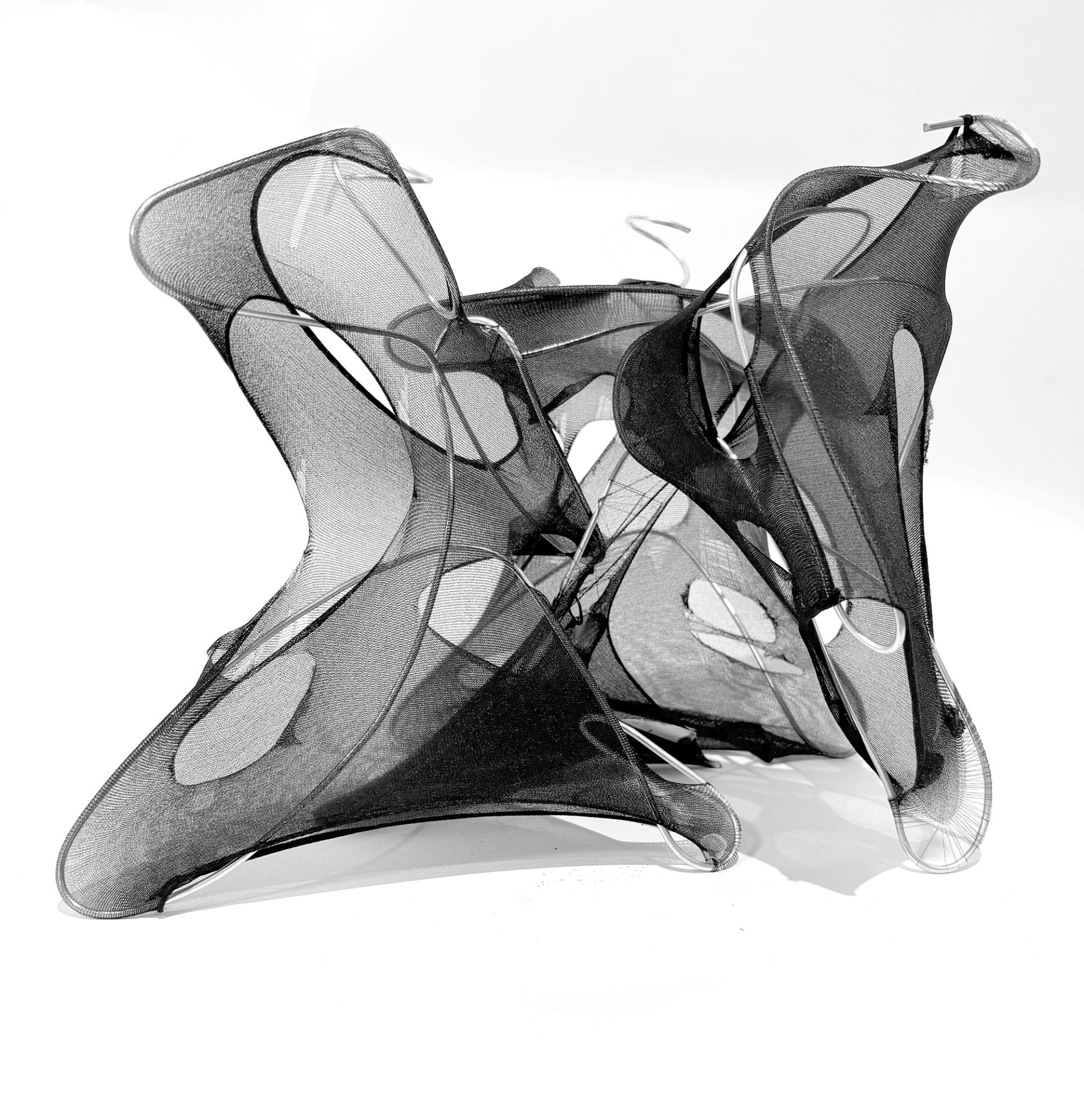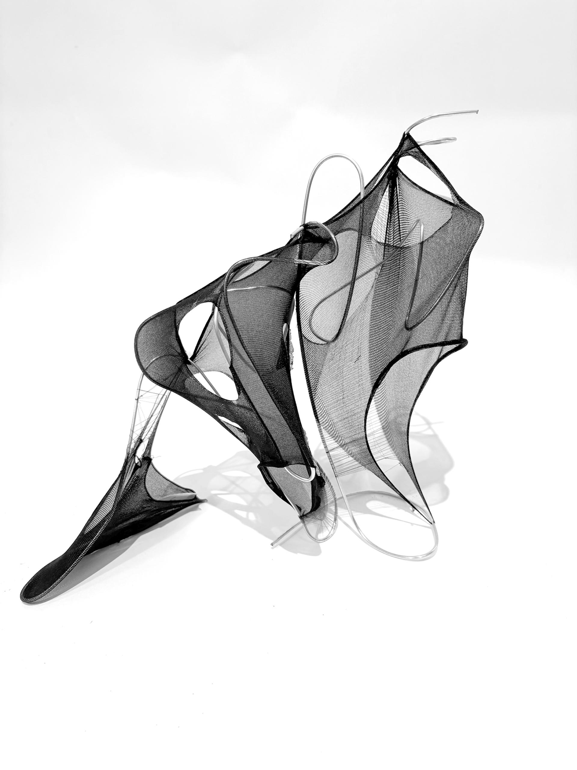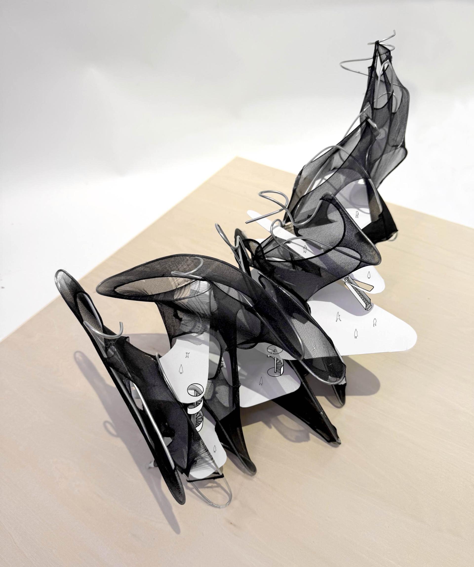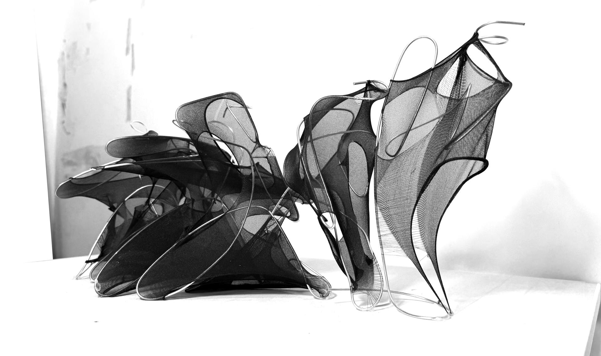From these drawings, I built seven abstract figures using iron wire, bending and shaping it to capture the underlying structure of each pose. Black stockings were stretched over the wire to create volume and surface, their tension echoing the strain and release in the motion itself. I left certain areas open to let light, air, and shadow move through, giving the forms a sense of breath and openness.