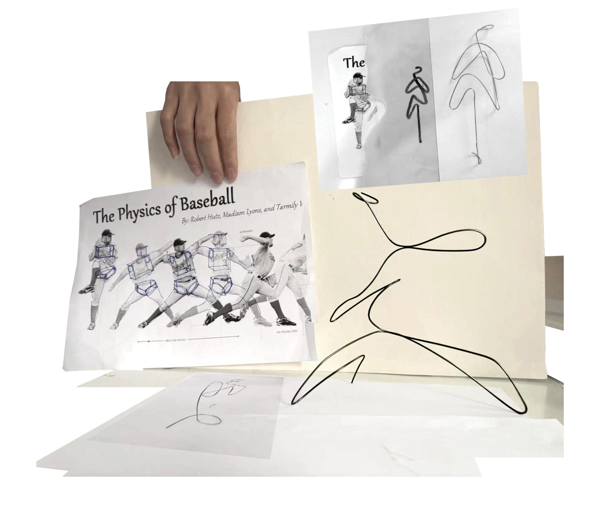 This project explores how a moment of human movement can be transformed from a flat image into a physical space people can experience. I started with a video of a baseball pitch and chose seven key frames that showed the shifting posture of the body as the motion unfolded. In each frame, I traced the figure to find the main lines of tension, direction, and balance. I then simplified these into smooth, flowing curves that expressed not just the pose, but also the energy and rhythm of the body in motion.