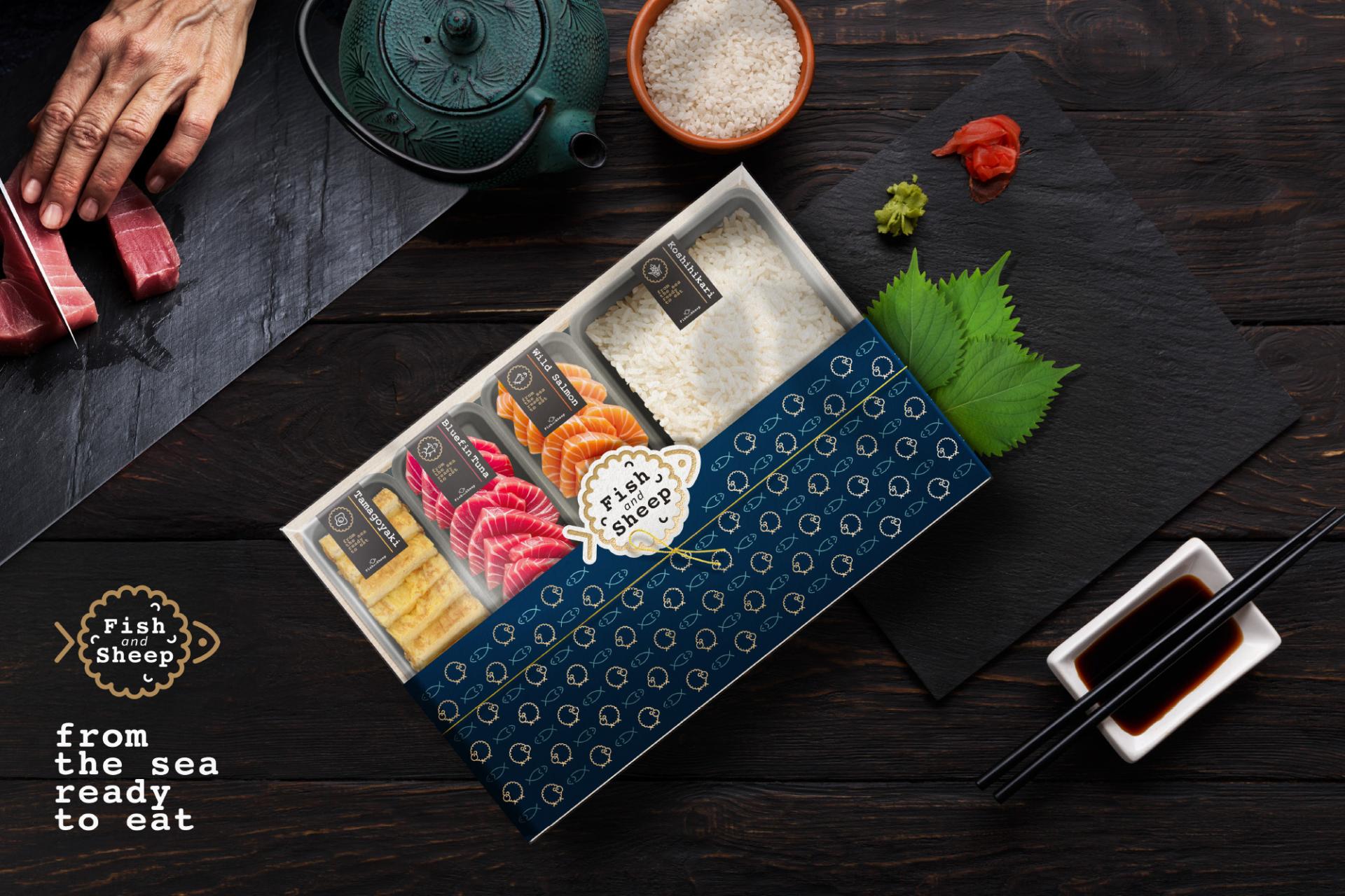 Our packaging is wrapped in a deep ocean blue, evoking depth, purity, and freshness. Inside, ingredients are arranged in neat, individual compartments made from sealed trays, ensuring hygiene and preventing flavors from mixing. The orderly presentation enhances appetite appeal, while the fish-and-sheep pattern printed on the lower section subtly reinforces the brand’s story.