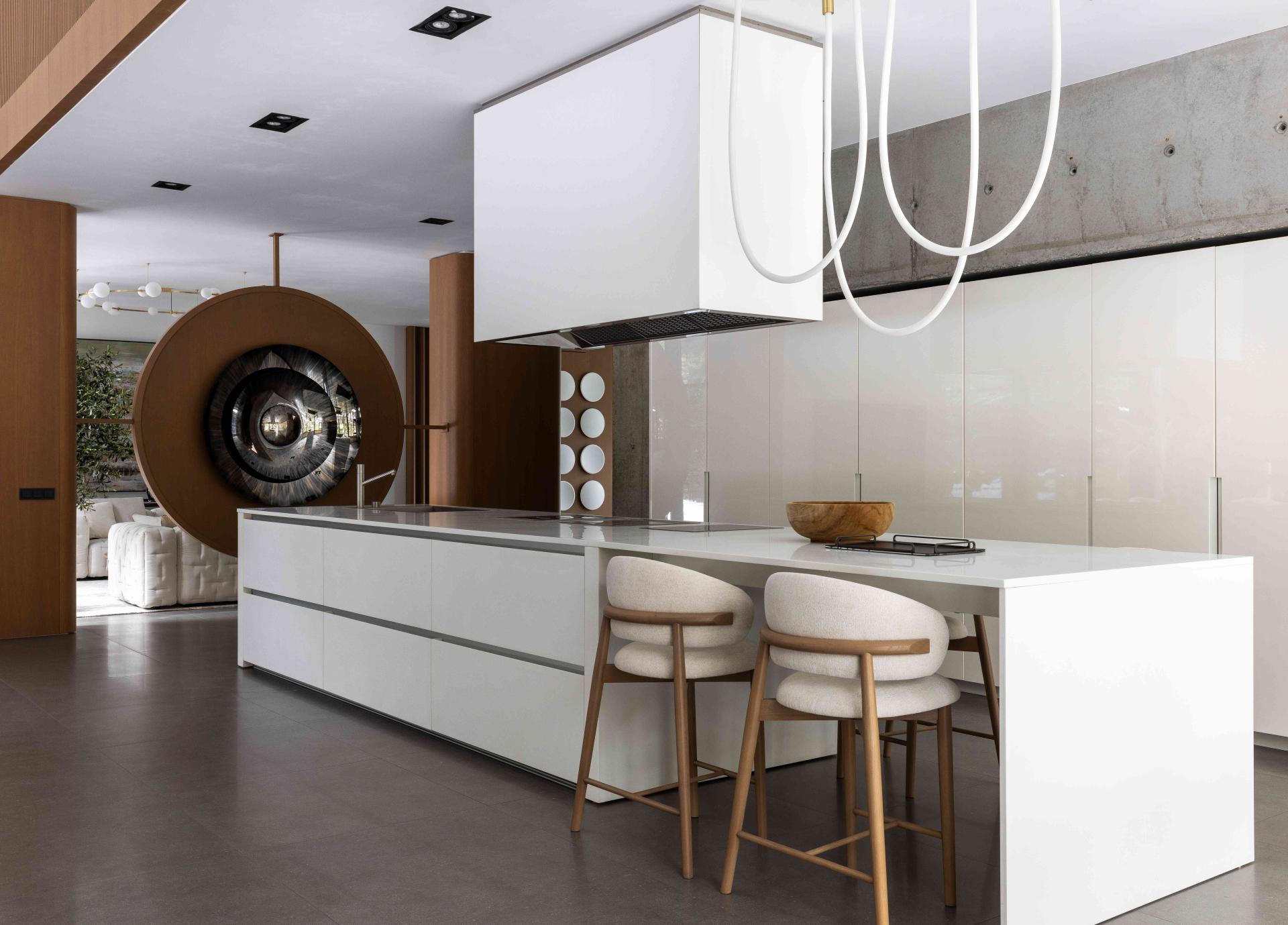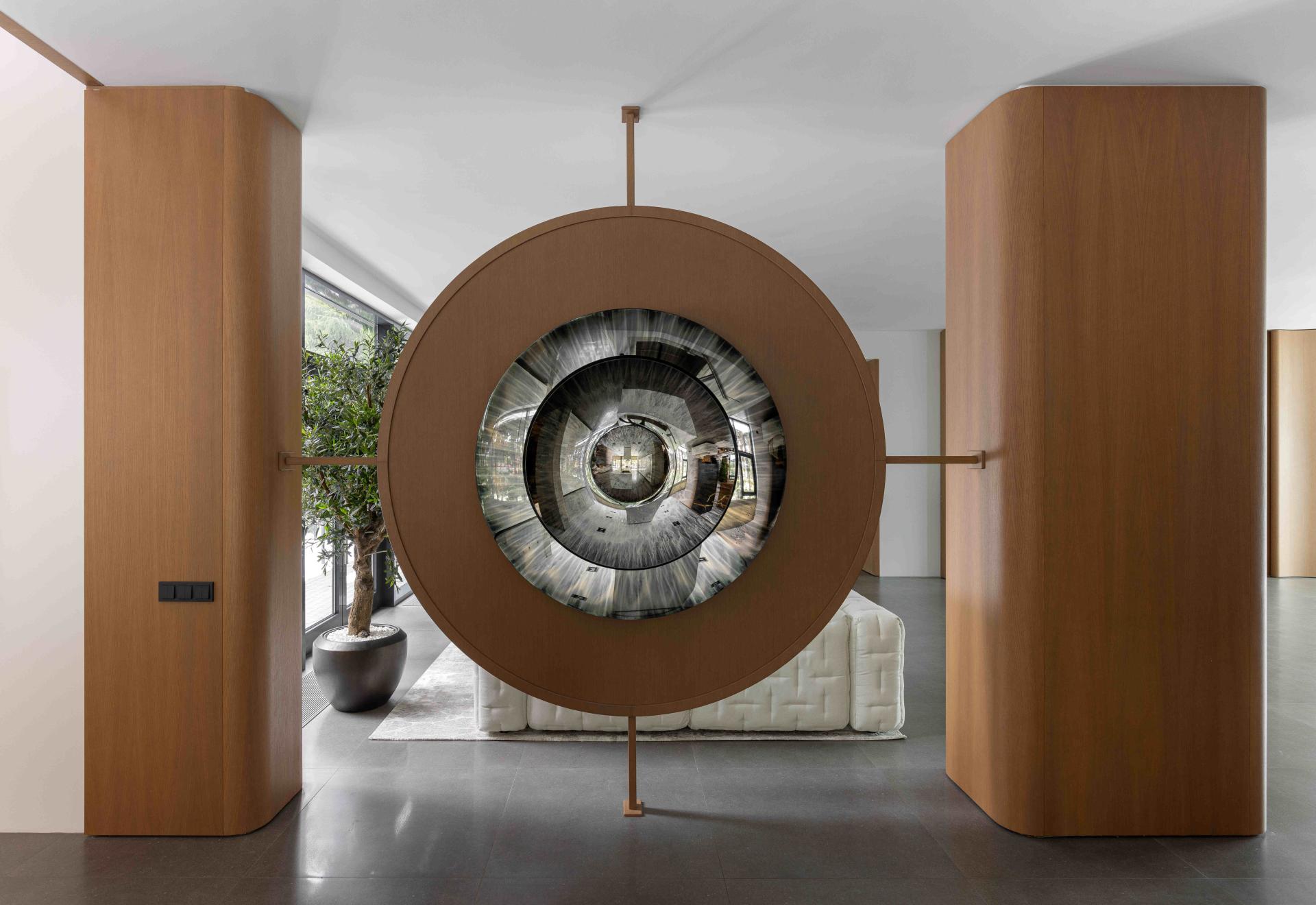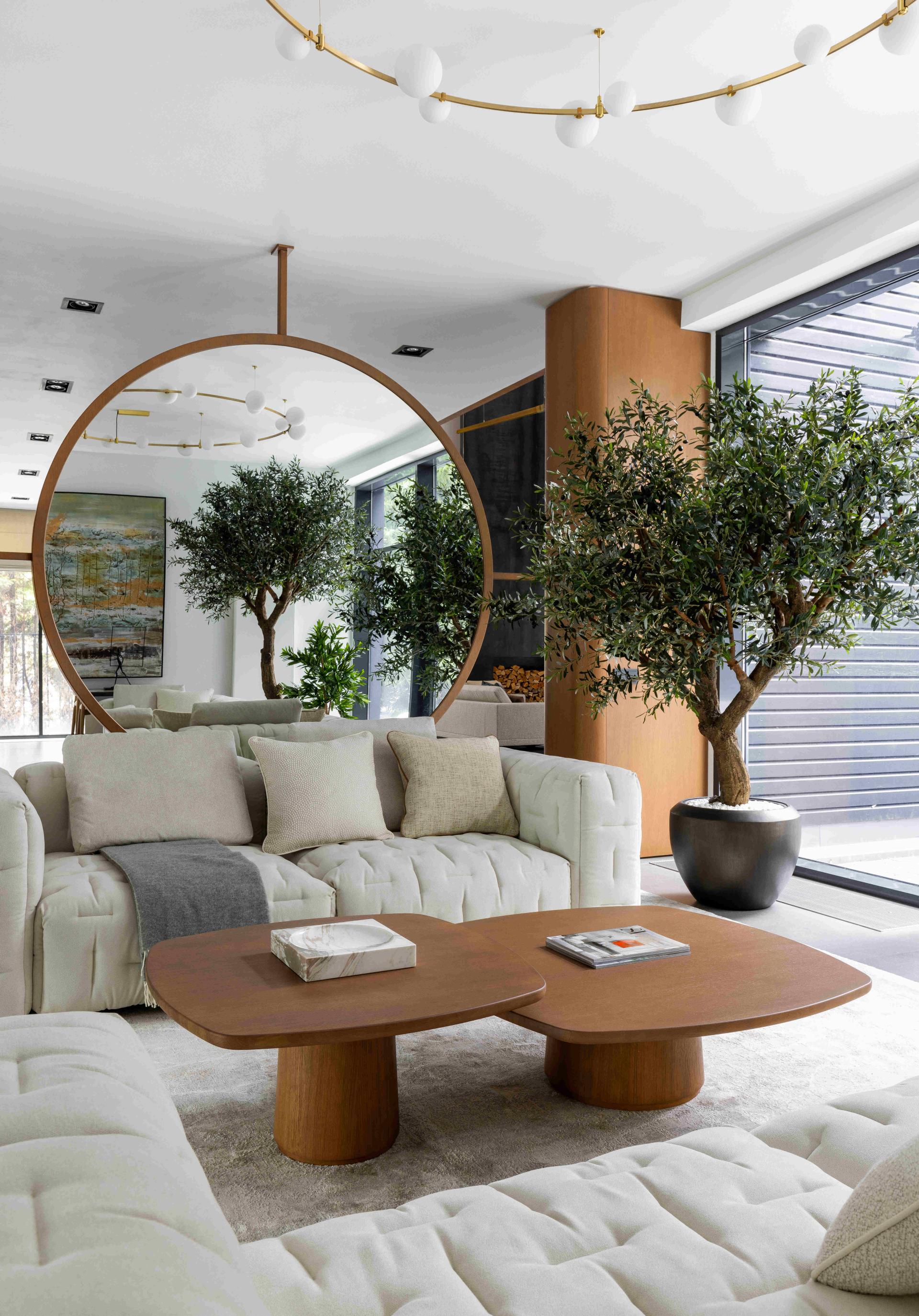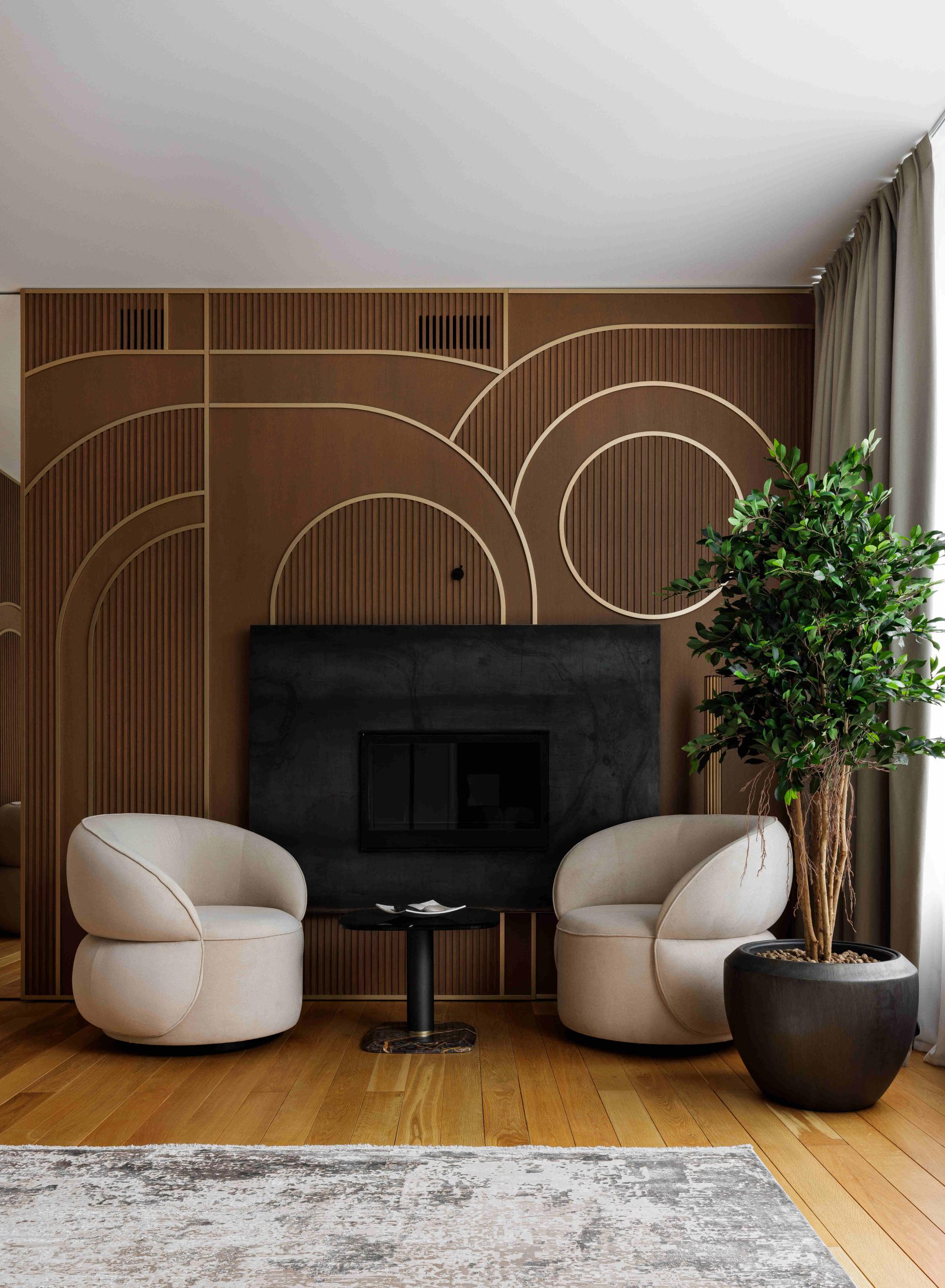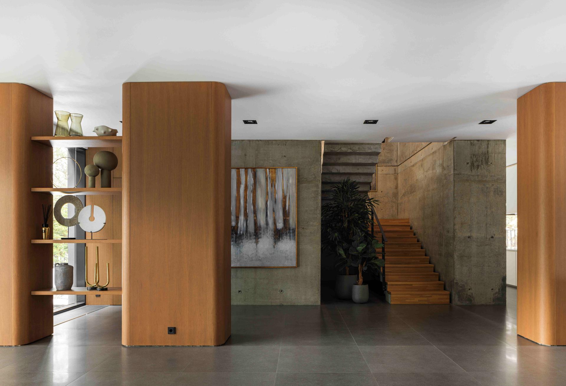 The customer asked to make the interior cozy, family-like and stylish, and at the same time universal. This concept is perfectly matched with one of the signature style of our studio Nature. The main principles of interior conception were symmetry, natural materials, light and decor. In the decoration and furniture, we used oak, elm and anegri veneer. They visually softened the interior, which initially had a lot of concrete and white, and made it tactilely pleasant. The lighting in each zone includes several separate scenarios depending on the situation. Unique custom-made decorations include some paintings by famous authors and a unique mirror disk made of glass and wood with internal lighting. They harmoniously complemented the image of the house, giving it completeness.