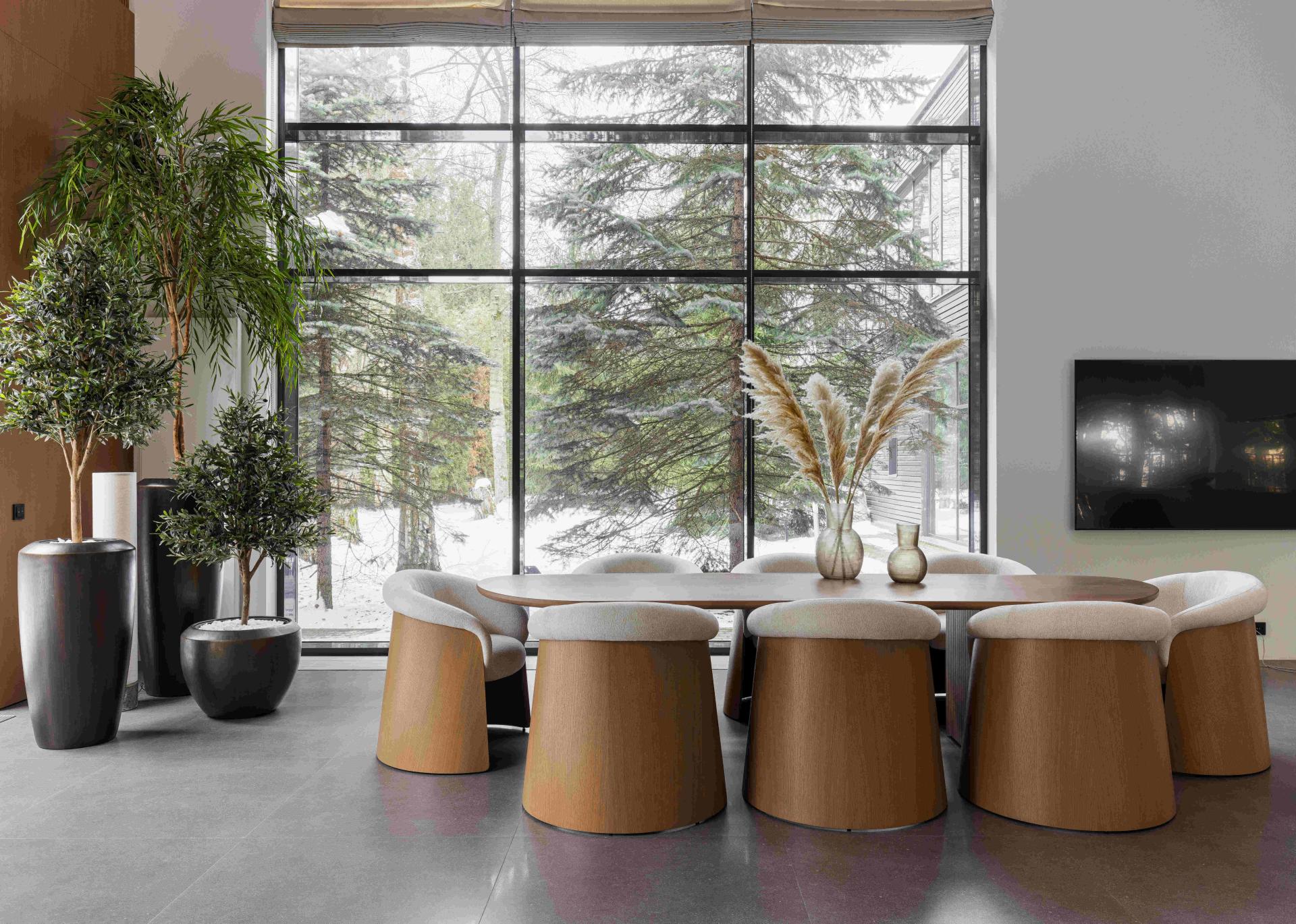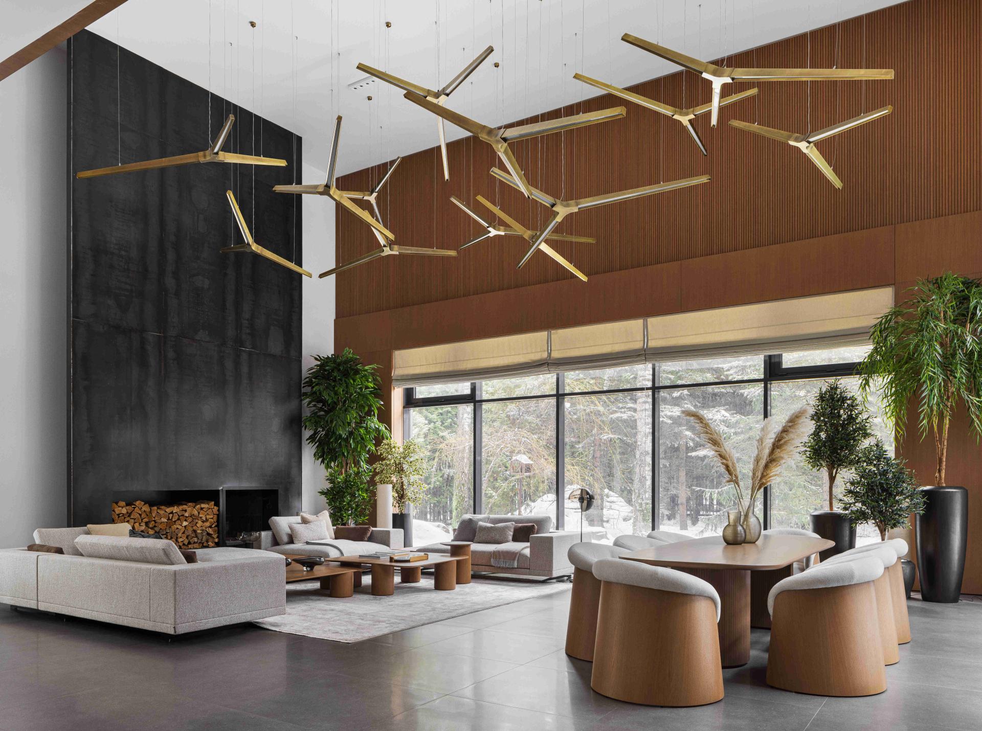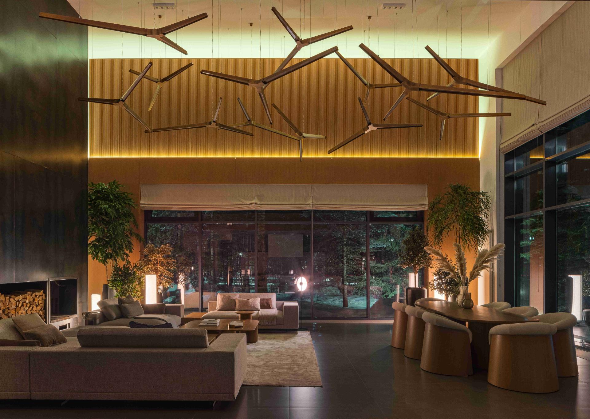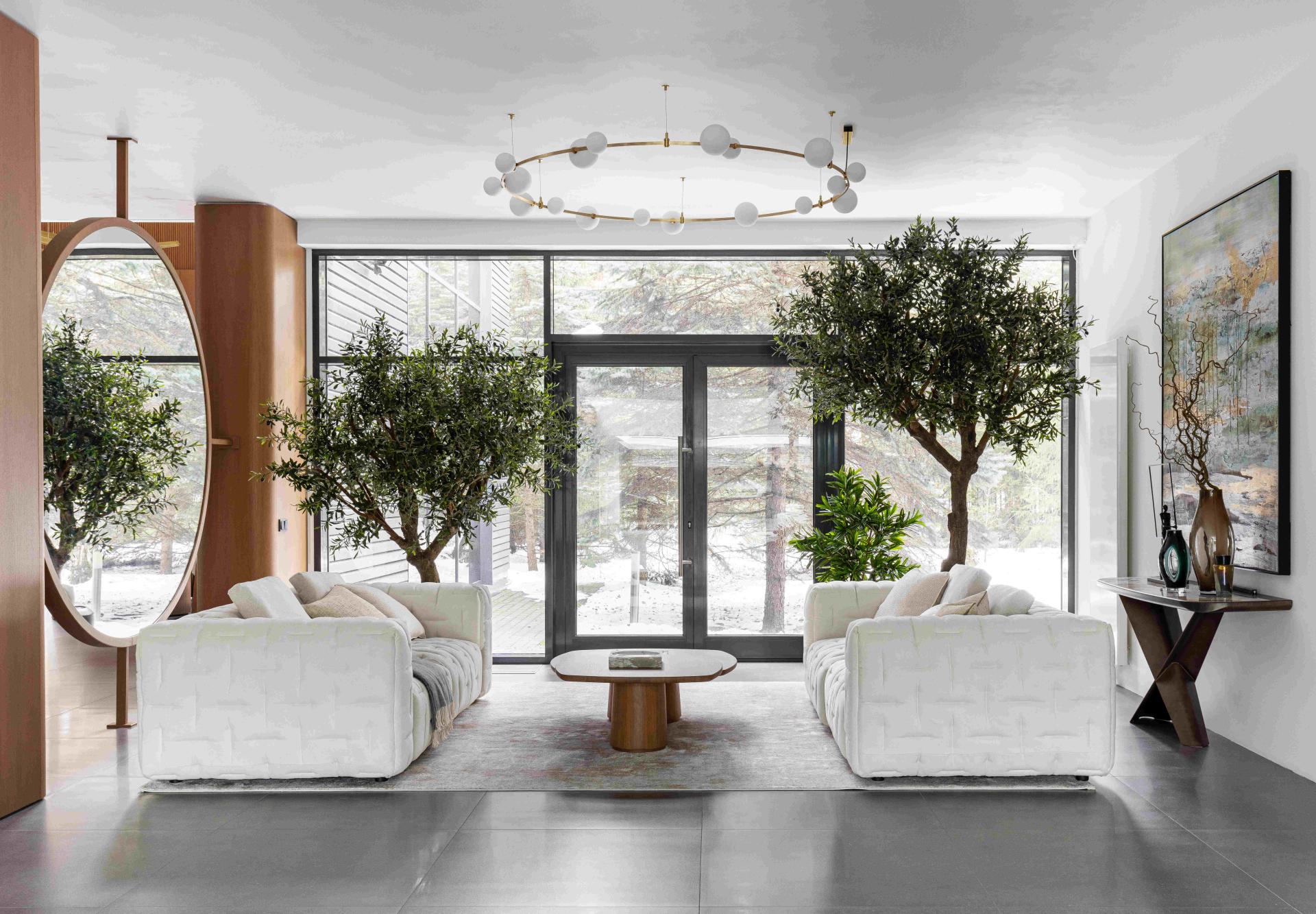 The two-storey house over 1000 m2 in the Laikovo cottage complex is built on a forest plot surrounded by pine trees, and its interior is a harmonious continuation of the natural theme. The house has a public area with a kitchen-living room, a gym and an office, and private suites with dressing rooms and bathrooms for the owners and guests.