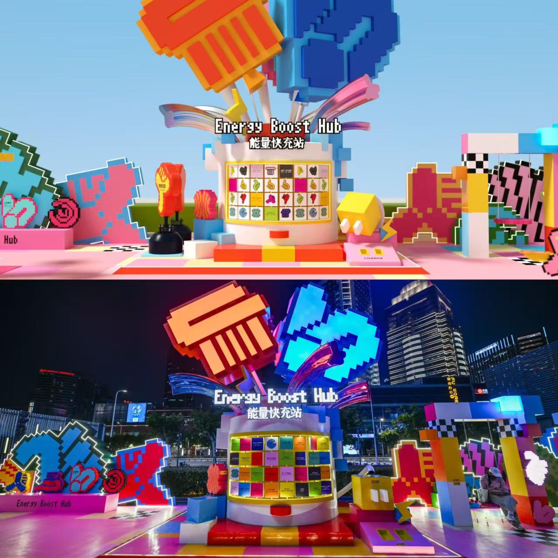 “Energy Boost Guide” is an urban-scale art installation that reimagines how commercial architecture can merge art, technology, and public engagement. Inspired by the concept of an “energy station,” the design transforms Shanghai Century Link Tower into a vibrant hub where visitors are invited to recharge both visually and emotionally. Through the use of bold sculptural forms, vivid pixel-inspired aesthetics, and programmable lighting systems, the project creates an immersive cultural landmark that speaks to the digital generation and resonates across both physical and virtual dimensions.