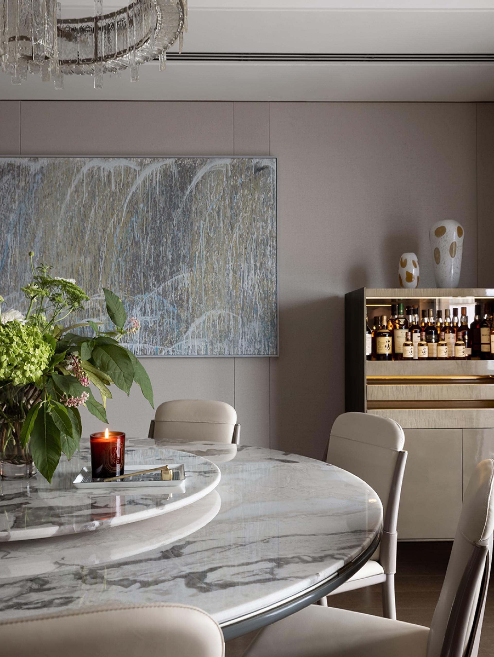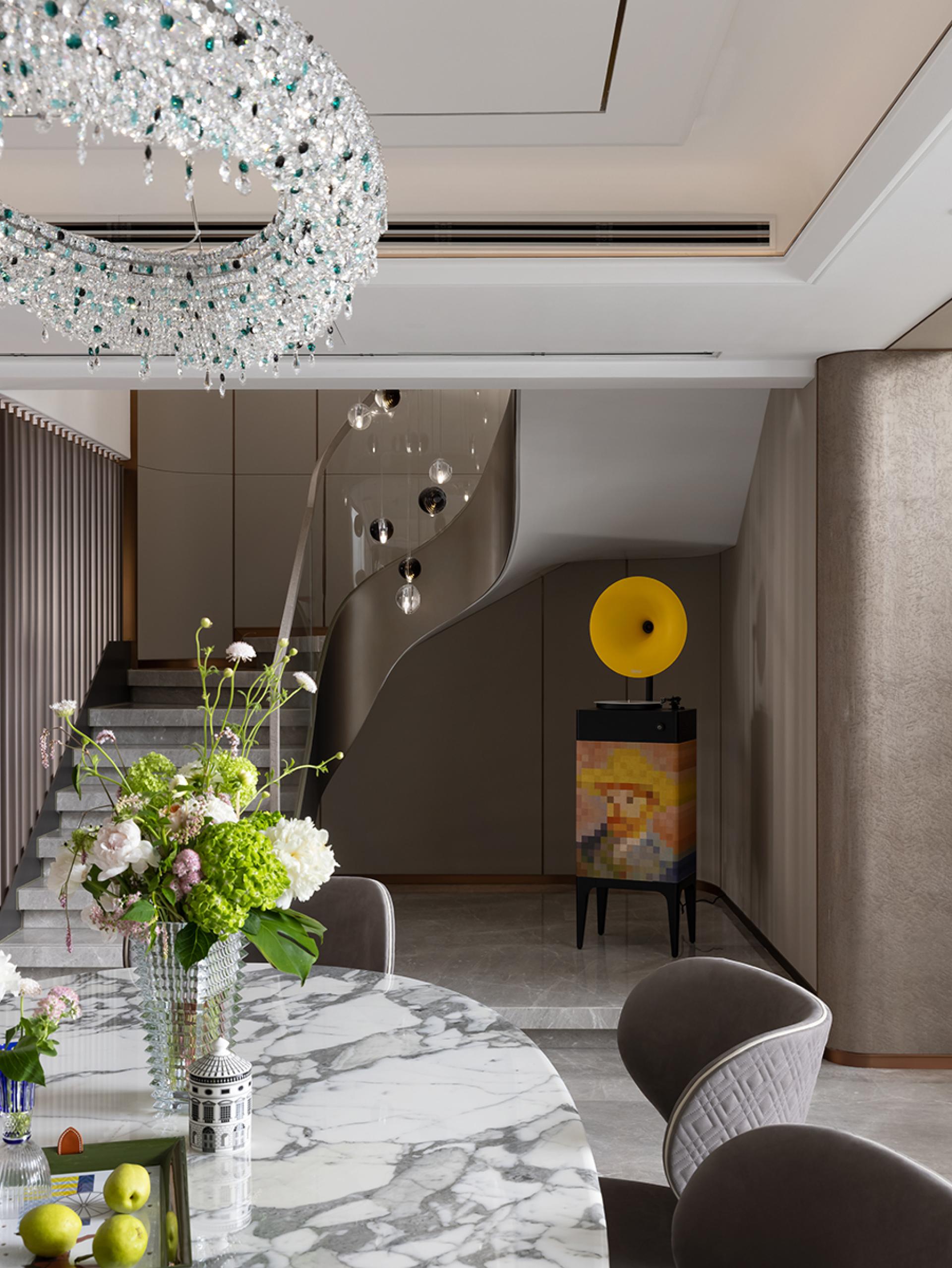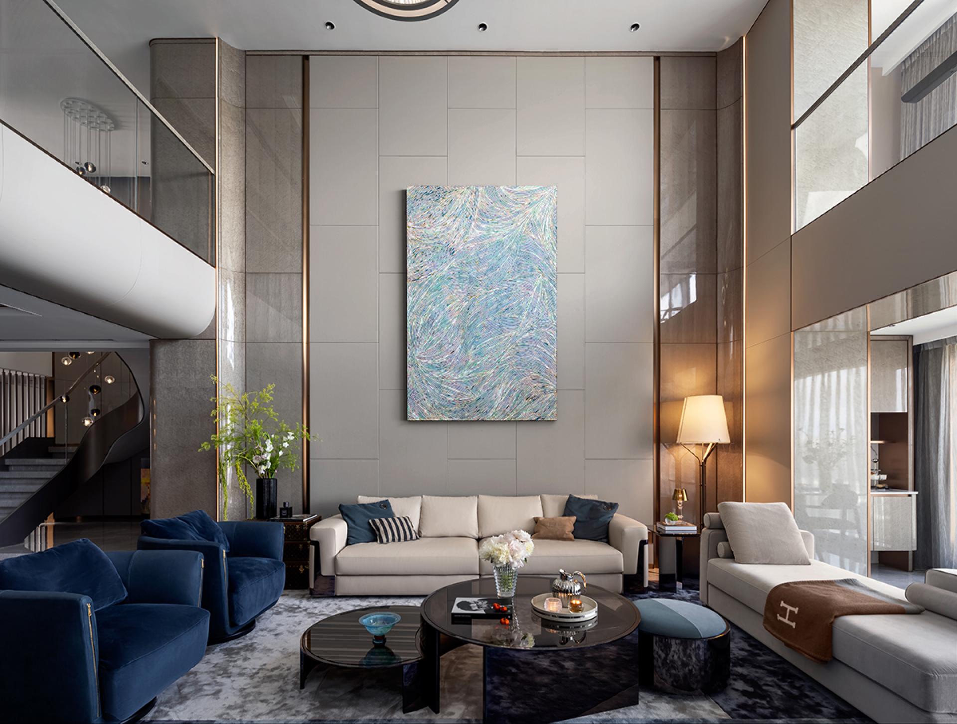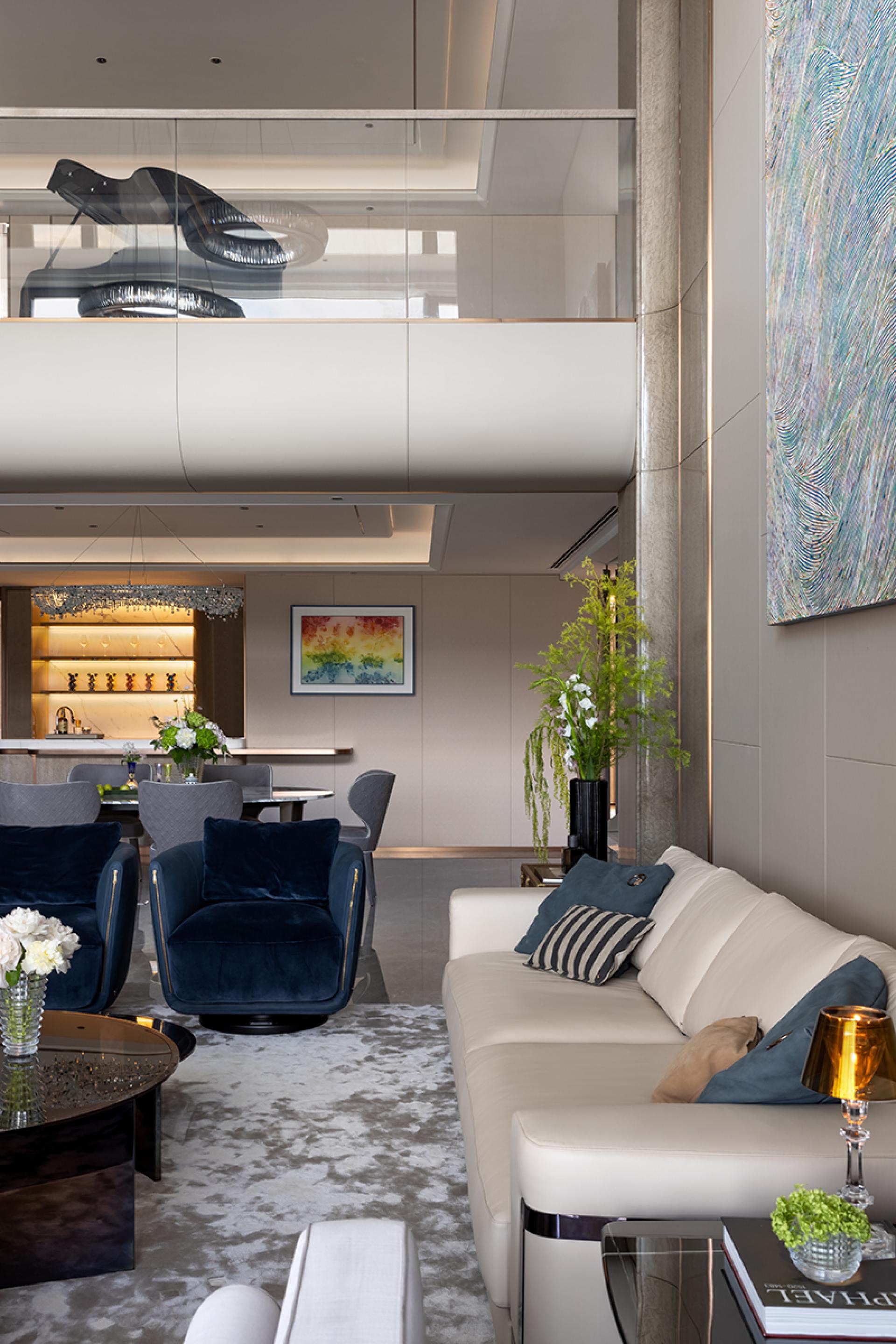 Mansions on the bund in Fuzhou is located on the core waterfront of the Minjiang River, enjoying front-line river views and the prosperity of the urban CBD. With the core design concept of "Artistic Luxury in Harmony, Magnificence as a Poem", it creates a 650-square-meter duplex private residence for top-tier figures. Centered on the cultural context of the Minjiang River, the exquisite and luxurious decorations are combined with modern people's needs for life, integrating elegance and luxury with fashion and modernity. It depicts the owner's elegant and noble identity, and also reflects the concept and attitude towards a high-quality life.