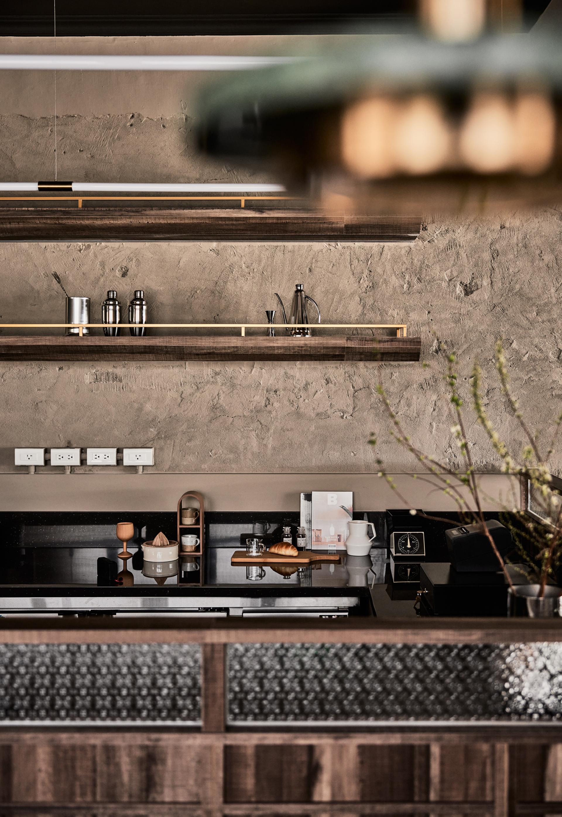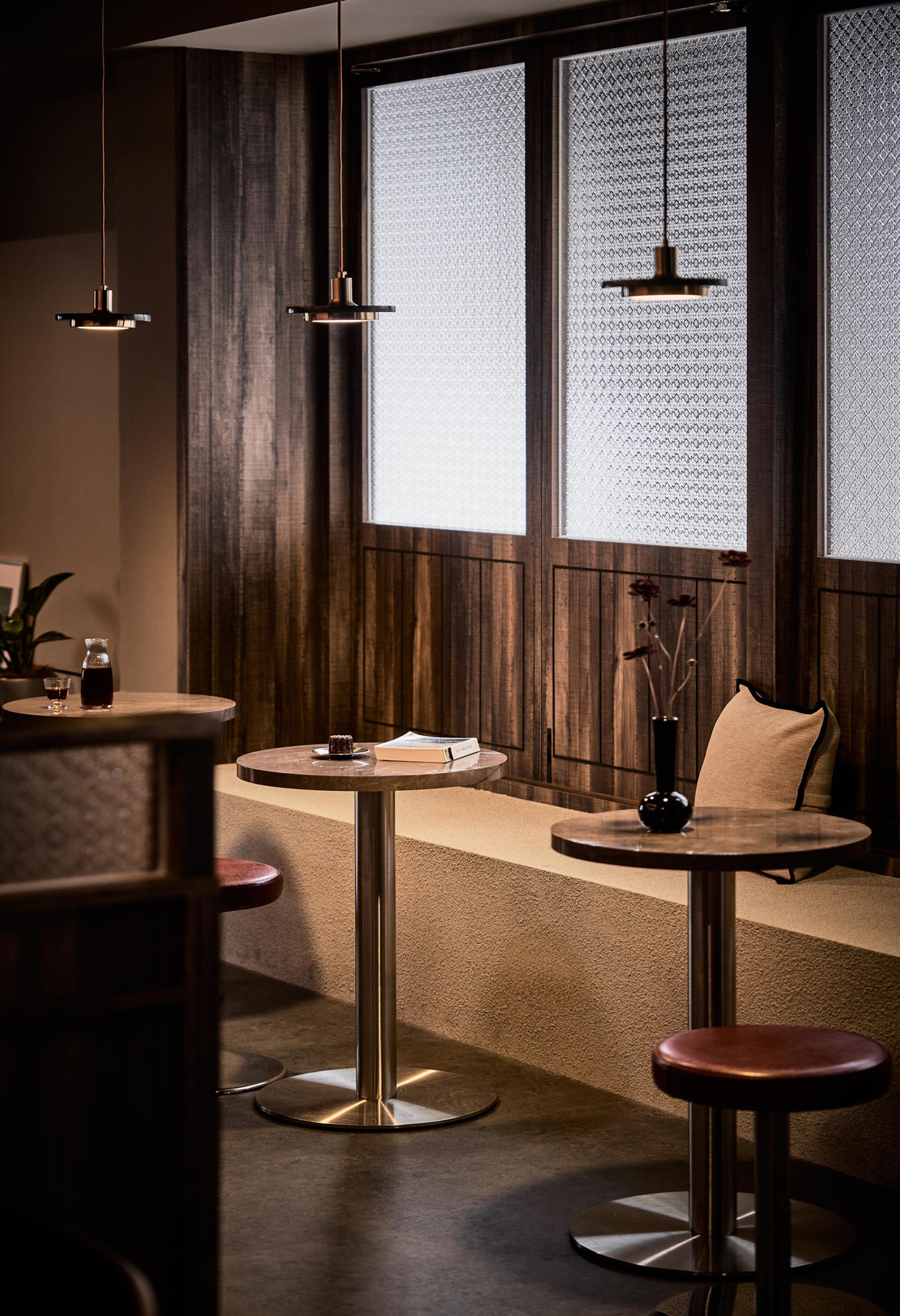 Open low windows and large glass panels bring in the flow of people and vehicles from the alley across the street, creating a daily scene of mutual gaze between inside and outside. Opening the window reveals the view, while closing it creates its own scenery. Lighting is used to define the focal point of the indoor space. Custom-made brass tubes form a square pendant light suspended above the bar area, echoing the hardware of the shelves. This unifies the material vocabulary, creating a cohesive overall feel, seamlessly transitioning from the daytime ambiance of coffee and light conversation to the nighttime ambiance of wine and whispered conversations.