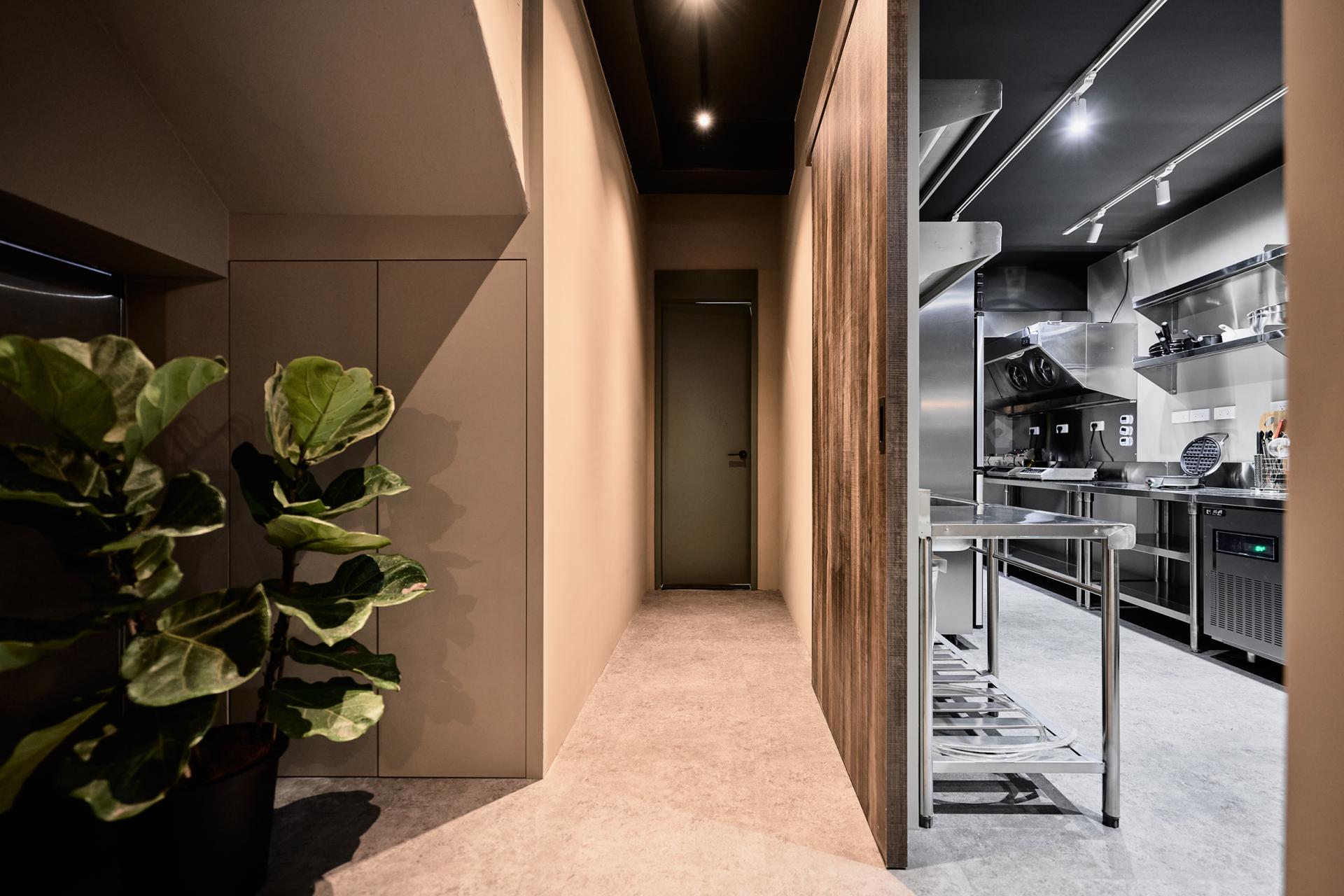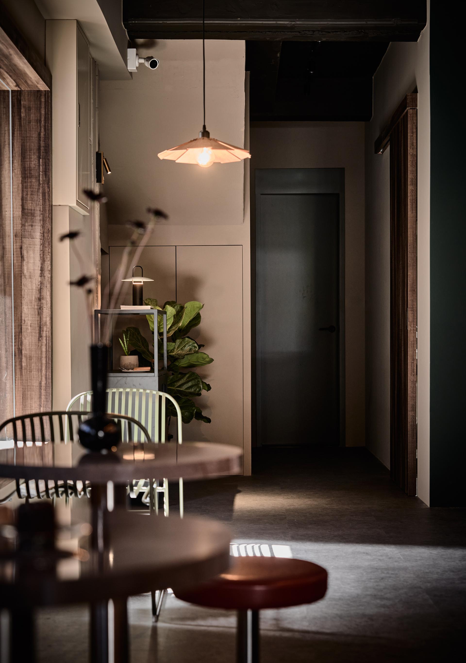 Less is more; the translation between old and new does not rely on heavy-handed design. Upon entering, the main wall's rich retro green sets the visual tone, complemented by dark wood, brass, and retro color tones, creating a serene atmosphere for the evening. The ceiling is unified with a deep black paint finish, with exposed pipes also painted to match. The floor uses plastic tiles in the same color scheme, creating a balanced and consistent visual rhythm.
