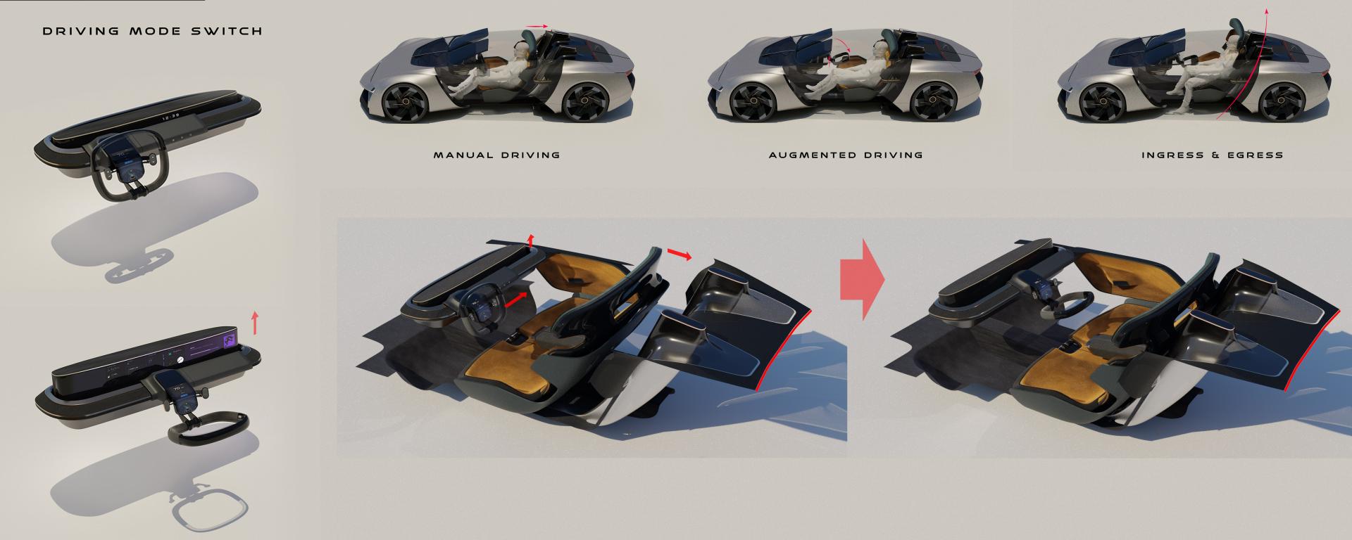 The vehicle offers both Manual and Autonomous driving modes, giving drivers the choice to take control during the most exhilarating moments, and relax during more routine stretches. The transition between these modes is more than a technical shift—it physically transforms the interior. The movement of the steering wheel creates two distinct spatial configurations, adapting the cabin to the user’s needs and enhancing comfort.