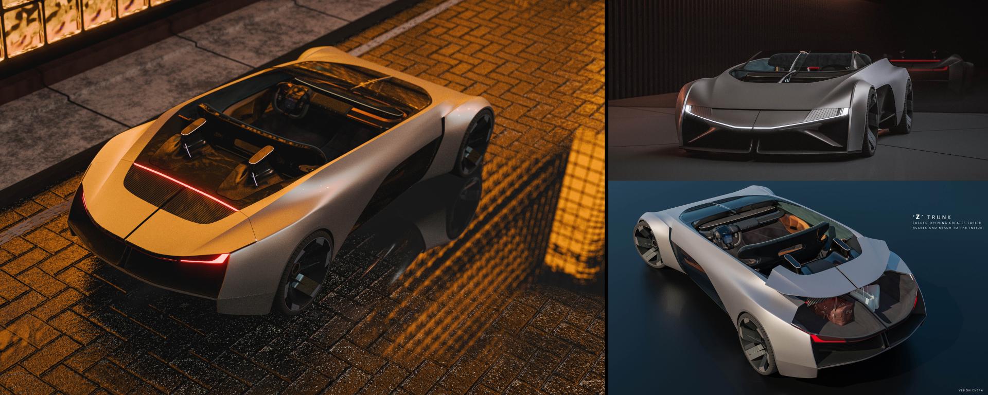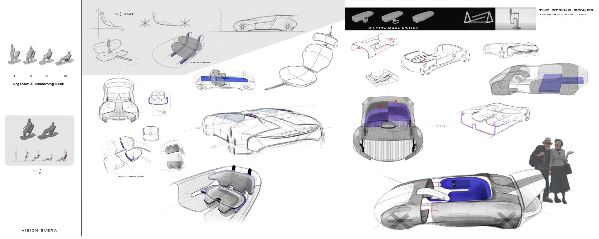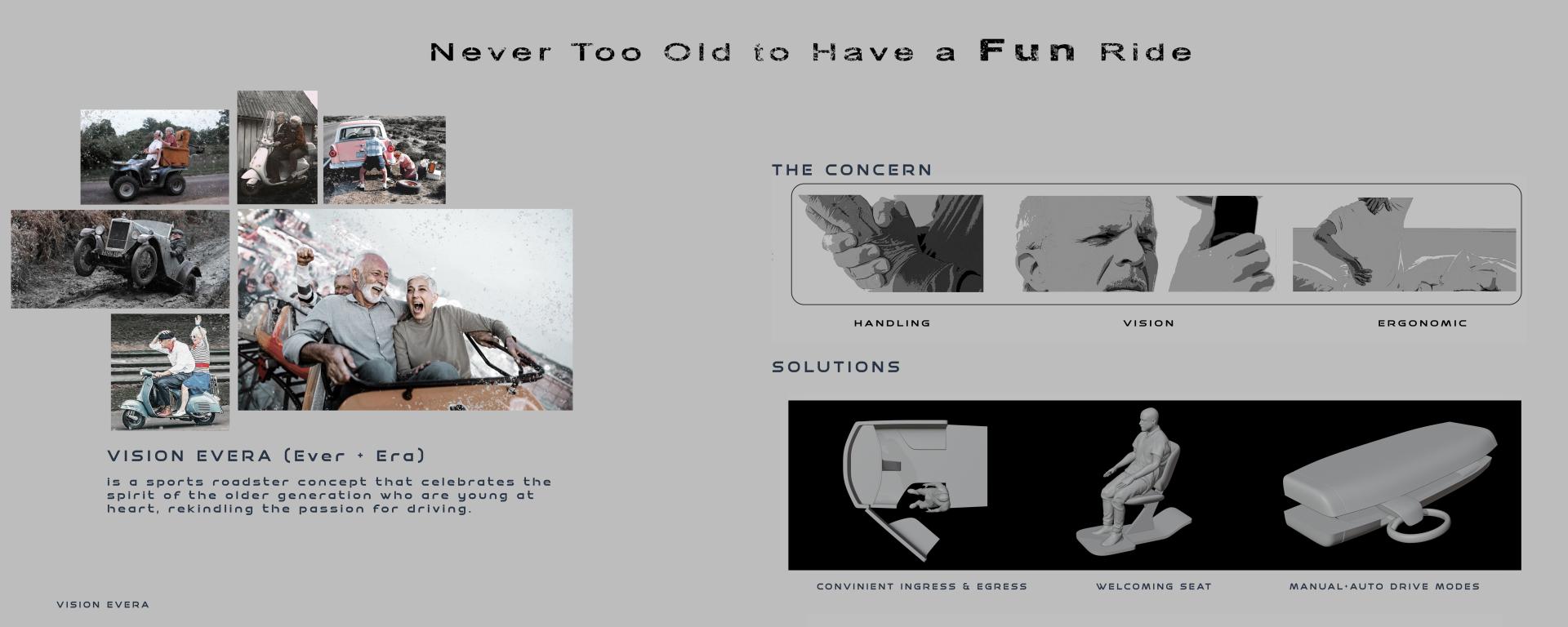 VISION EVERA (Ever + Era) is a roadster concept that offers the elder generation an opportunity to rediscover their passion through the joy of driving. In today’s world, the emotional needs of older adults are often overlooked—mobility solutions tend to prioritize function over feeling. VISION EVERA challenges this norm, creating a car that not only meets the physical requirements of elder drivers but also rekindles the thrill, freedom, and sense of identity that driving once brought them in their youth. It is a statement that passion has no age limit, and that inclusivity can live at the heart of high-performance design.