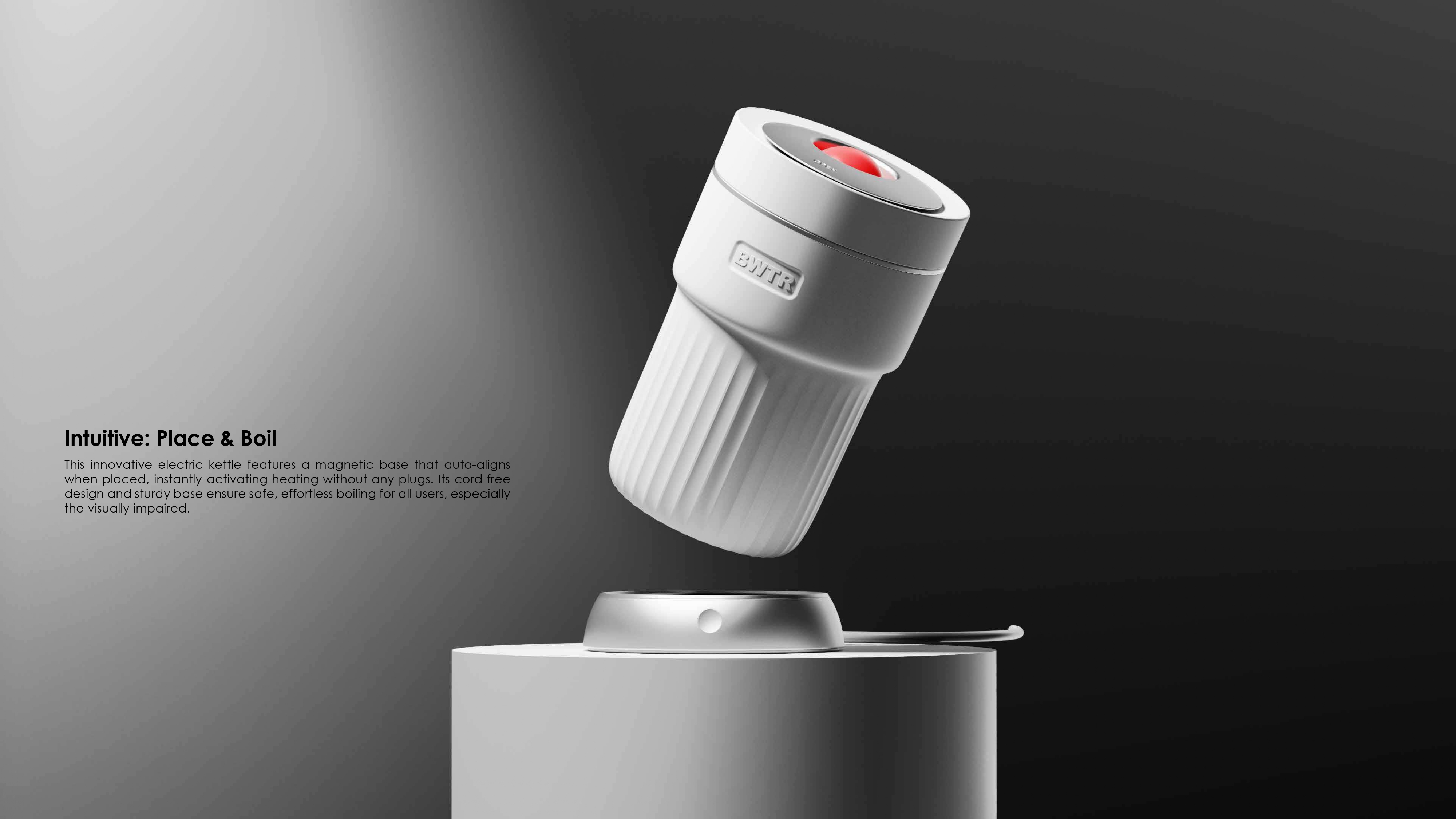 This electric water bottle is specifically designed for individuals with visual impairments, ensuring safe water boiling and drinking. Its primary goal is to redress burn risks and usability challenges caused by the lack of visual cues when handling hot liquids. The bottle features a cylindrical form with a wide, stable base to prevent toppling. It also incorporates an ergonomic grip for secure handling. The design combines elements from ancient Greek pillars and modern minimalism with functional safety.