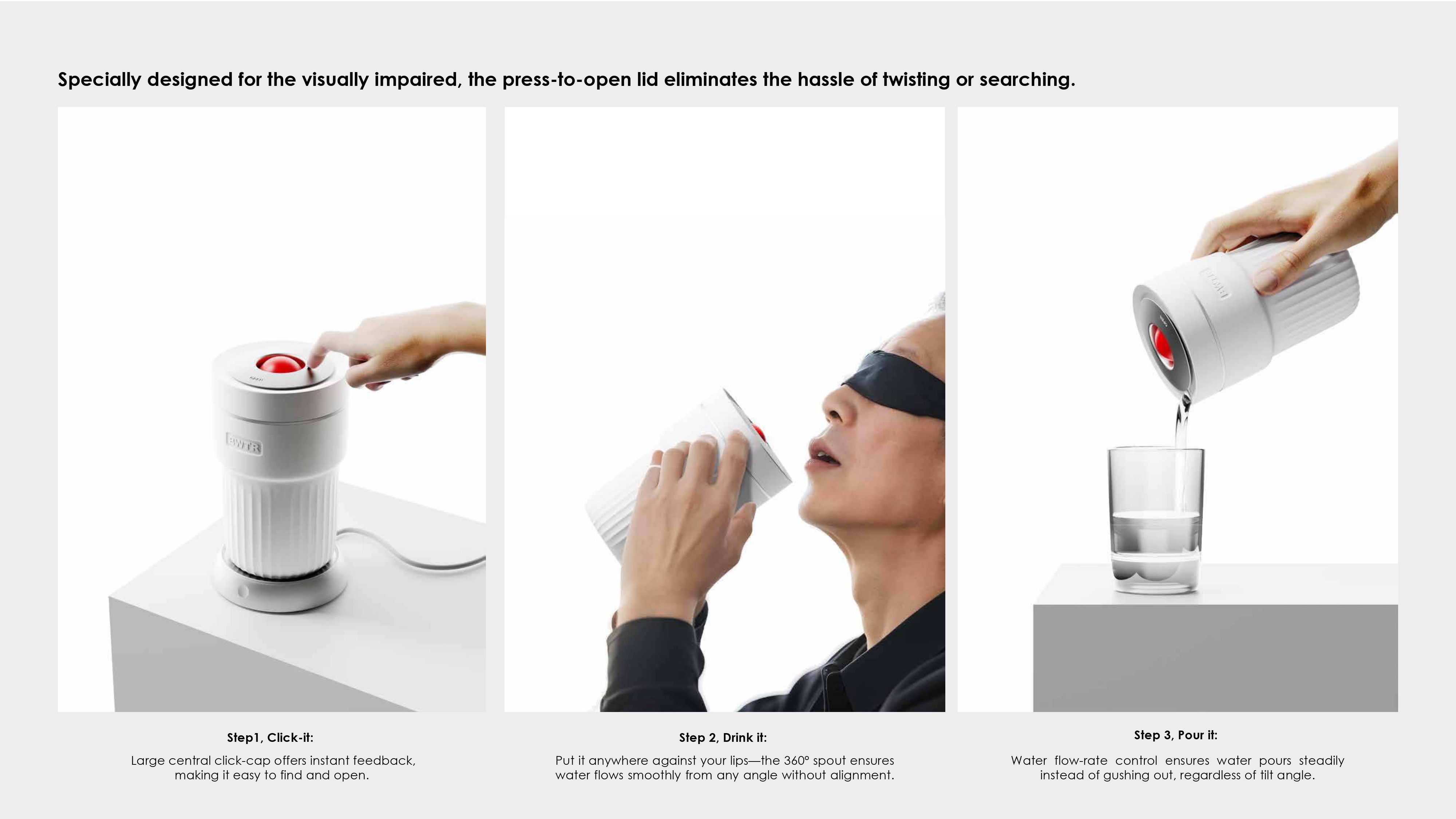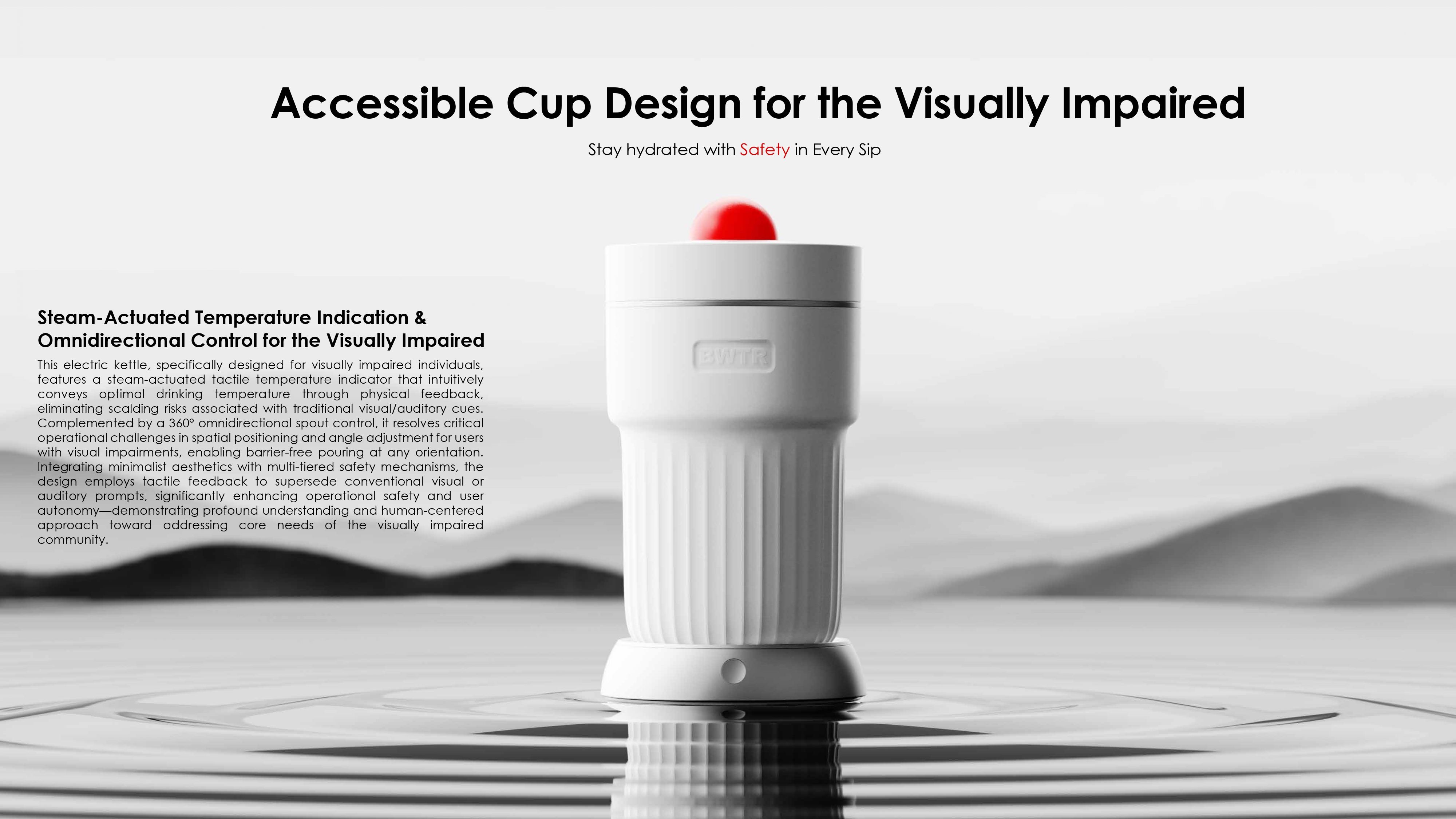A steam-activated ball indicator on the cap rises when the water reaches boiling temperature, allowing users to confirm heat through touch rather than sight (steam, condensation, etc.) Users are able to feel the position of the ball to decipher if the water is at a safe temperature. This design ensures a critical safety advancement over existing electric bottles without temperature feedback and also offers a more intuitive experience compared to digital-sound electric bottles. Additionally, a 360° accessible spout enables drinking from any angle and controls water flow rate, thereby preventing spills. These functions address common pain points for visually impaired users, such as locating a specific spout position or managing tilt angles precisely.