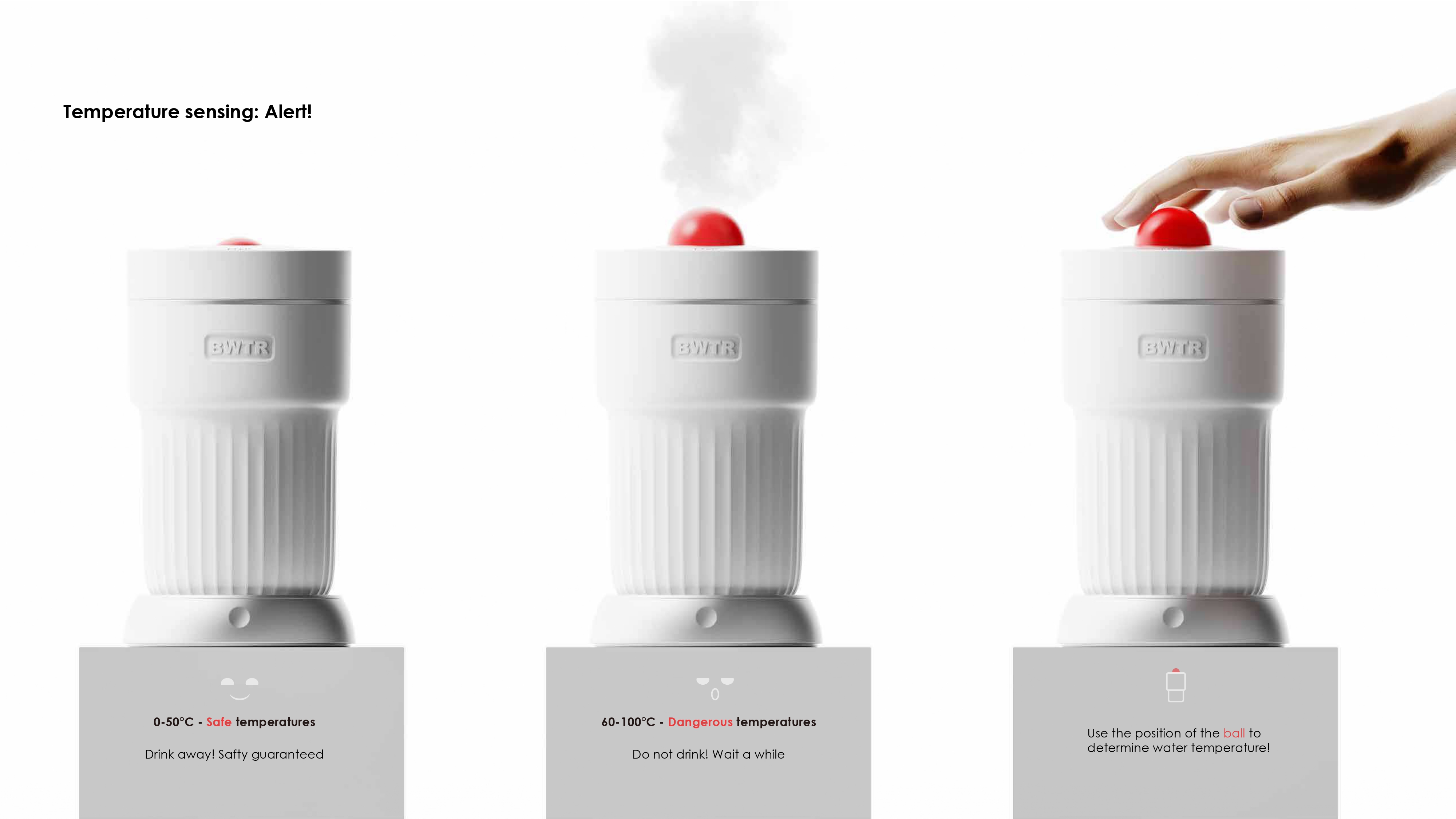 To use this product, the user simply places the bottle on its powered base. As the water temperature rises, water vapour builds up inside the bottle, eventually pushing the ball up after saturation water pressure exceeds the weight of the ball. Heating stops immediately after the water starts to boil and tactile feedback from the ball informs the user if the water is at a safe drinking temperature. The seal is designed to act as a pressure-relief value for maximum safety.