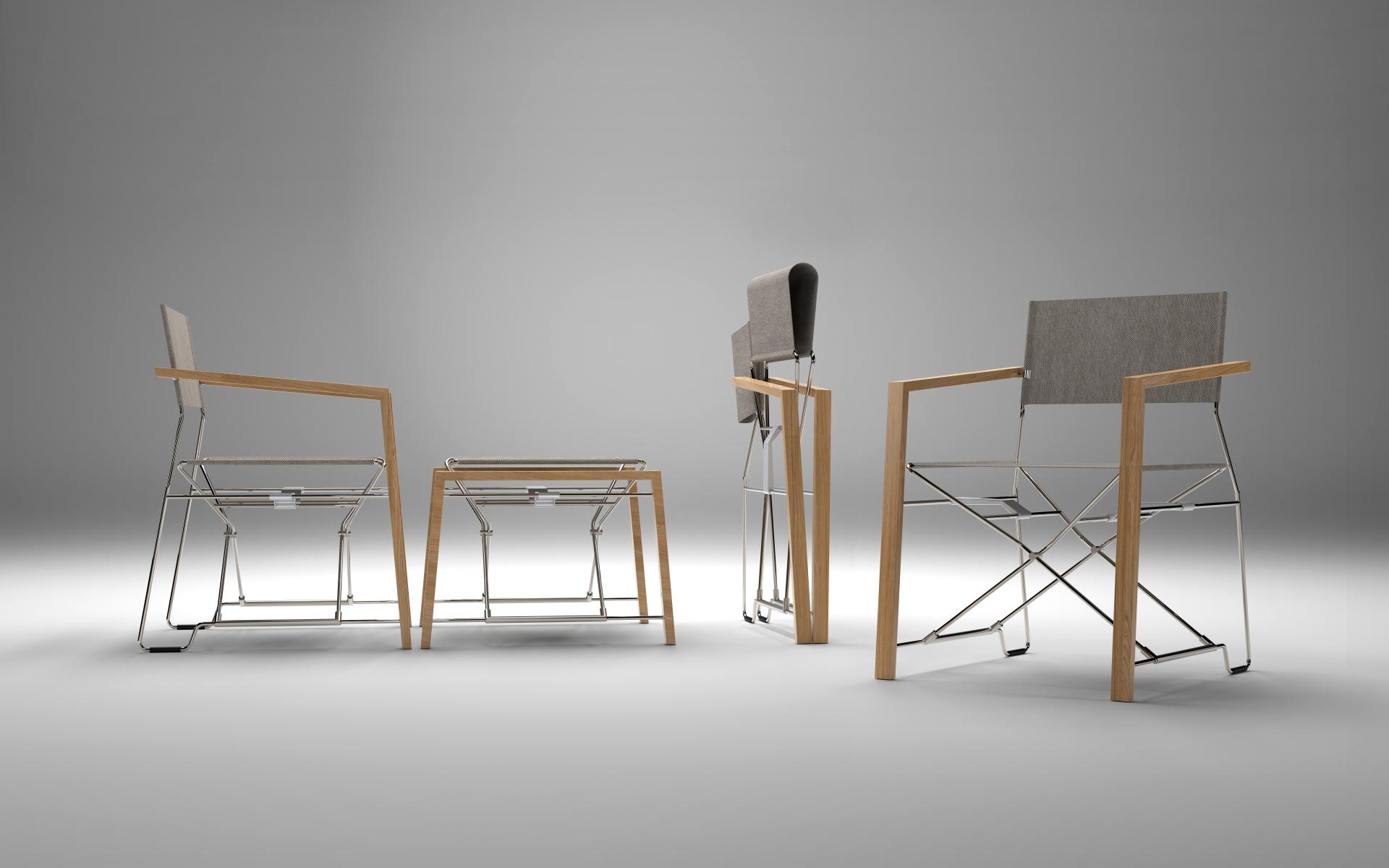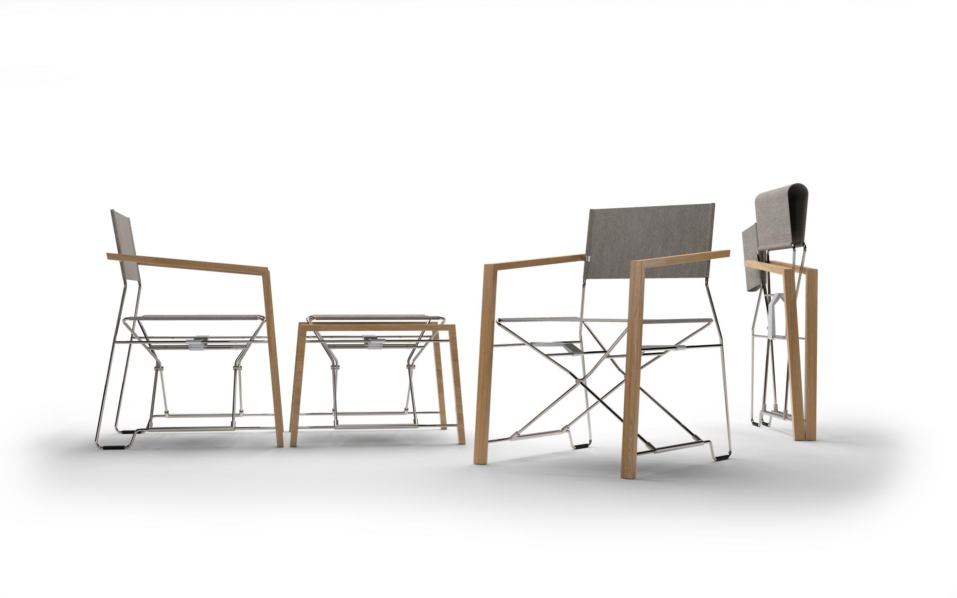 The titanium folding mechanism utilizes classic director's chair X-geometry with a proven over-center locking design, allowing the chair to fold to under 6 inches. Canvas seat and back stretch taut when deployed, creating the iconic director's chair silhouette with contemporary refinement. A matching side table extends the system, serving as an ottoman, stool, or side table as needed.