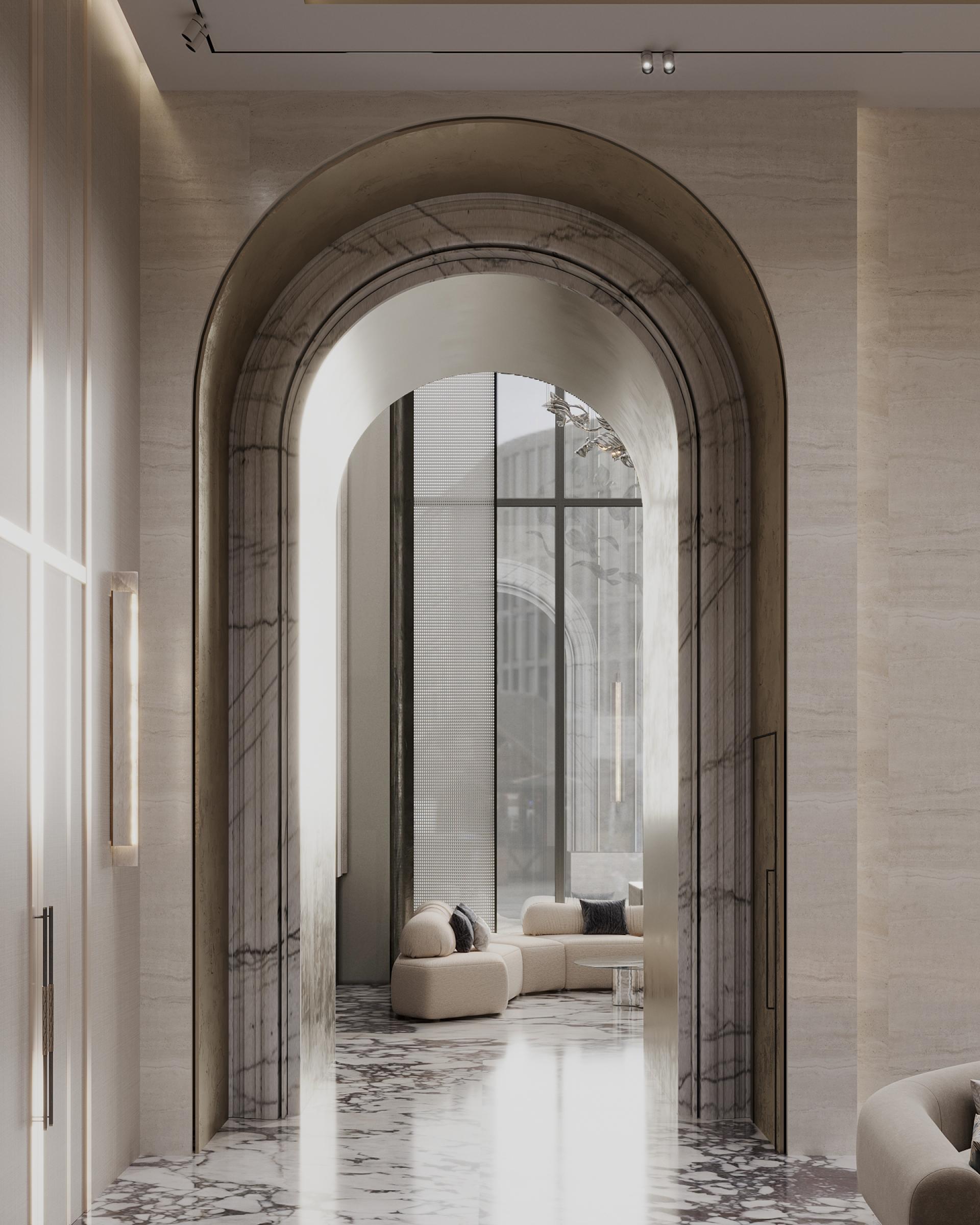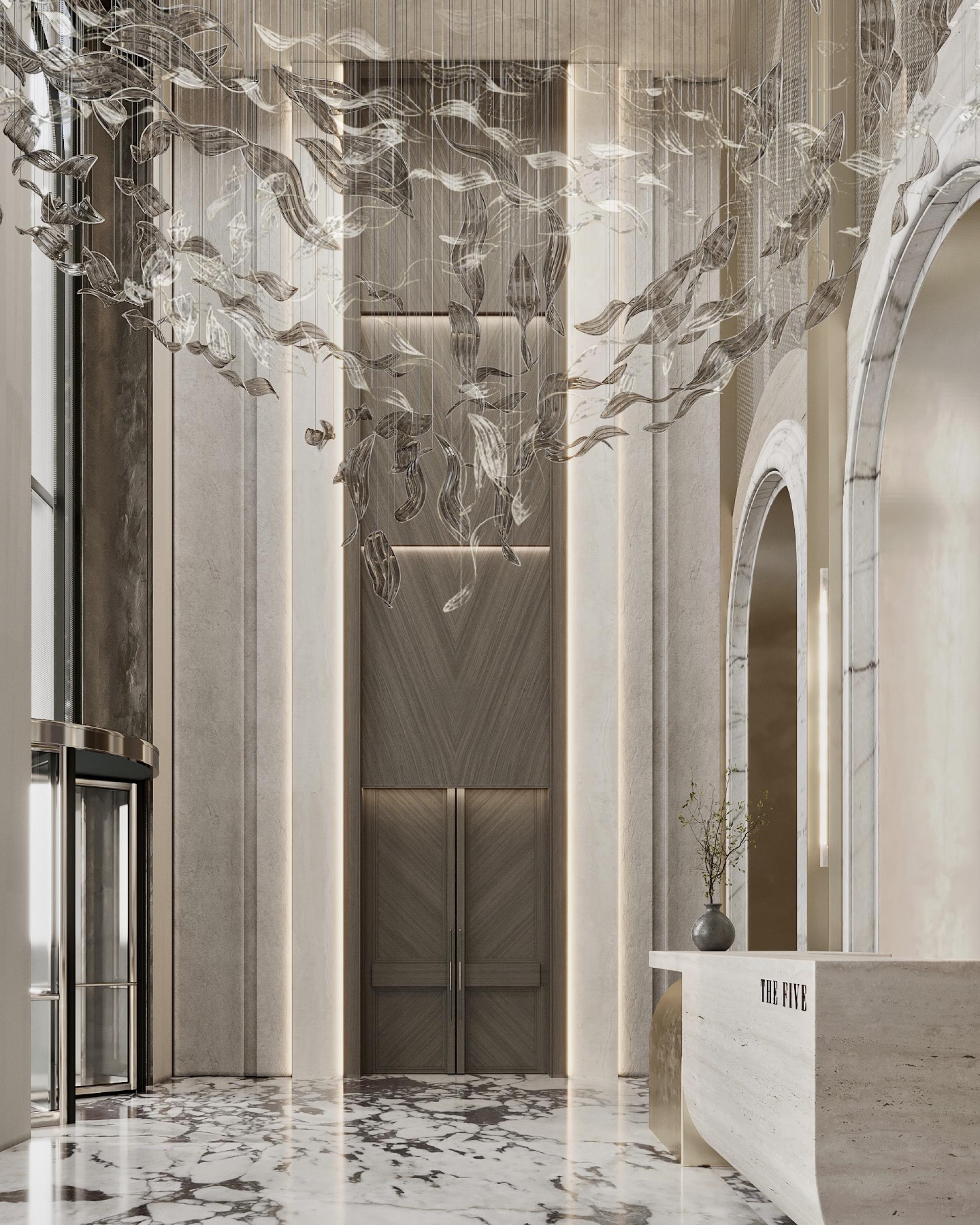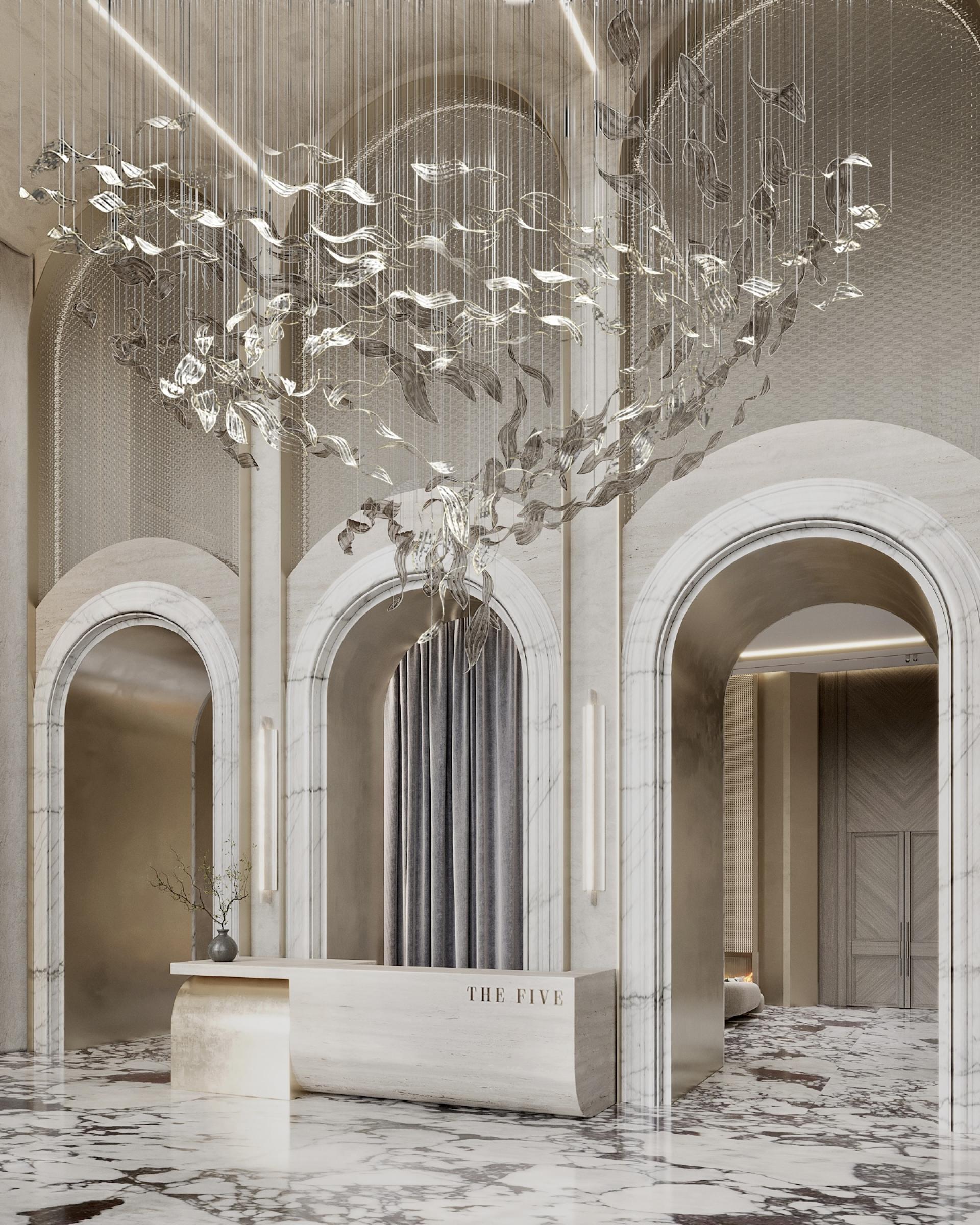 A bright wall made of stone, metal and brass, where five elements are depicted, attracts admiring glances: they symbolize a residential complex called “THE FIVE”, which looks very symbolic and cool. The huge stacked chandelier in the shape of a tornado also delights with their beauty. It turned out to be a very cool waiting area and a bright reception area. Here we have placed low modular sofas for comfortable waiting and relaxation of the guests. The space is decorated with stylish hanging paintings and a bright cascading solution on the walls with backlights. There is also the cozy nook with a travertine fireplace and brass arches. The floor is made of calacatta stone: we specially made it active so that dirt would not be visible. It went very neutrally on the walls and in the fireplace area.
