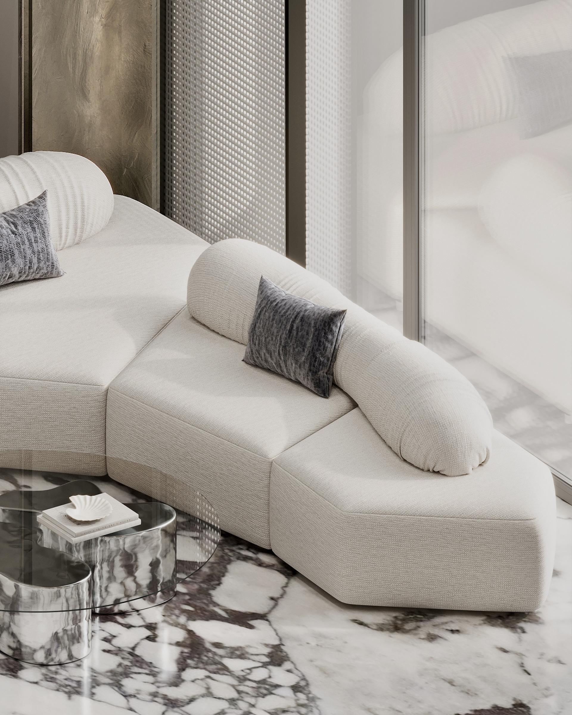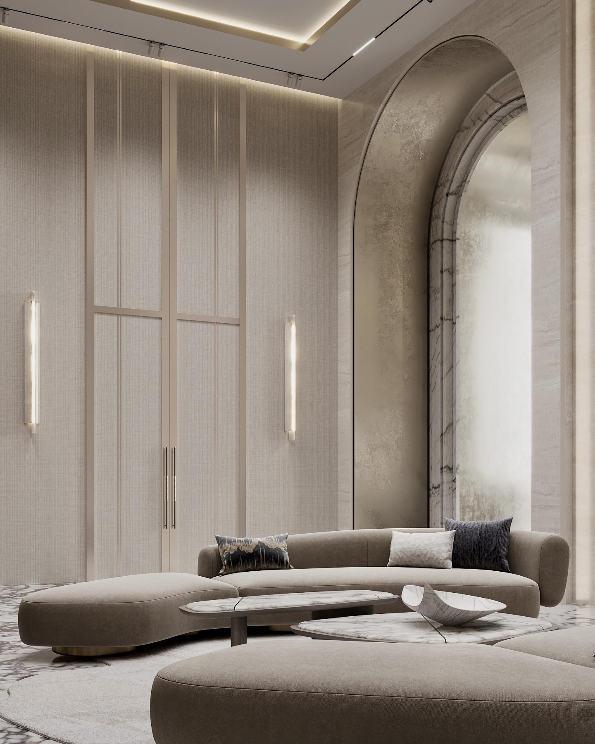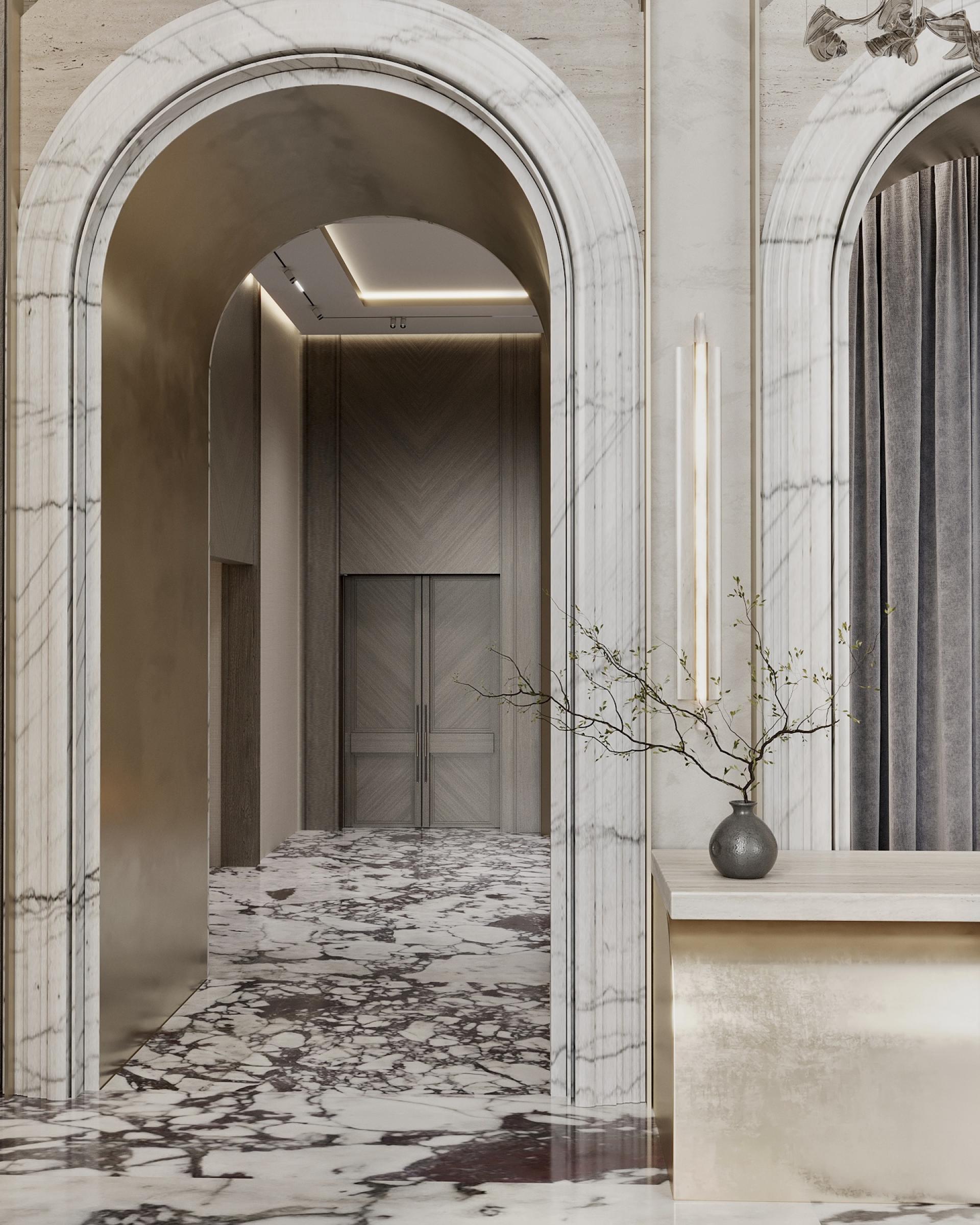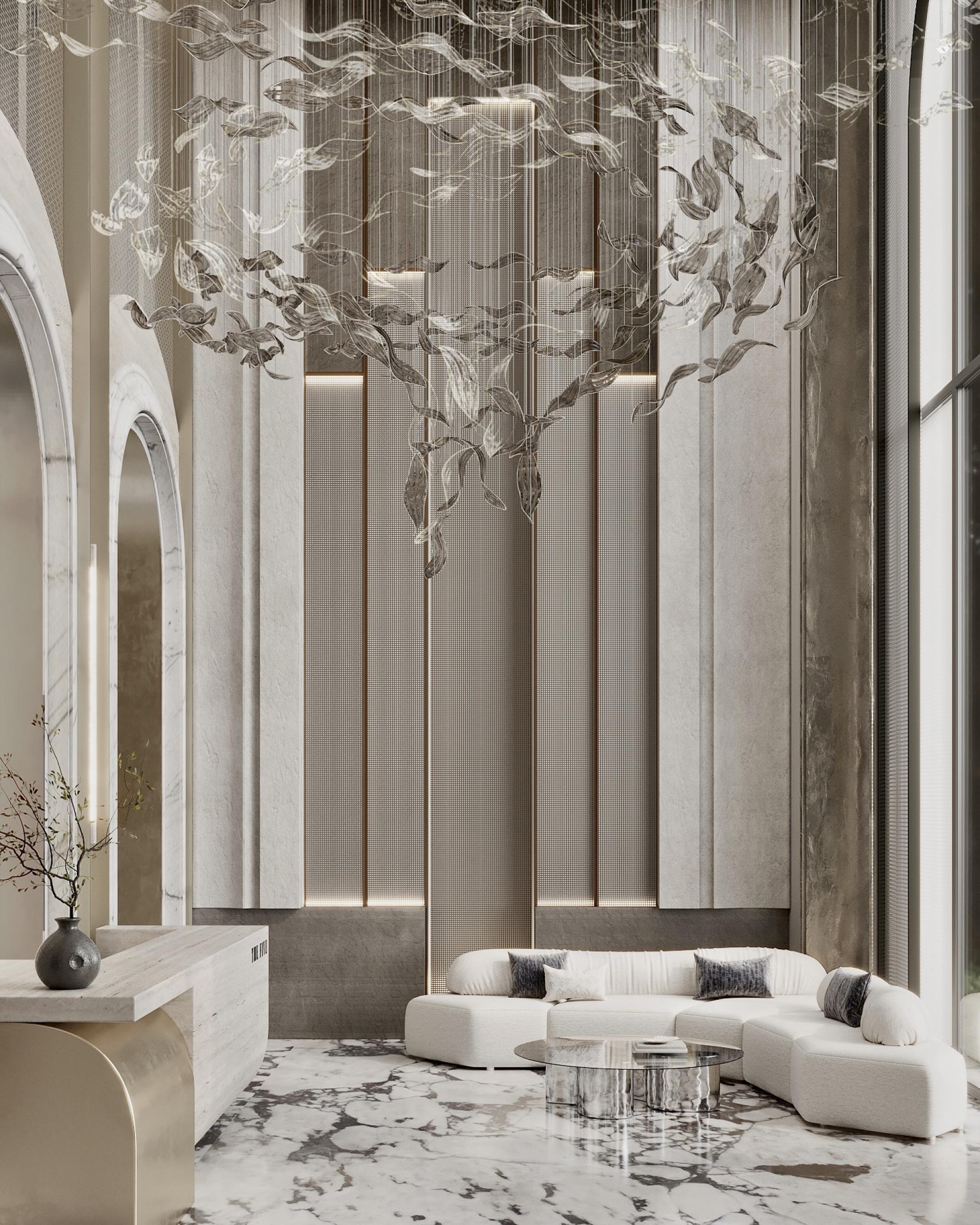 A bright wall made of stone, metal and brass, where five elements are depicted, attracts admiring glances: they symbolize a residential complex called “THE FIVE”, which looks very symbolic and cool. The huge stacked chandelier in the shape of a tornado also delights with their beauty. It turned out to be a very cool waiting area and a bright reception area. Here we have placed low modular sofas for comfortable waiting and relaxation of the guests. The space is decorated with stylish hanging paintings and a bright cascading solution on the walls with backlights. There is also the cozy nook with a travertine fireplace and brass arches. The floor is made of calacatta stone: we specially made it active so that dirt would not be visible. It went very neutrally on the walls and in the fireplace area.