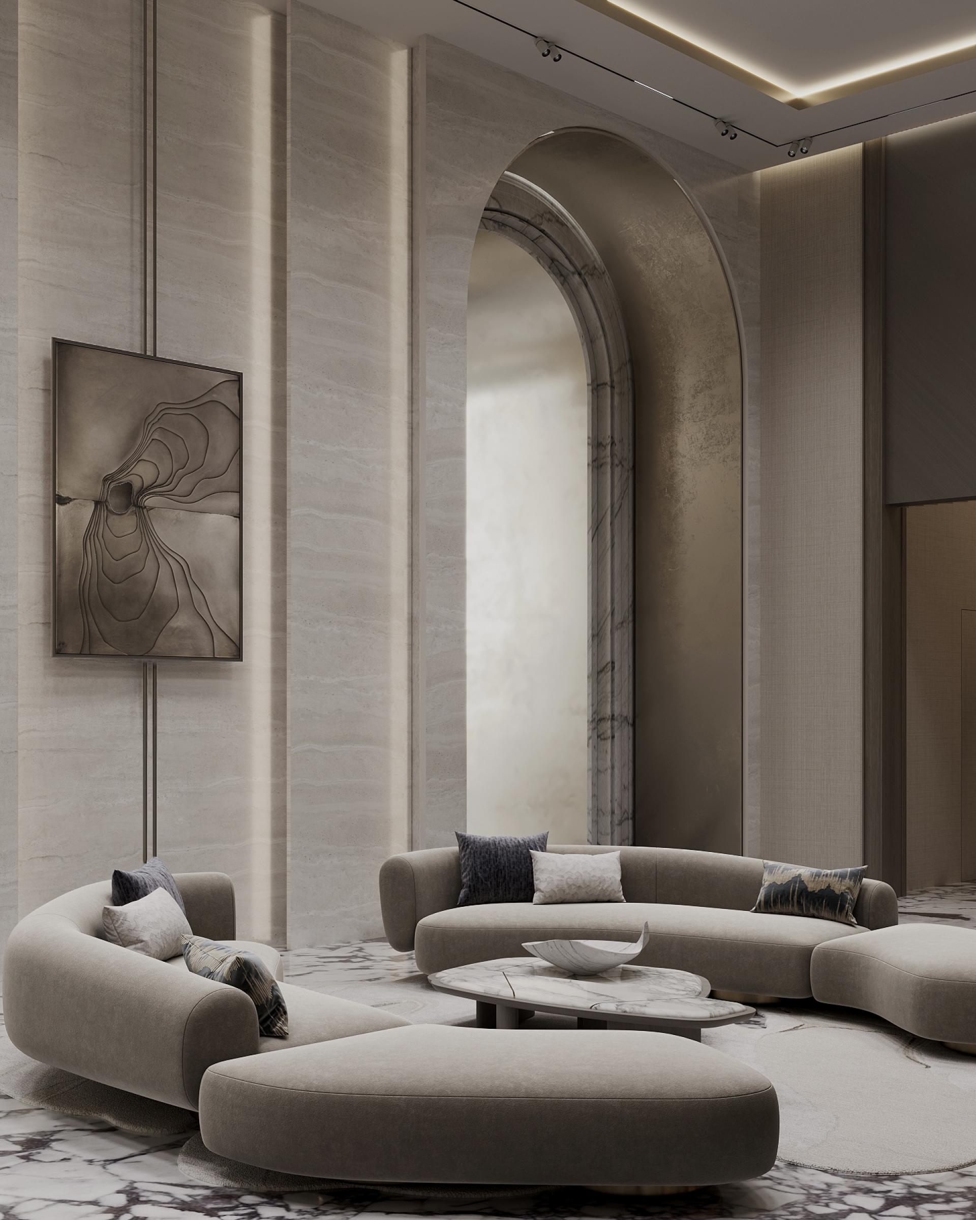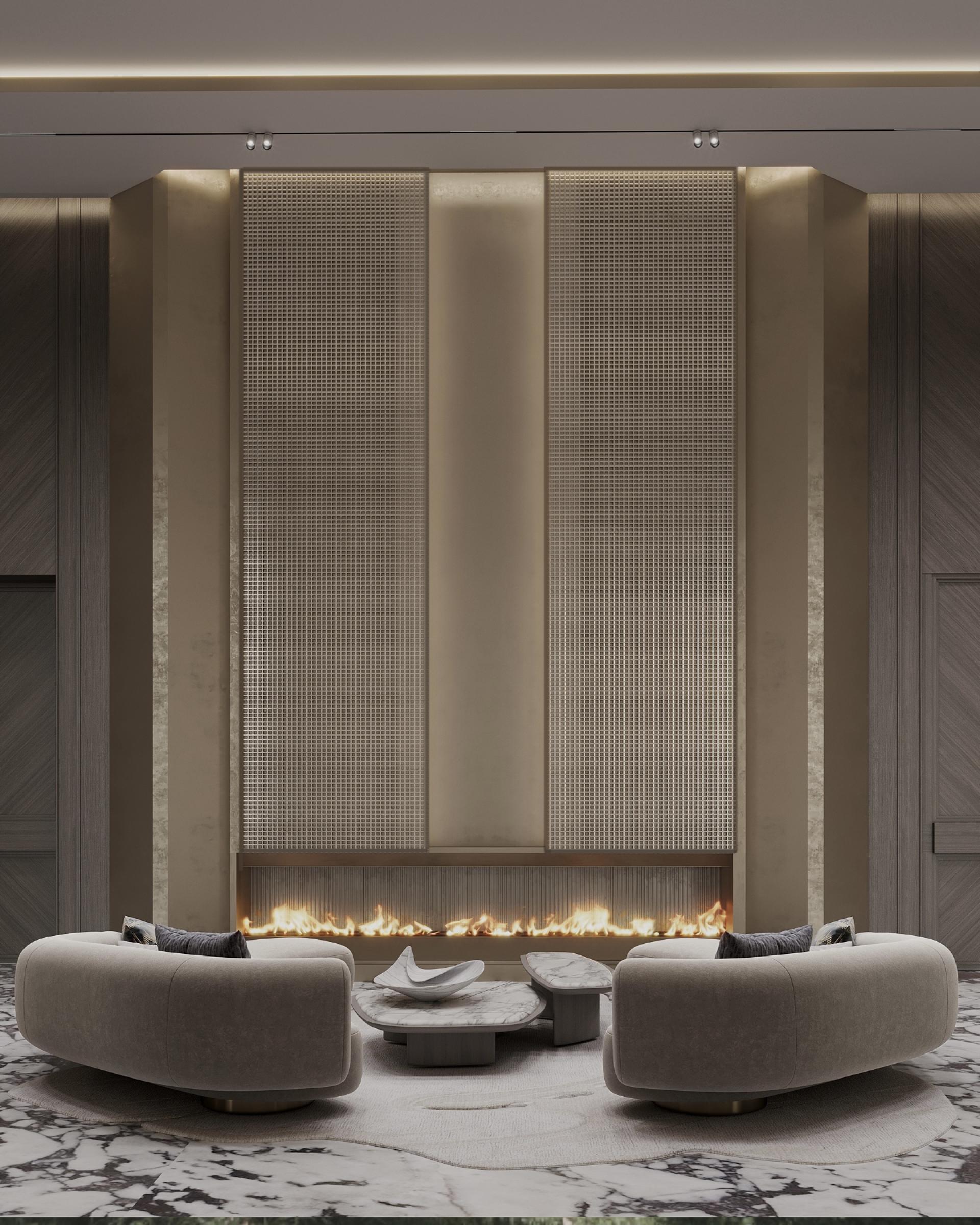 This spectacular 660 m² lobby was created for one of Moscow's premium residential complexes “THE FIVE”. The design project is made in a modern style. Finishing from natural wood and marble is combined with modern wall panels and laconic form of furniture and designer decorations. For guests and residents of the complex, a special space for informal or business communication with a fireplace and a soft lounge area has been created.
