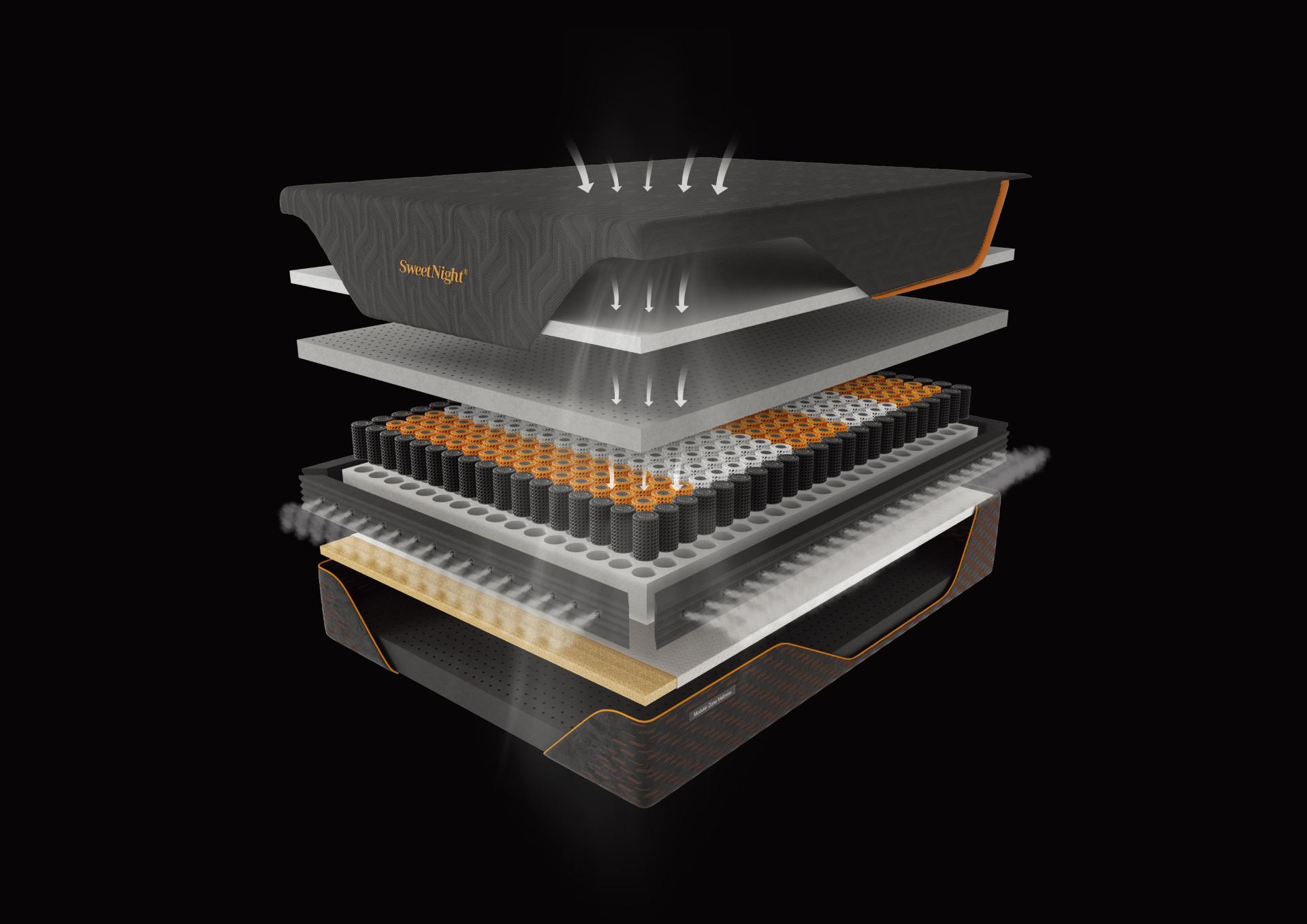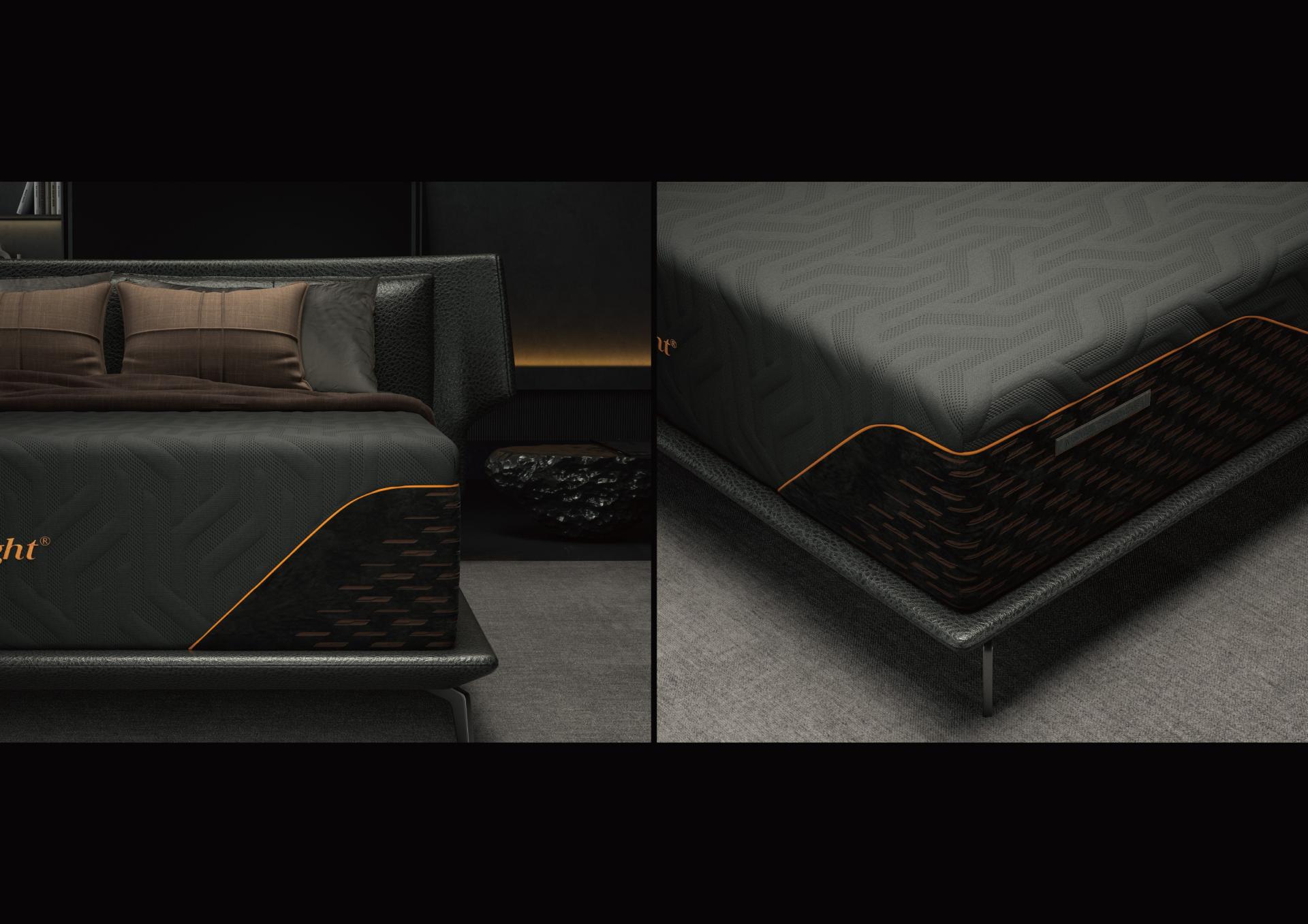 As for appearance design, the mattress draws inspiration from the streamlined silhouette of sports cars, featuring fluid geometric lines on both sides to give a strong sense of dynamism, presenting a distinctive futuristic style. The side lines and the front geometric patterns ingeniously integrate the brand name’s first letter (S), significantly enhancing brand recognition while serving as a practical breathable structure. In addition, the striking contrast between black and the brand’s signature orange further adds a high-tech aesthetic.