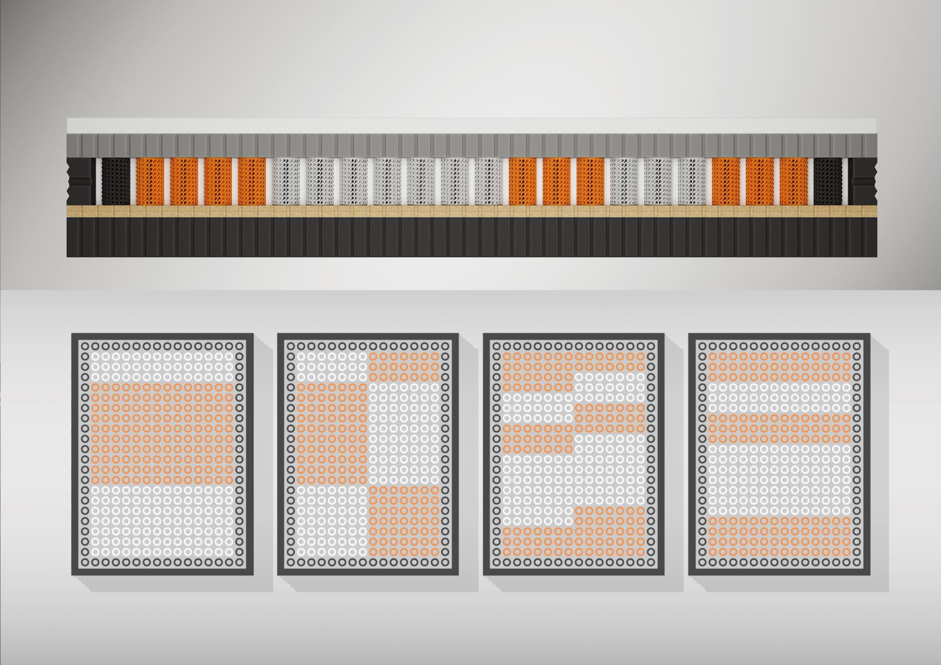 Structurally, each spring compartment is made from bio-based foam which is precisely cut and hollowed out; inside, an innovative 3D-printed lattice spring replaces traditional spring systems. The lattice spring provides three hollowed-out nested modules (soft, medium, and firm) and an optional ‘filling’ reinforcement module. Users can freely combine these modules to customize the mattress’s firmness level based on their preferences, enjoying a tailored sleeping experience.