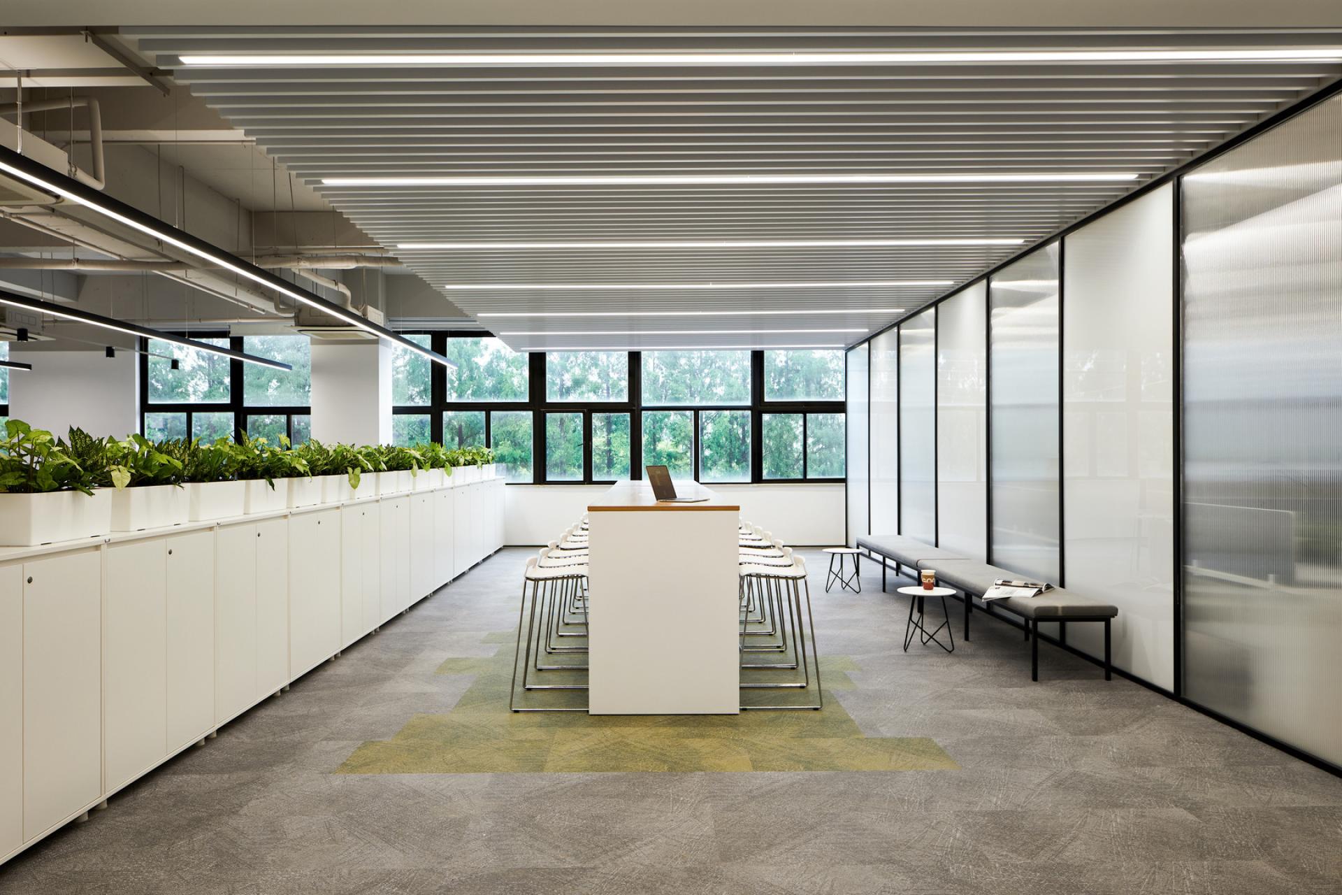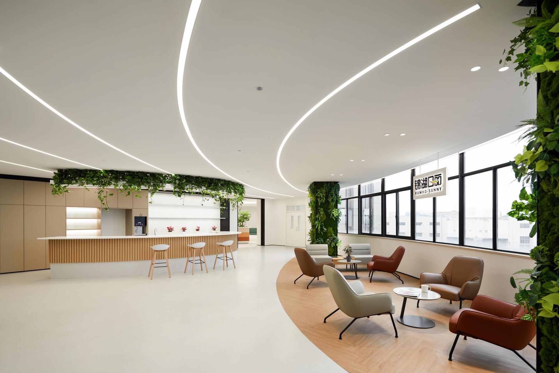 Based on the core concept of “Fluid Aesthetics in a Smart Eco-Office,” the 3F headquarters office of Kumho-Sunny on Humin Road in Shanghai blends tech-nology, sustainability, and nature. Inspired by the flow of molten polymers, curved elements shape the space and echo the brand’s industrial design DNA. Materials like recycled terrazzo and mycelium, paired with green walls, enhance the ecological feel. The layout includes open workspaces, meeting rooms, and lounges, with flexible circulation and acoustic design balancing openness and privacy. It’s a modern office where natural ecology meets technological ele-gance.