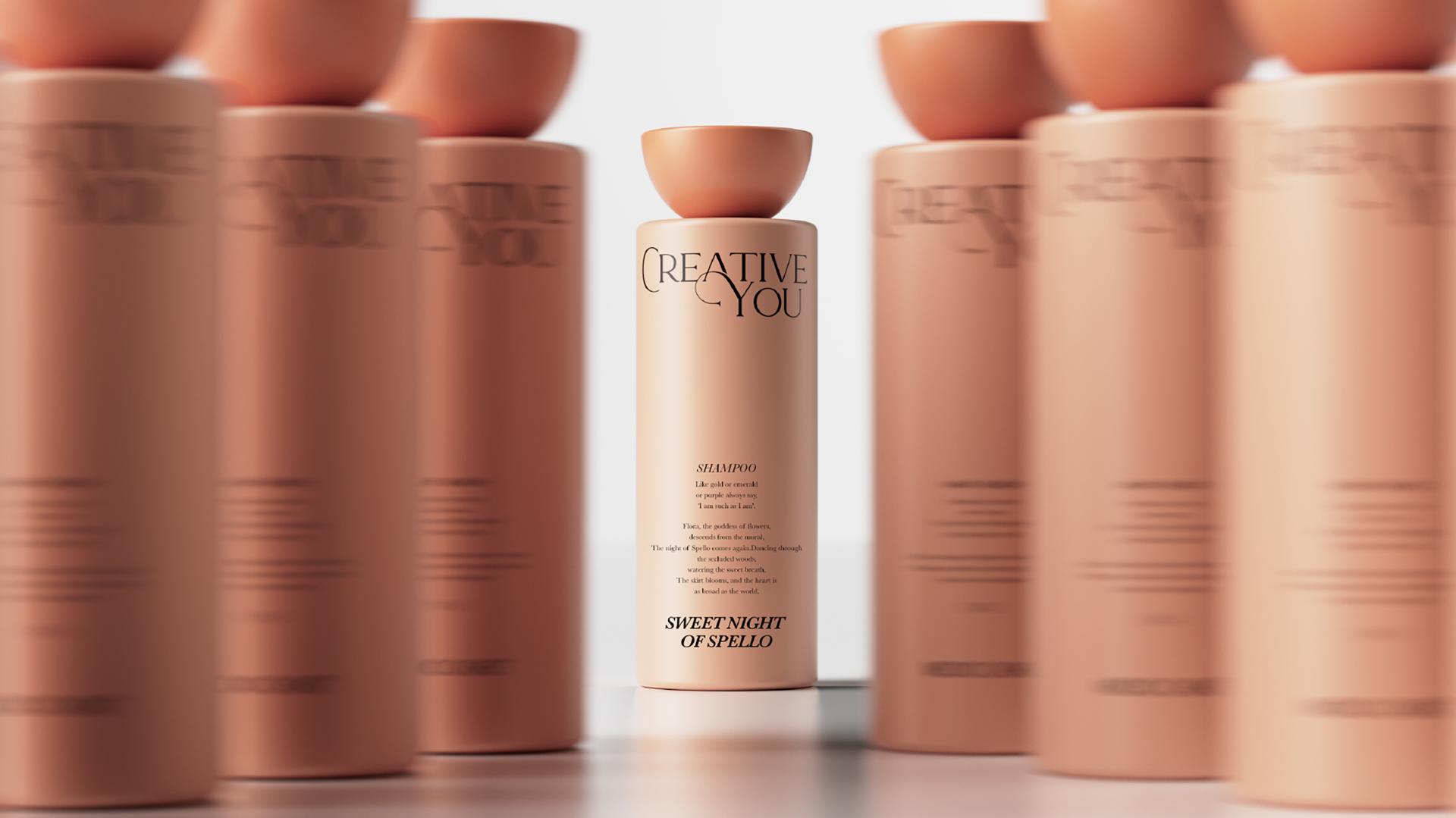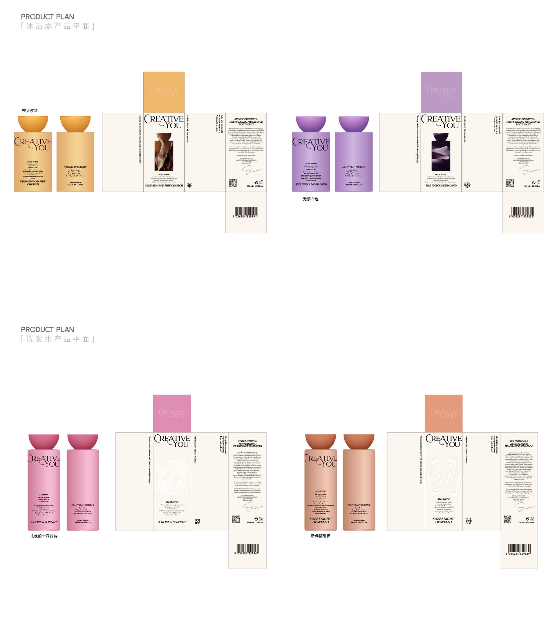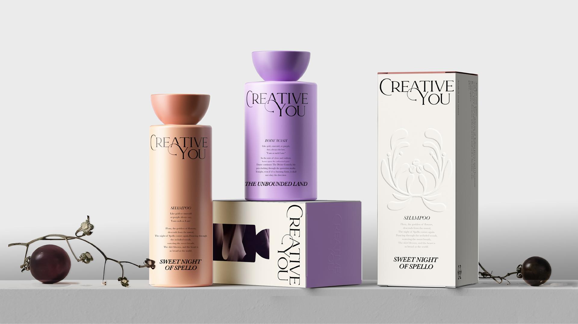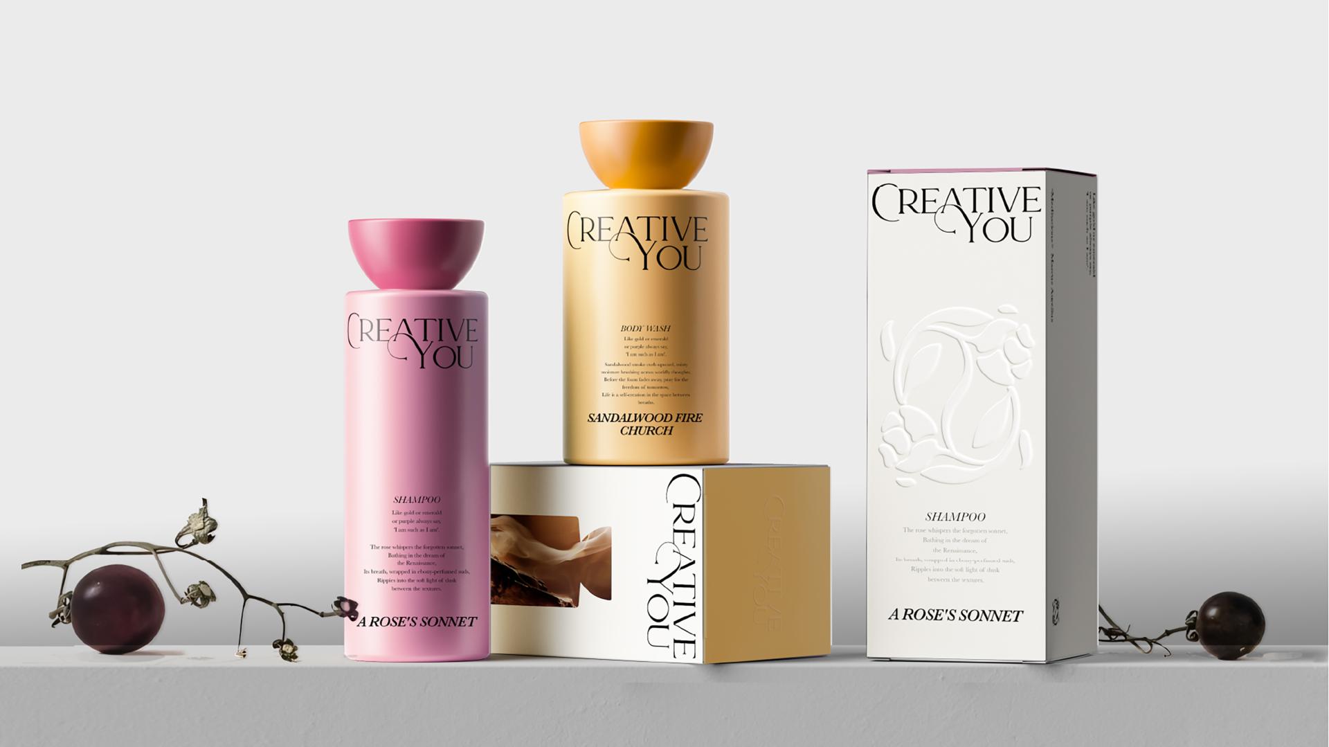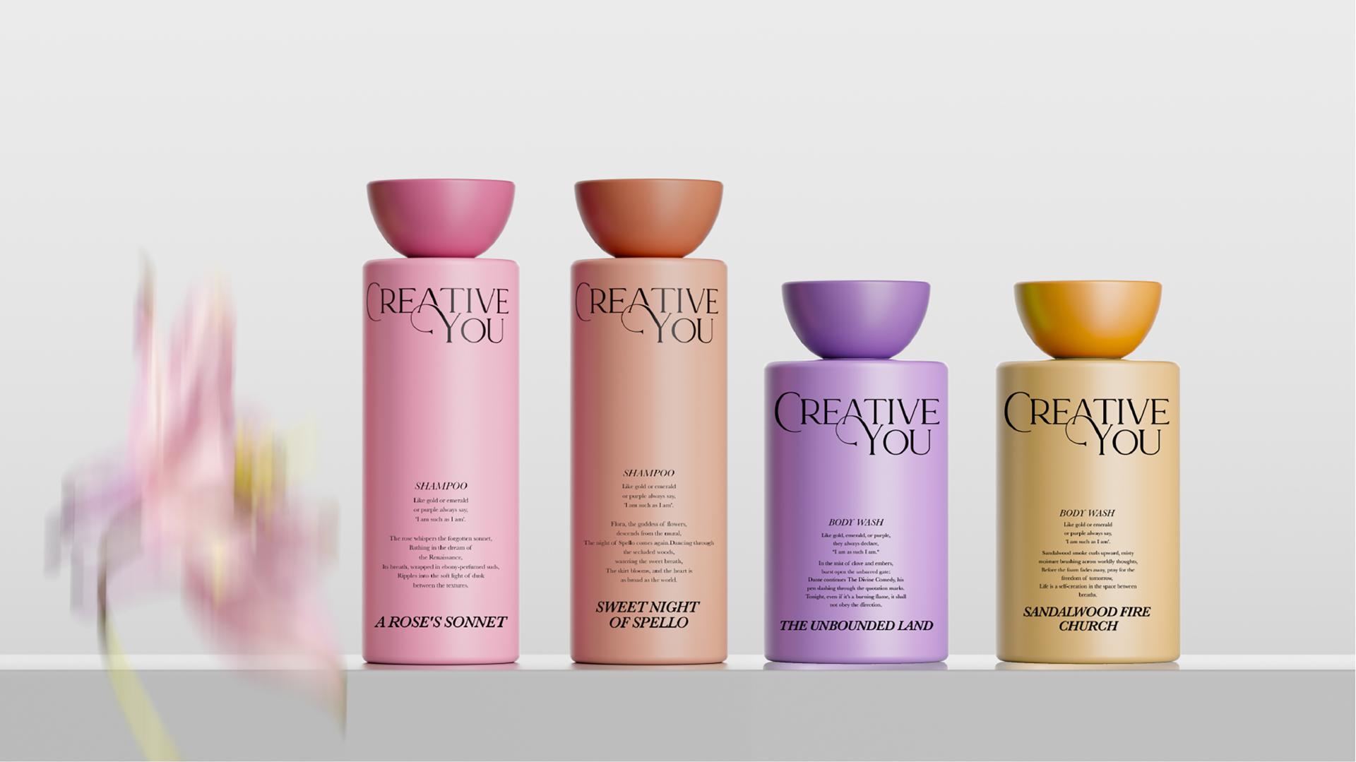 Creative You employs an artistic serif font for the brand name—slender in form with smoothly extending lines—that echoes the curves of the bottle cap. This retains classical elegance while embodying modern refinement. Creative You adopts a well-ordered layout, with the main visual area afforded ample negative space. This allows the poetic product names to emerge as emotional triggers, stirring sensory associations in users. Additionally, Creative You excels in interactive experience: its hemispherical cap conforms to the natural curve of the hand, enabling easy opening even when the surface is wet; its bottle body uses recyclable material that balances durability with eco-friendliness, complemented by a finely finished matte surface that delivers a mild, smooth touch. Generally, Creative You achieves an elegant balance between form, color, touch, and functionality in its overall design, elevating daily grooming into an anticipated aesthetic experience.
