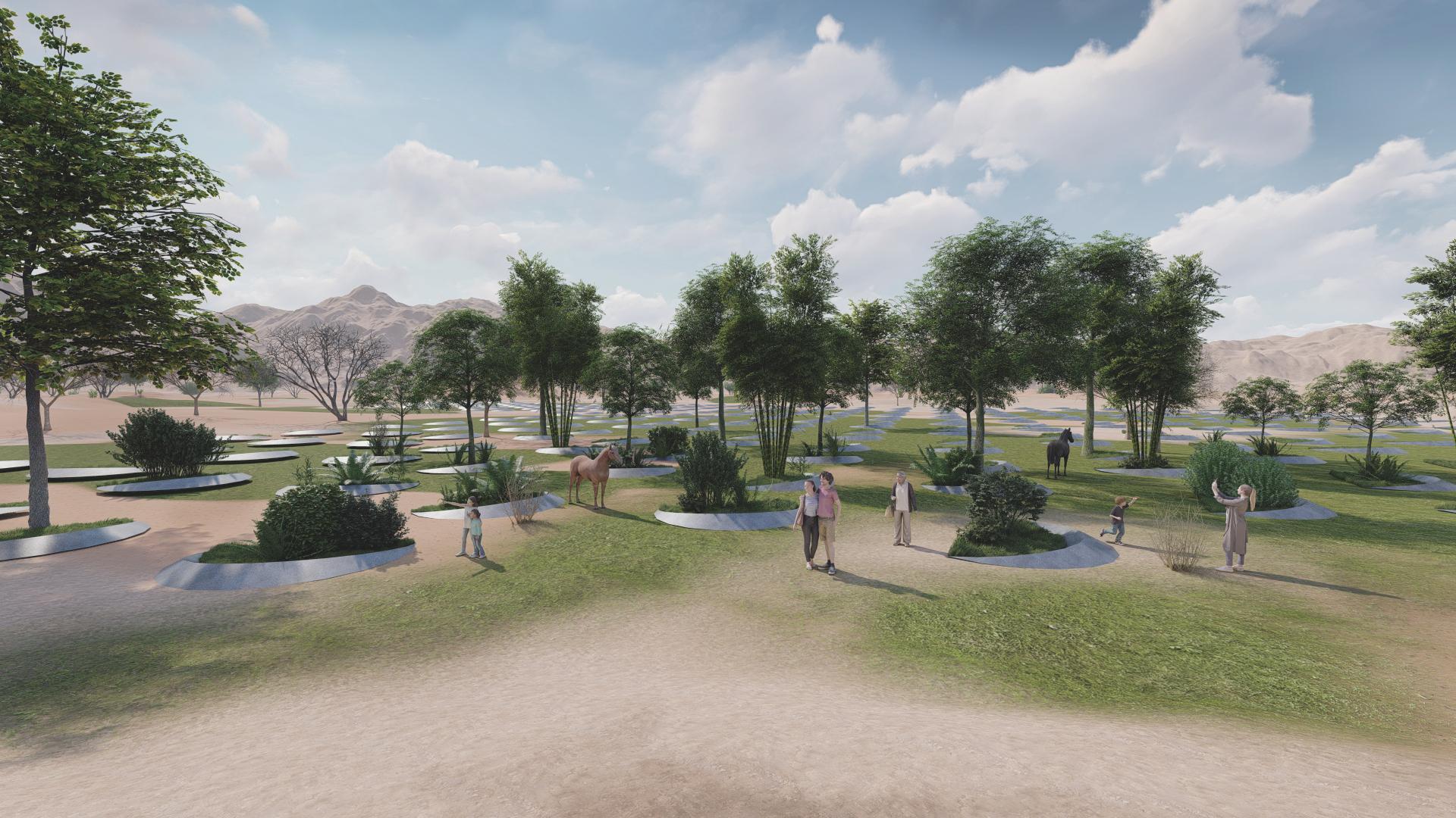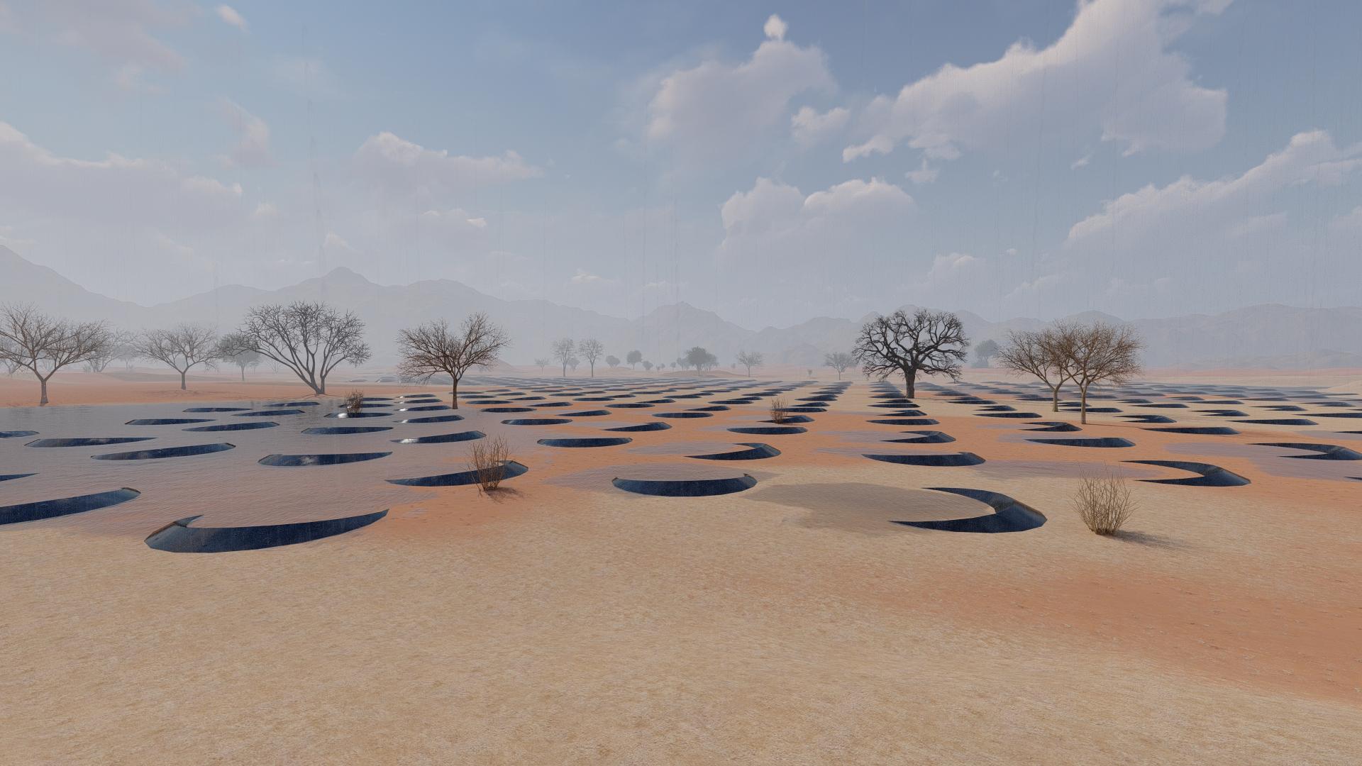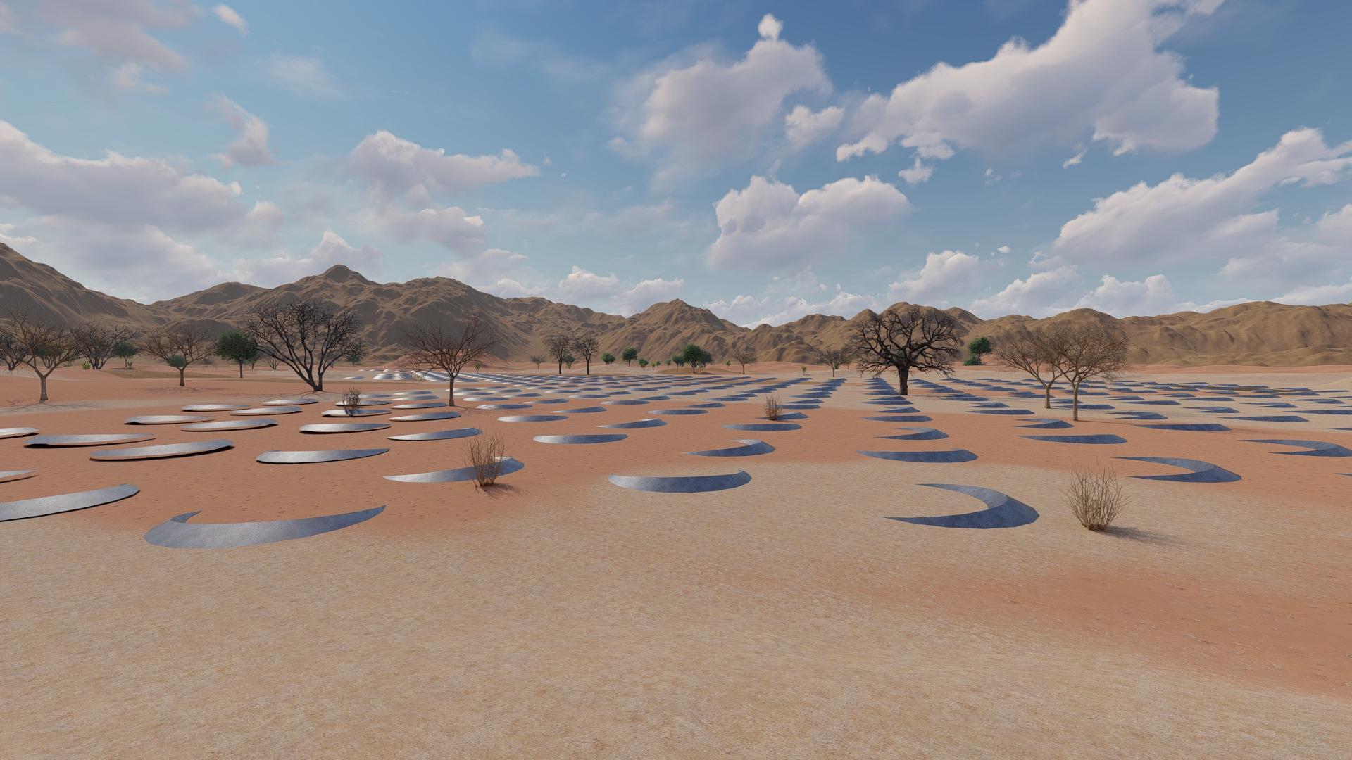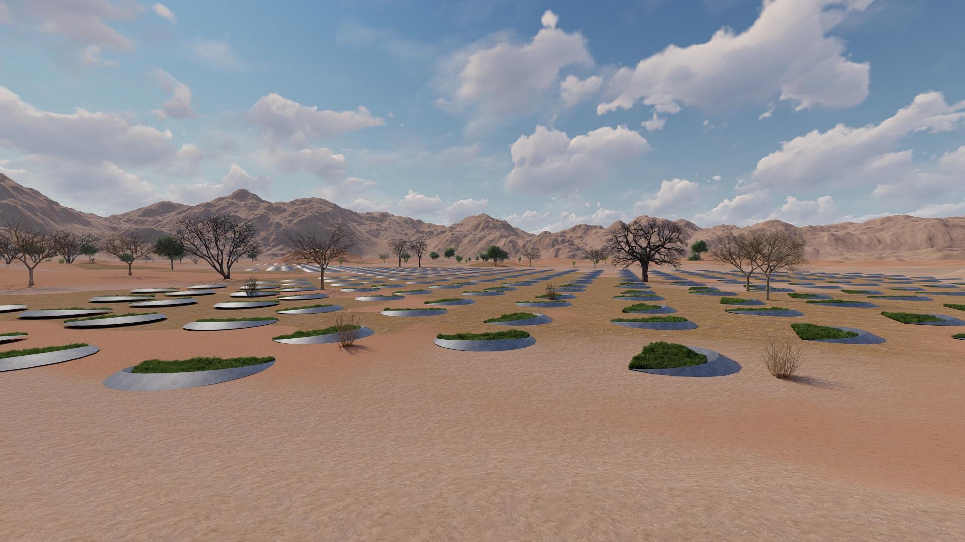 The EcoMoon breaks this cycle. Each installation is shaped like a raised crescent, its edge acting as a retaining wall, with soil heaped behind to form a bund around the curve. These bunds can be planted with trees or shrubs, while grasses are sown between and around the shallow basins. Over time, this vegetation transforms the site into a living desert oasis, where grasses anchor the soil, shrubs provide shelter, and trees bring shade and habitat.