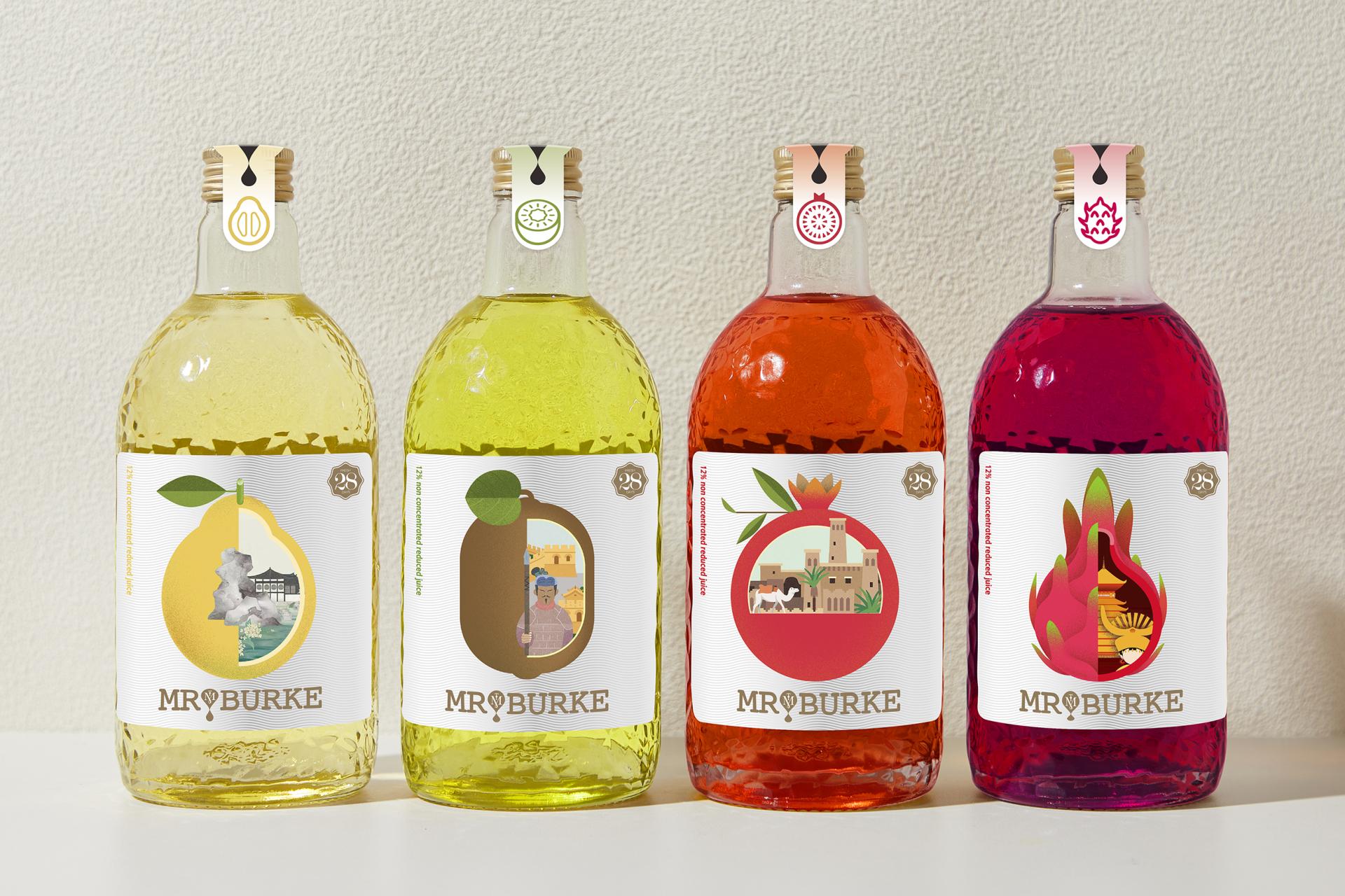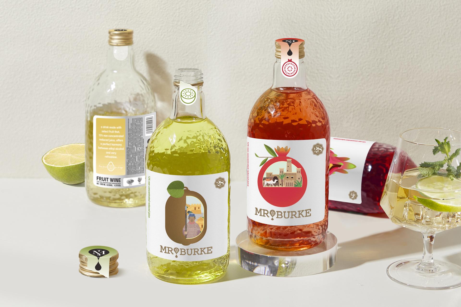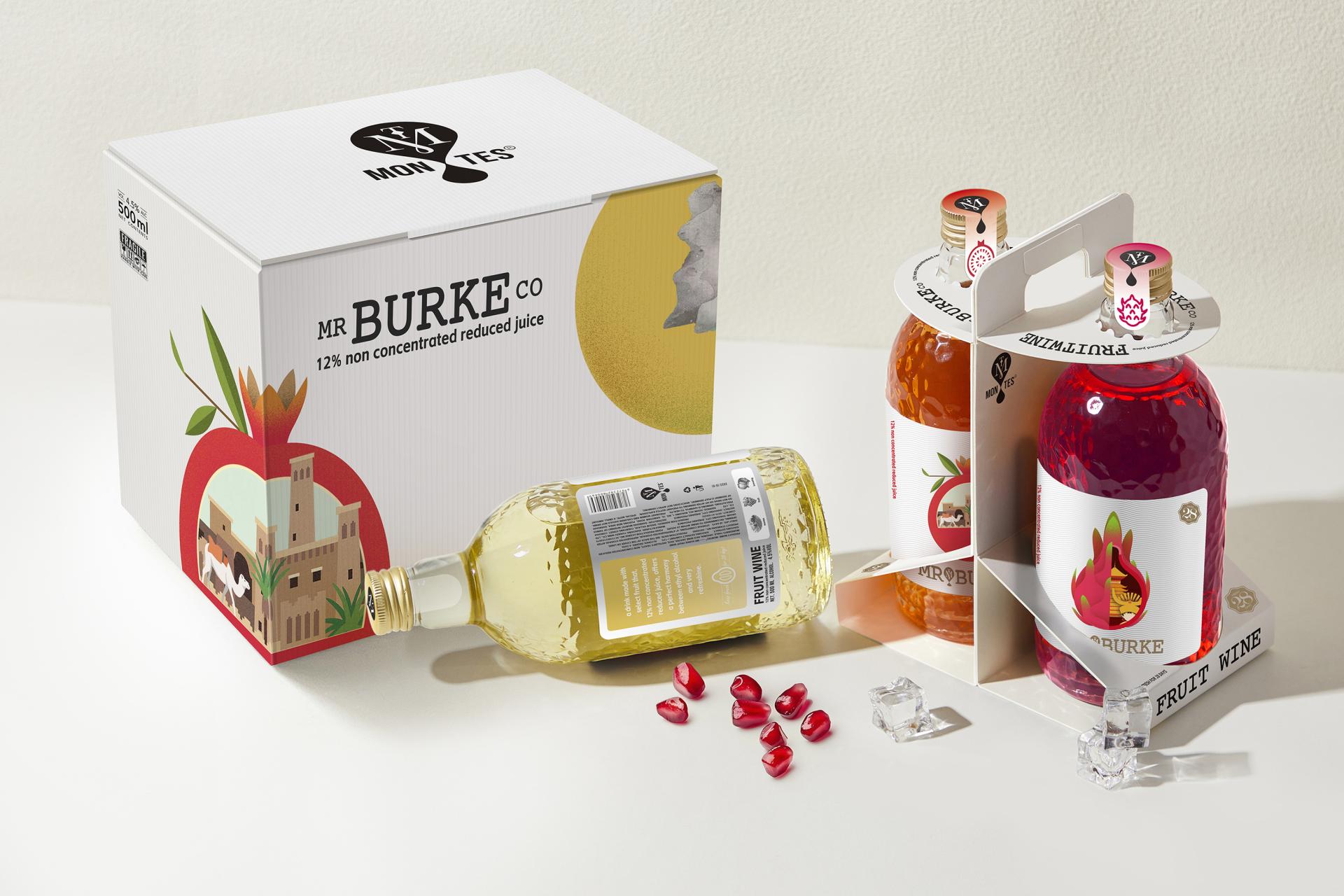 The Mr. Burke fruit wine series, part of the MONTES brand, is conceived for expressive, free-spirited young adults. Drawing from the traditions and landscapes of renowned fruit-growing regions, each label distills the character of its fruit into clean, geometric compositions, interlacing them with motifs from surrounding nature and local heritage. The result is a contemporary decorative language enriched with cultural resonance.